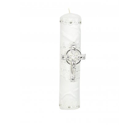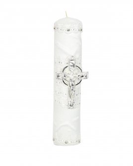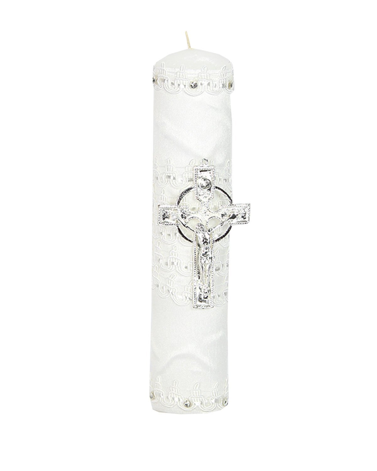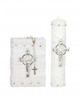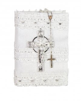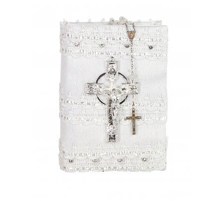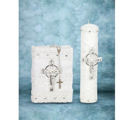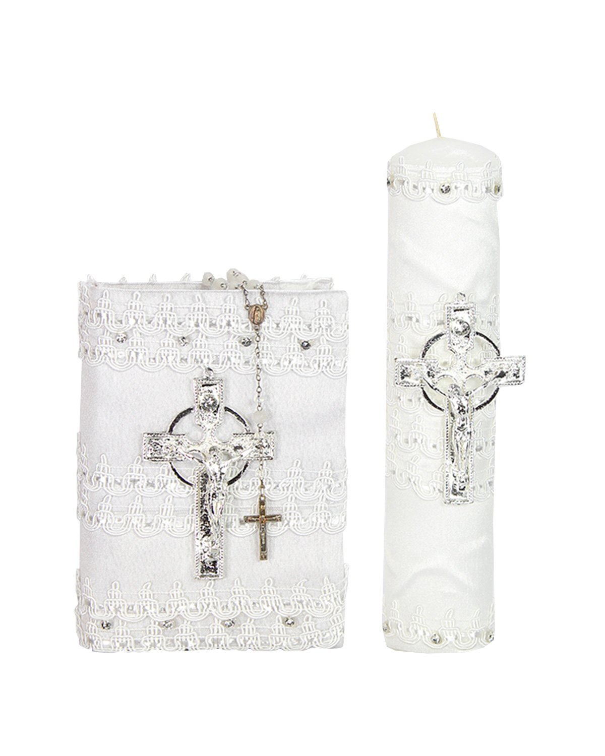 The First Communion Kit, Style David, includes a bible, a candle, and a rosary, all decorated with a crucifix, embroidery in the center and along the edges, and rhinestones.