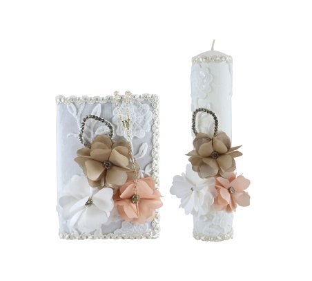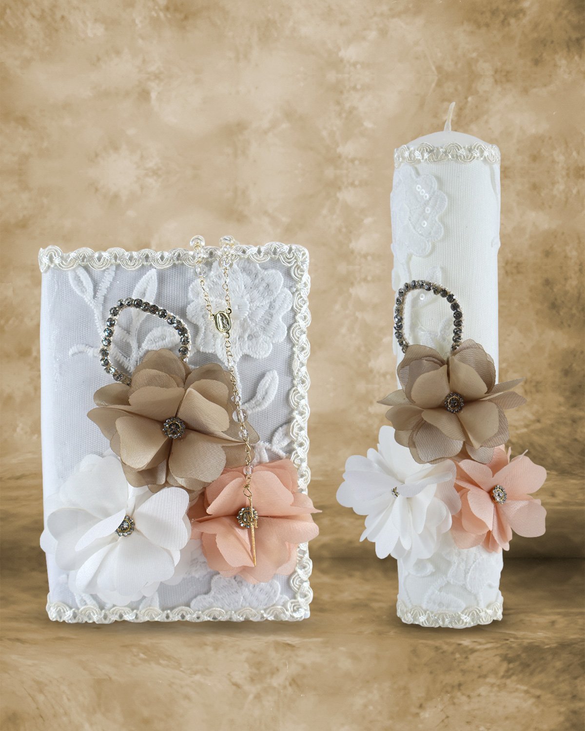 The First Communion Kit Style Arisbeth is the perfect complement to celebrate this special sacrament. This kit includes a beautiful Bible, a candle, and a rosary, all designed with care and attention to detail. Both the Bible and the candle are adorned with delicate embroidery and 3D flowers in khaki and rosewood tones, enhanced with pearls and rhinestones, along with a light embroidery on the edges that adds a touch of elegance.