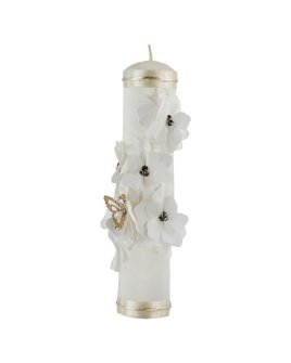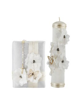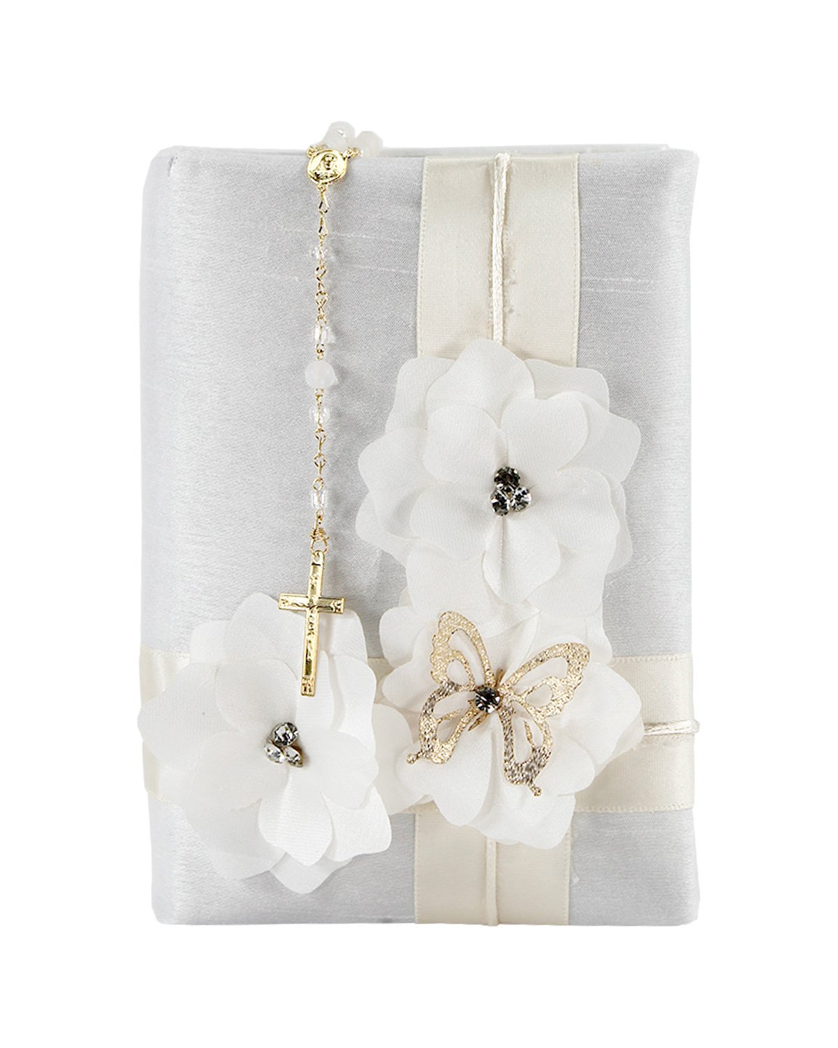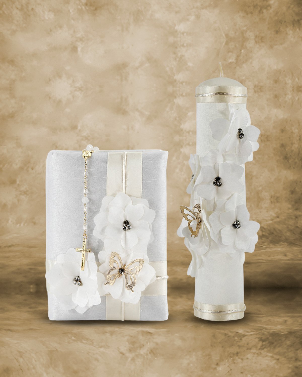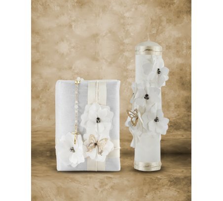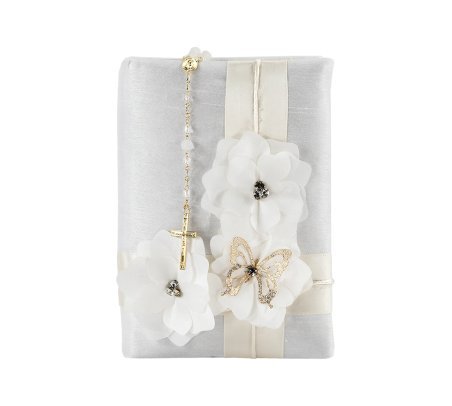 Frida First Communion Kit with Candle, Bible, and Rosary, decorated with shantung, ribbons, 3D flowers, beads, and pearls.