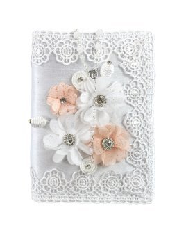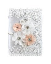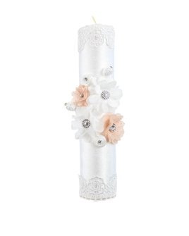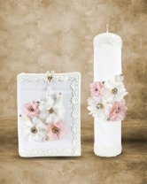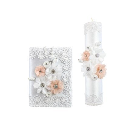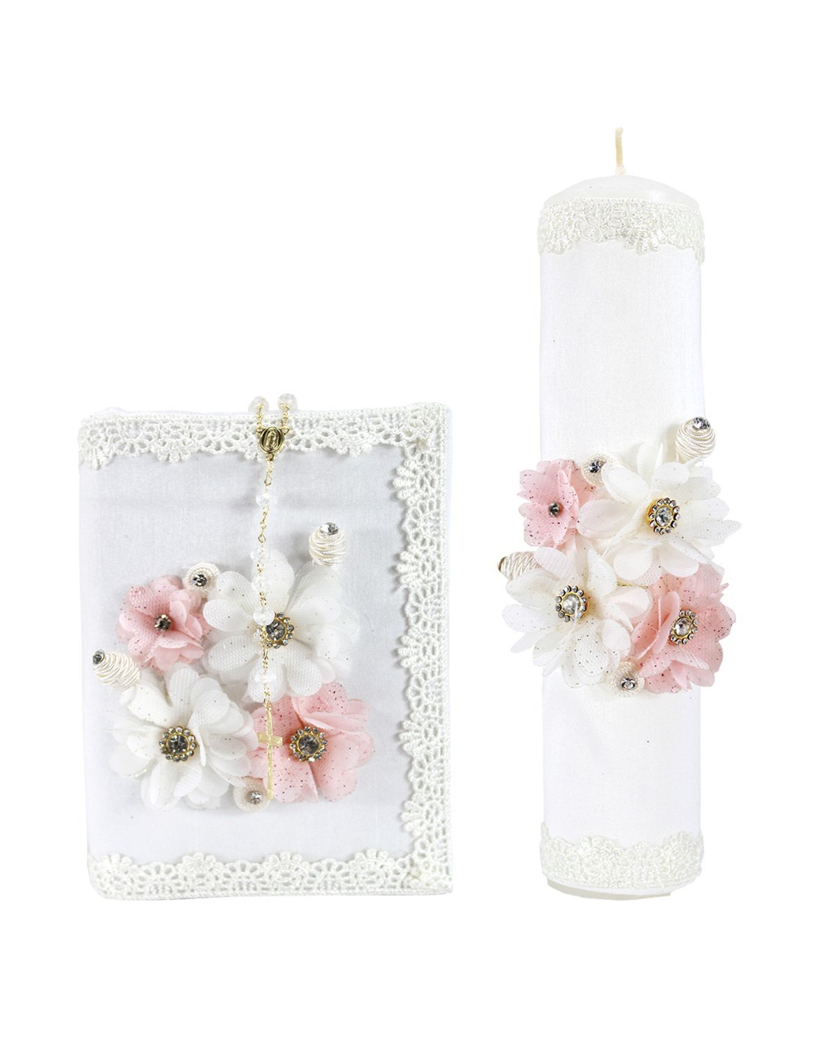 Arely First Communion Kit with Candle, Bible, and Rosary, decorated with shantung, ribbons, 3D flowers, beads, pearls, and edge embroidery.