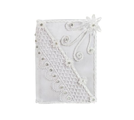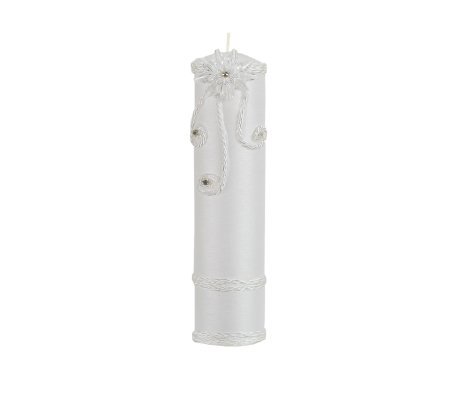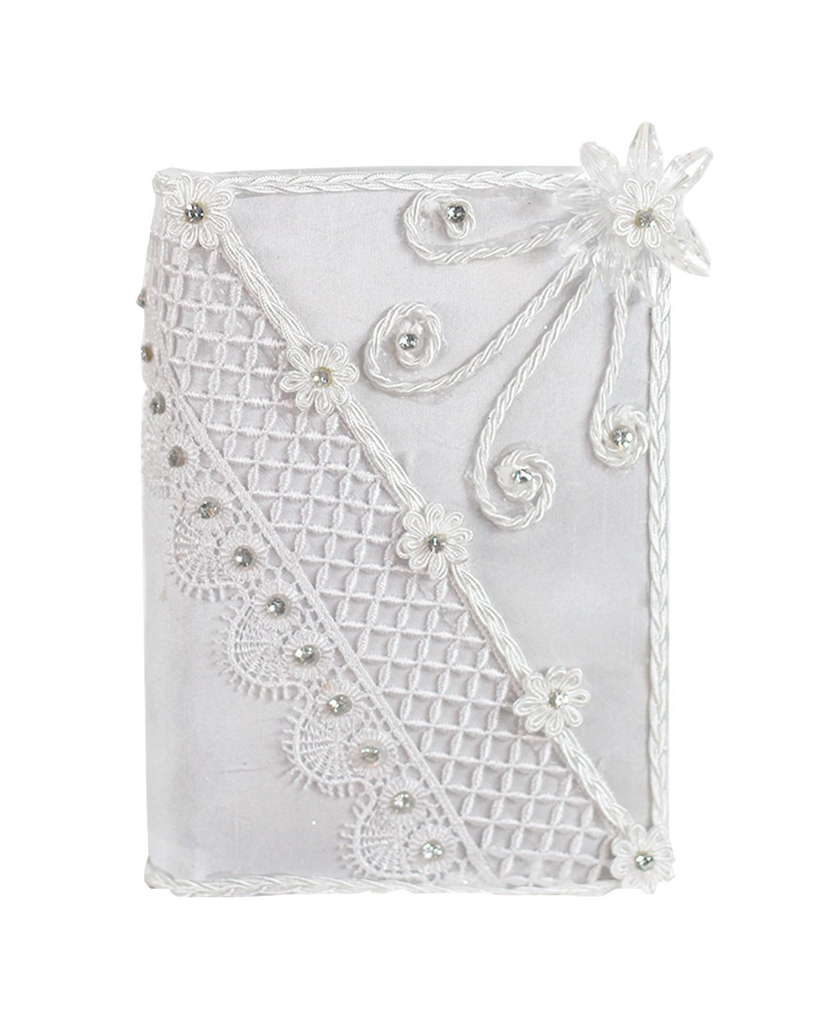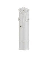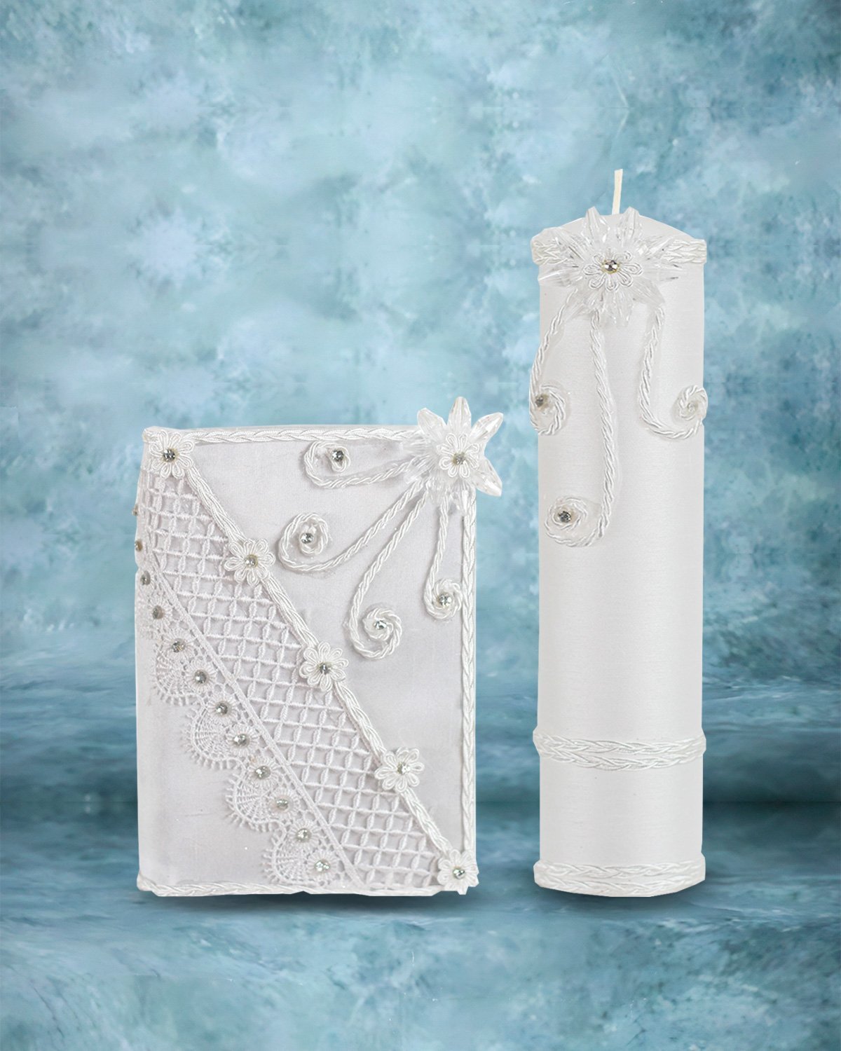 The First Communion Kit, Style Briana, is a charming set that includes a Bible, a candle, and a rosary adorned with embroidery, 3D flowers, ribbons, pearls, and rhinestones. It is perfect to accompany this special moment.