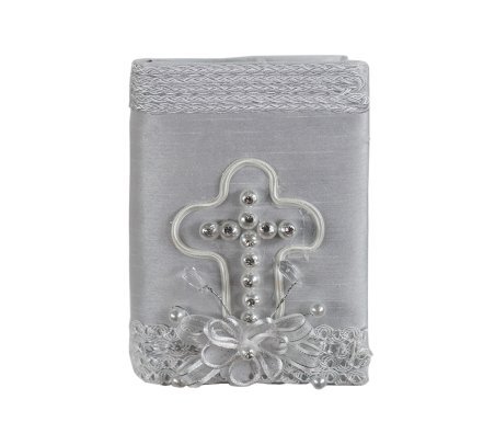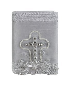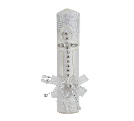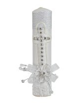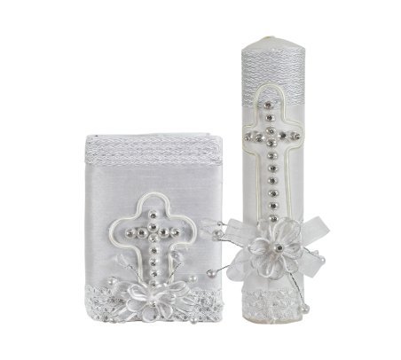 Silvia Style First Communion Kit: A complete set including a Bible, candle, and rosary, adorned with an elegant pearl and rhinestone cross, a 3D flower, and detailed embroidery. The perfect gift to celebrate this sacred and special moment.