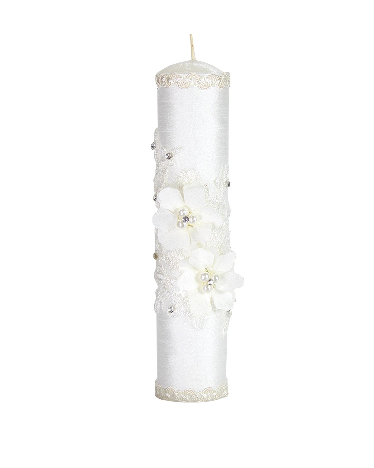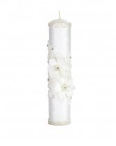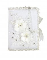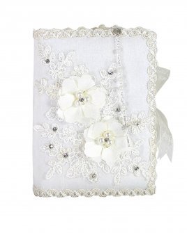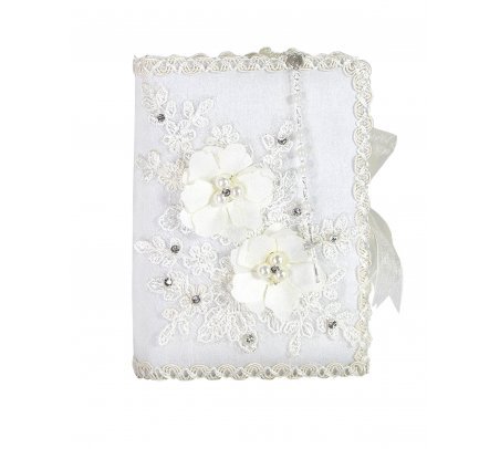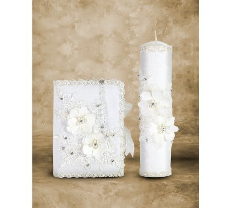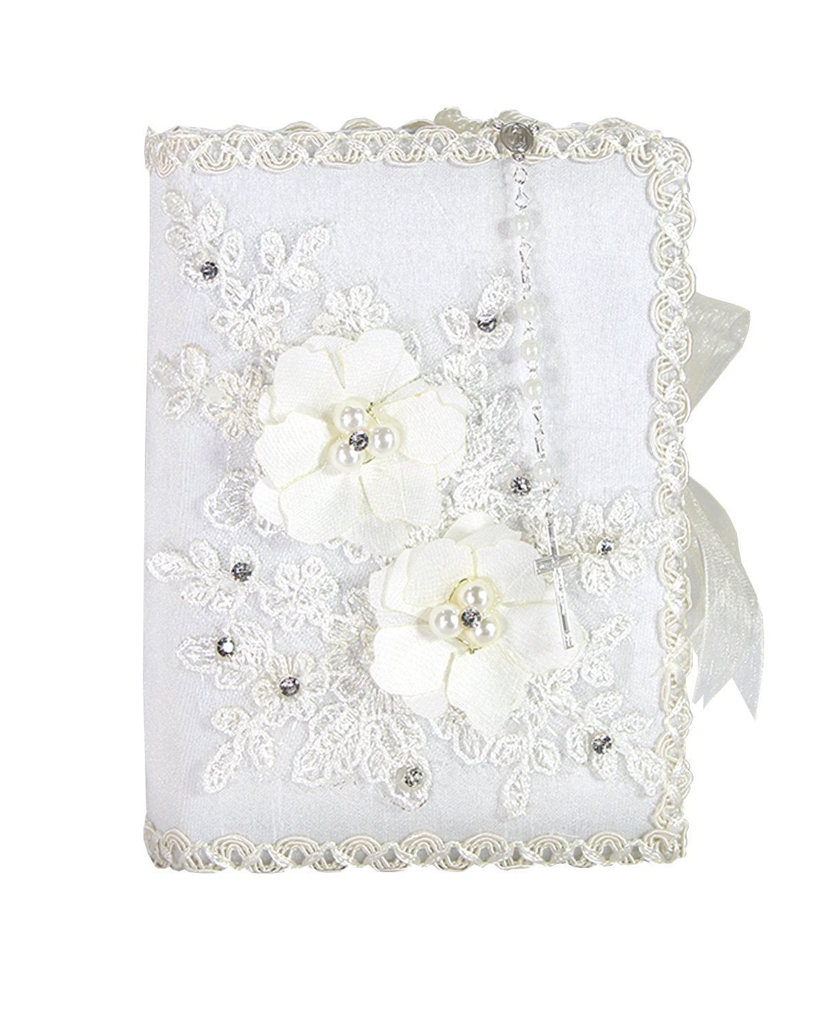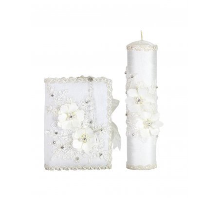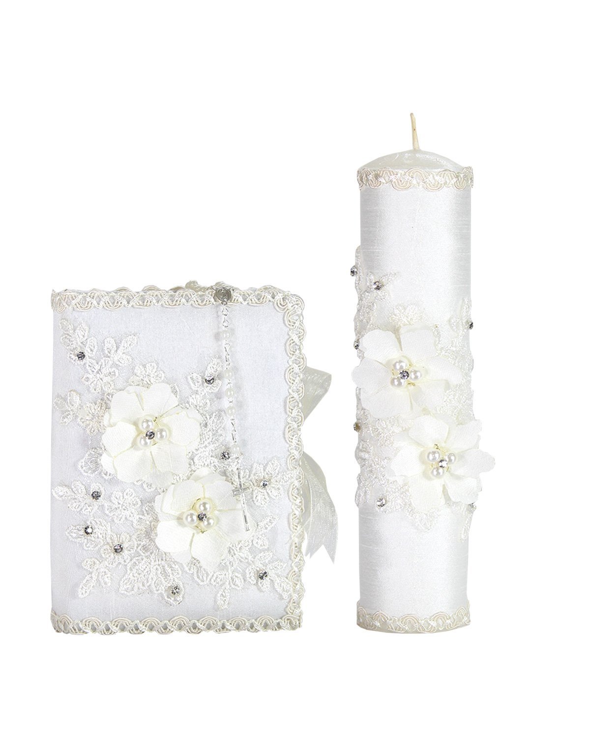 he First Communion Kit, style Alexa, is a charming set that includes a Bible, a candle, and a rosary decorated with 3D flowers, embroidery, and rhinestones, perfect to accompany this special moment.