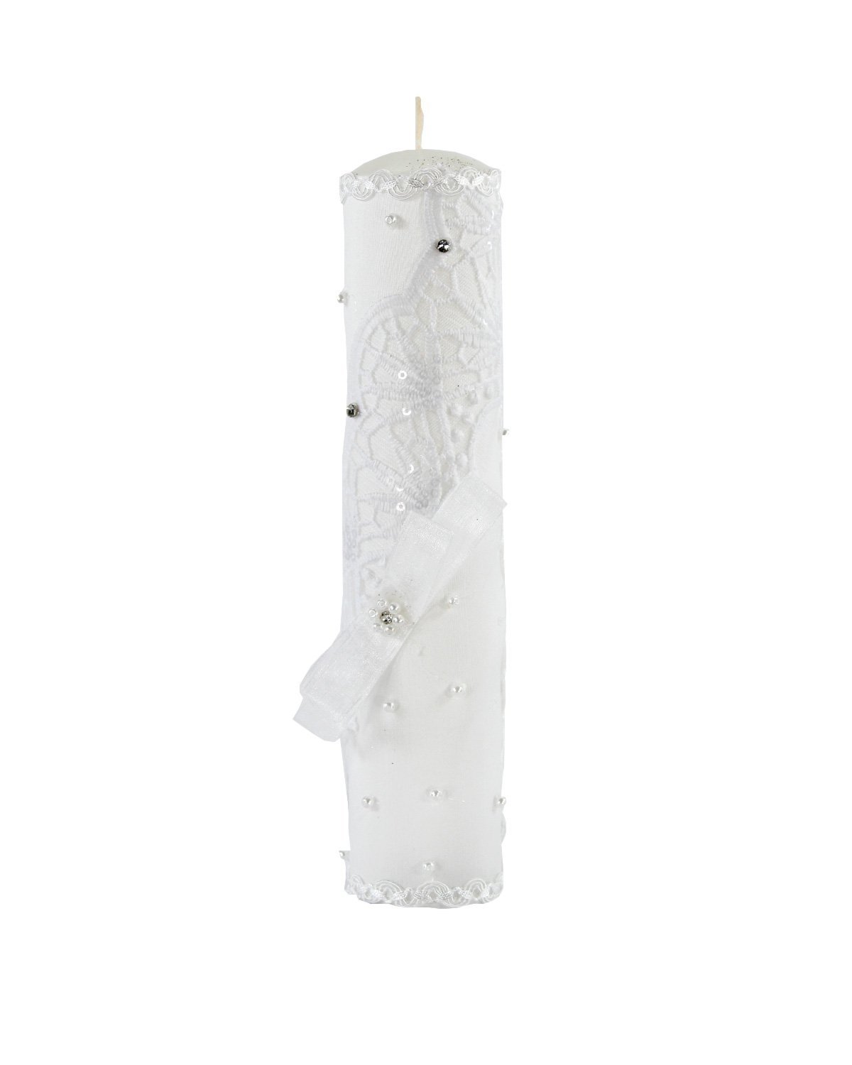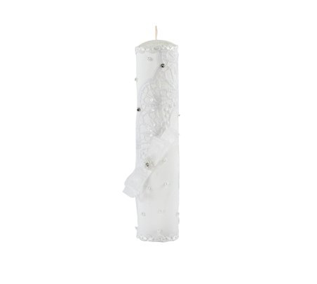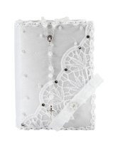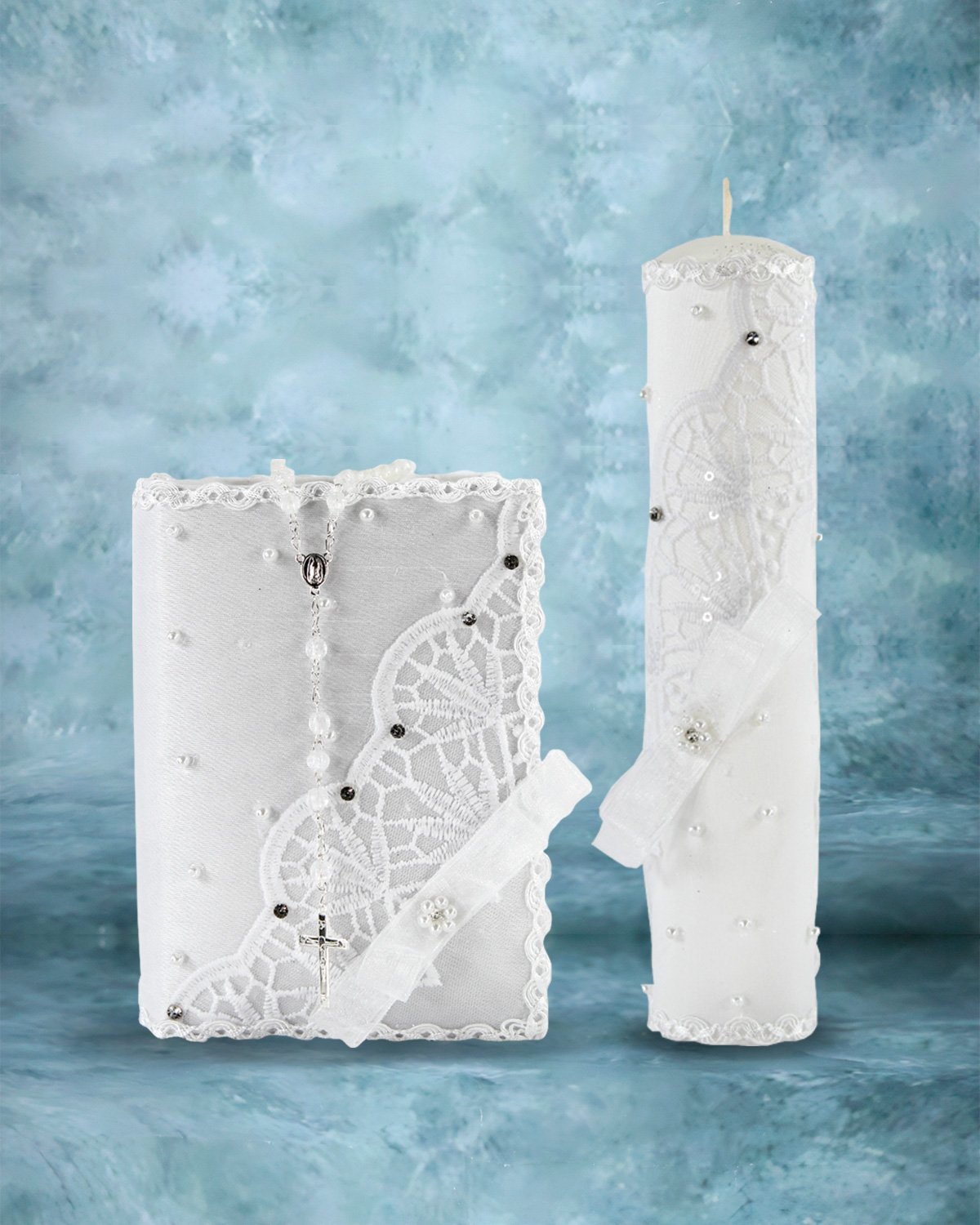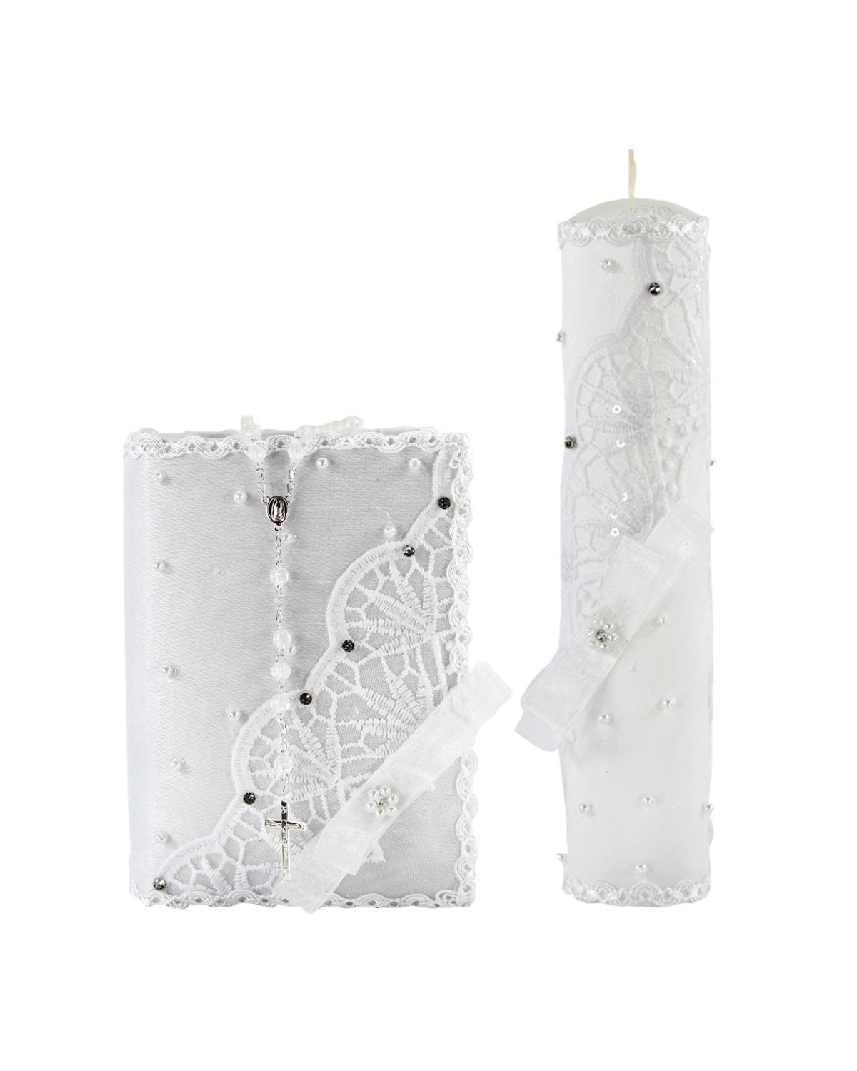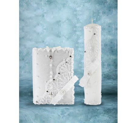 The First Communion Kit in Kathy Style features a bible and a candle adorned with delicate embroidery of flowers and leaves, as well as a ribbon bow and embroidered details on the edges. The addition of pearls and gemstones adds an elegant touch to this set, perfect for such a meaningful occasion.