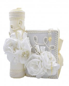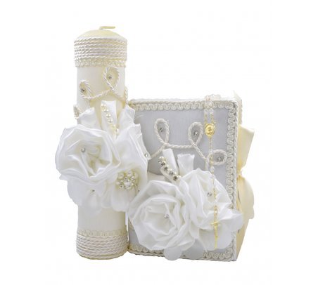 The Lucy Style First Communion Kit features a beautifully decorated bible and candle, adorned with a bouquet of 3D flowers, pearls, and gemstones, embroidery on the edges, and a side bow to close the bible. It's the perfect complement for such a special occasion like First Communion.