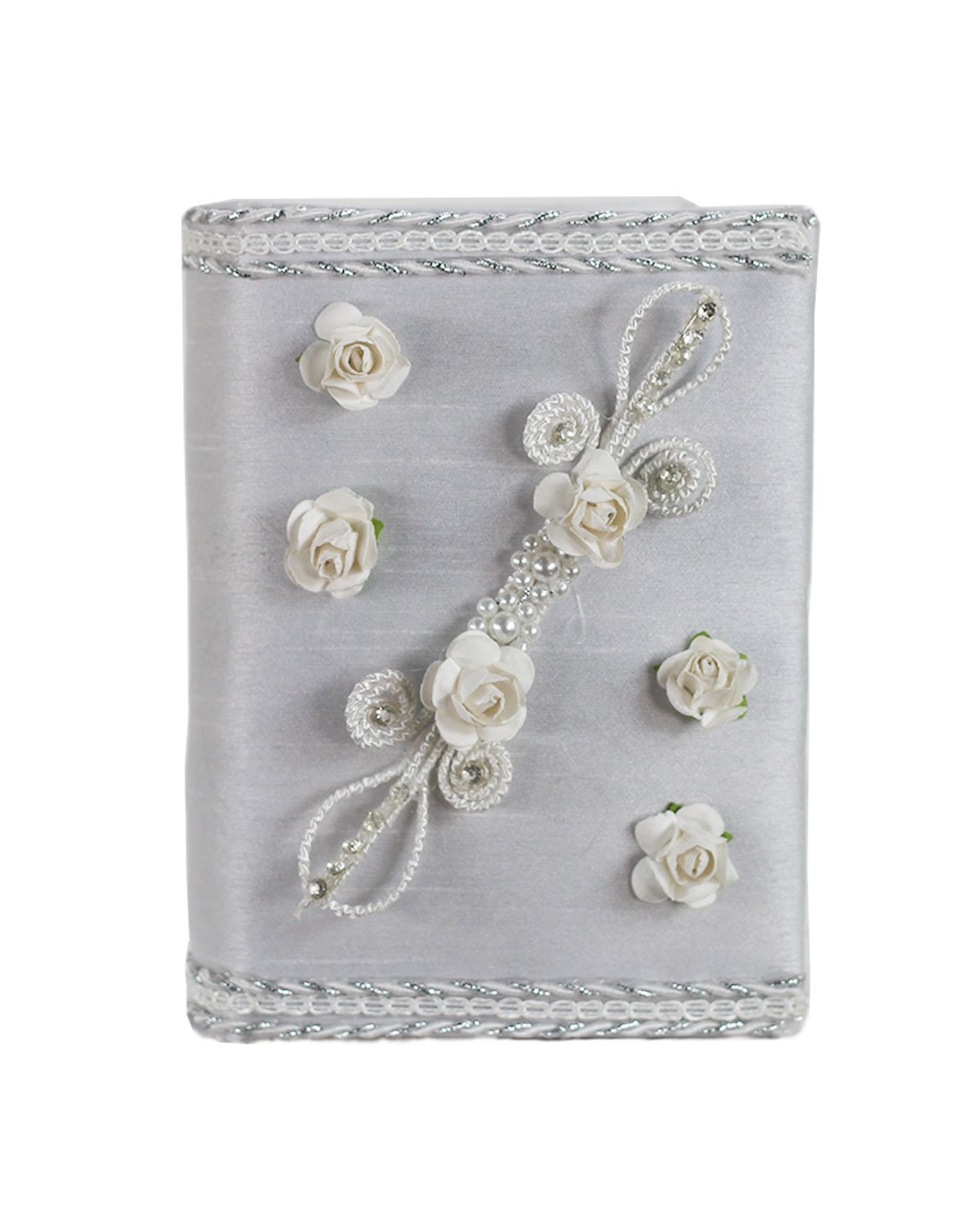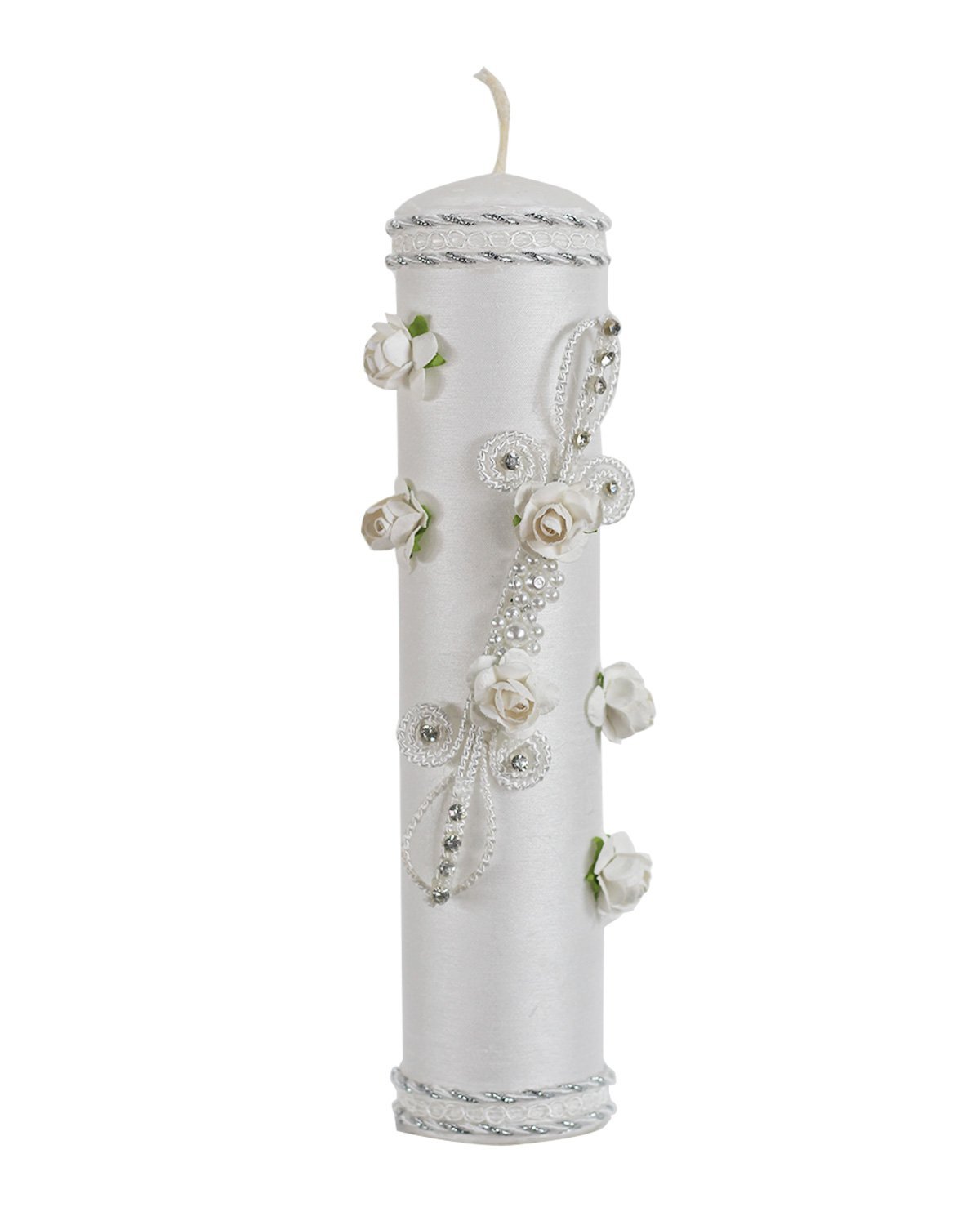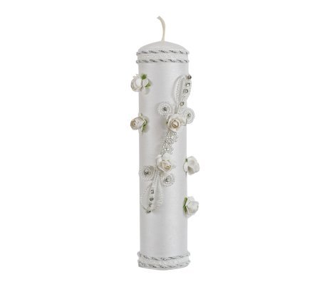 The First Communion Kit in Luisa Style features a beautifully decorated Bible and candle, with delicate embroidery along the edges and an ornament of pearls and rhinestones, including some flowers formed with these sparkling materials.