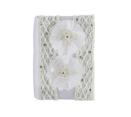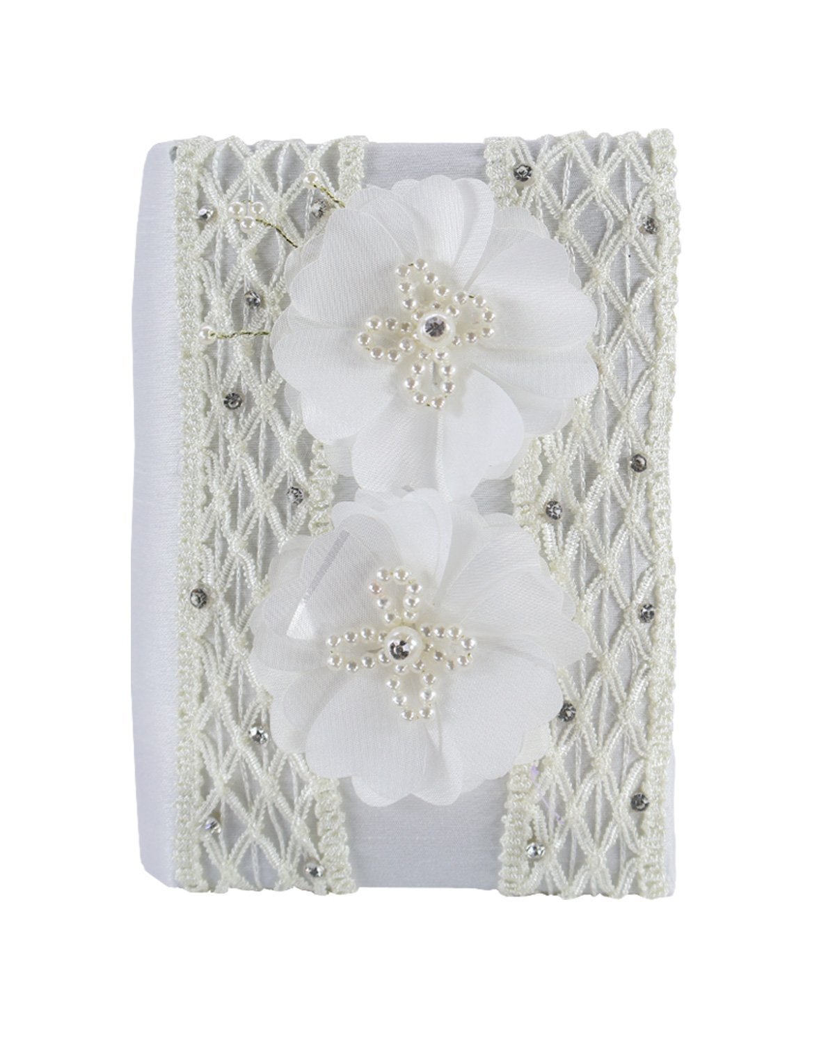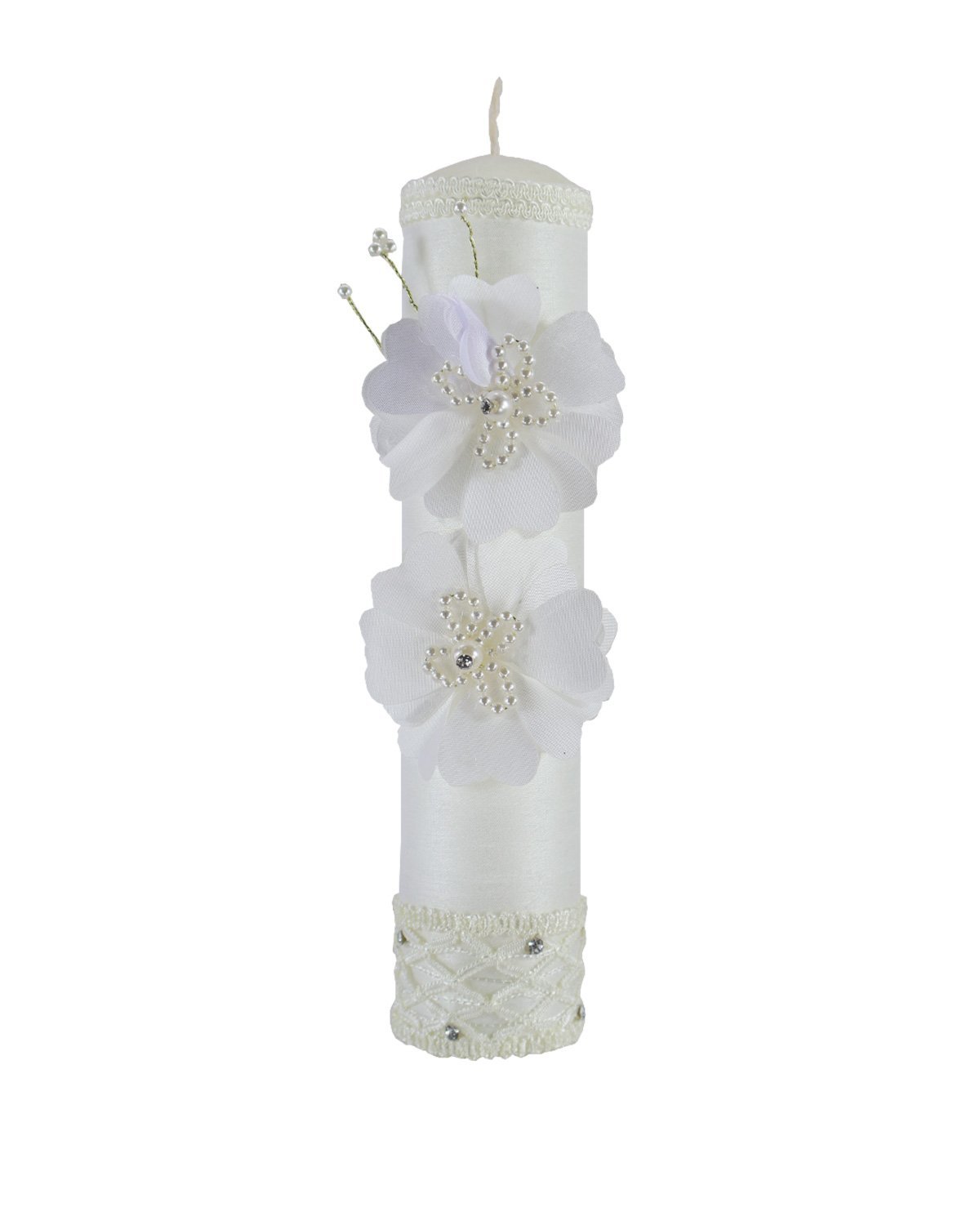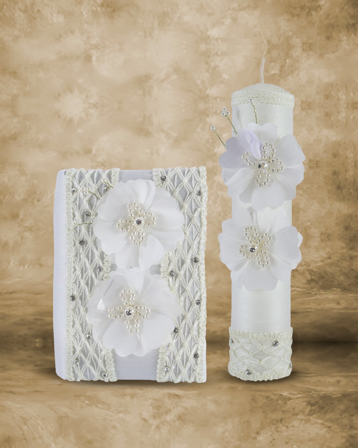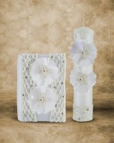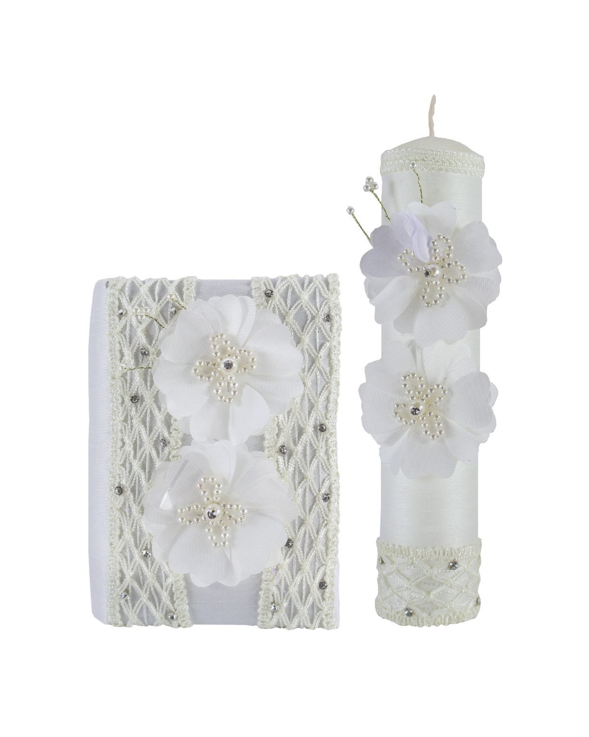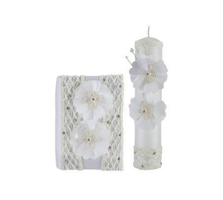 The First Communion Kit Style Fernanda includes a bible, a candle, and a rosary beautifully adorned with intricate mesh-shaped embroidery in the center and along the edges, 3D flowers, with rhinestones and pearls.