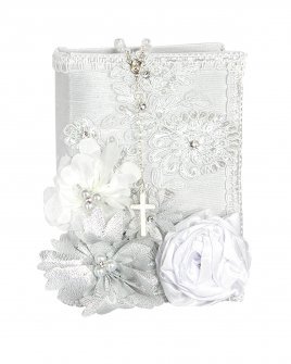 The First Communion Kit, Style Elia, includes a bible, a candle, and a rosary adorned with embroidery, 3D flowers in various tones, embroidery along the edges, rhinestones, and pearls.