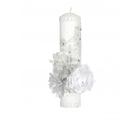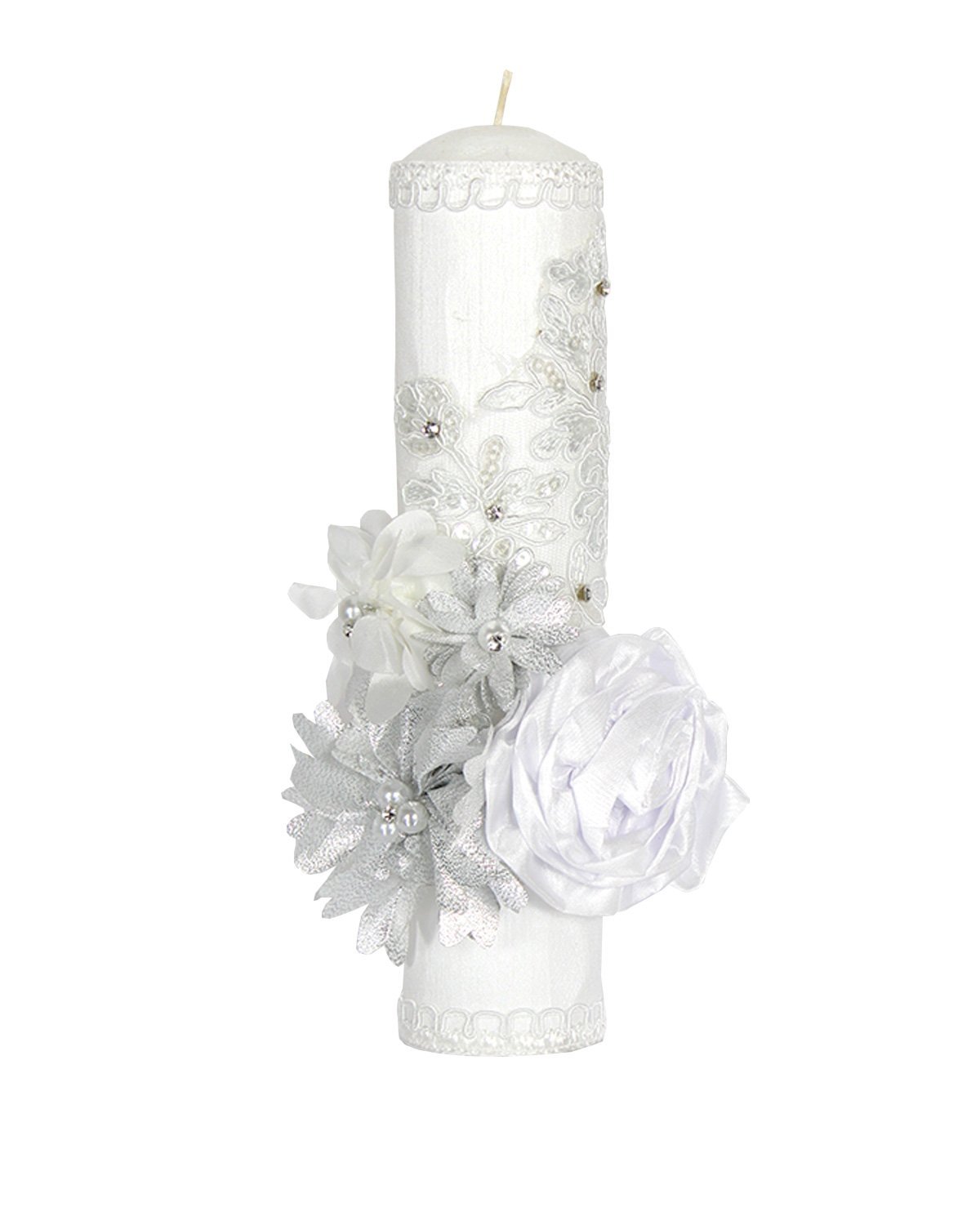 The First Communion Kit, Style Elia, includes a bible, a candle, and a rosary. The bible and the candle are adorned with embroidery and a bouquet of 3D flowers in different shades, along with embroidery along the edges, rhinestones, and pearls.