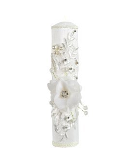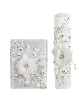 The First Communion Kit, Style Emily, includes a bible, a candle, and a rosary. Both the bible and the candle are adorned with embroidery, 3D flowers, with embroidery in the center and along the edges, complemented with pearls and gemstones.