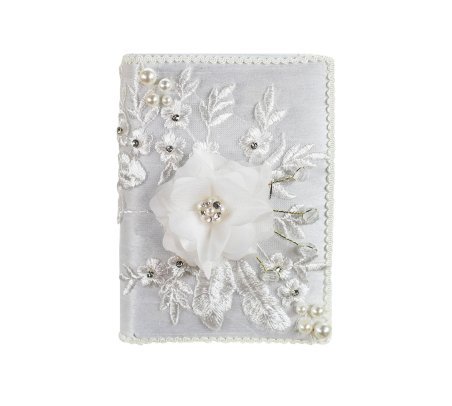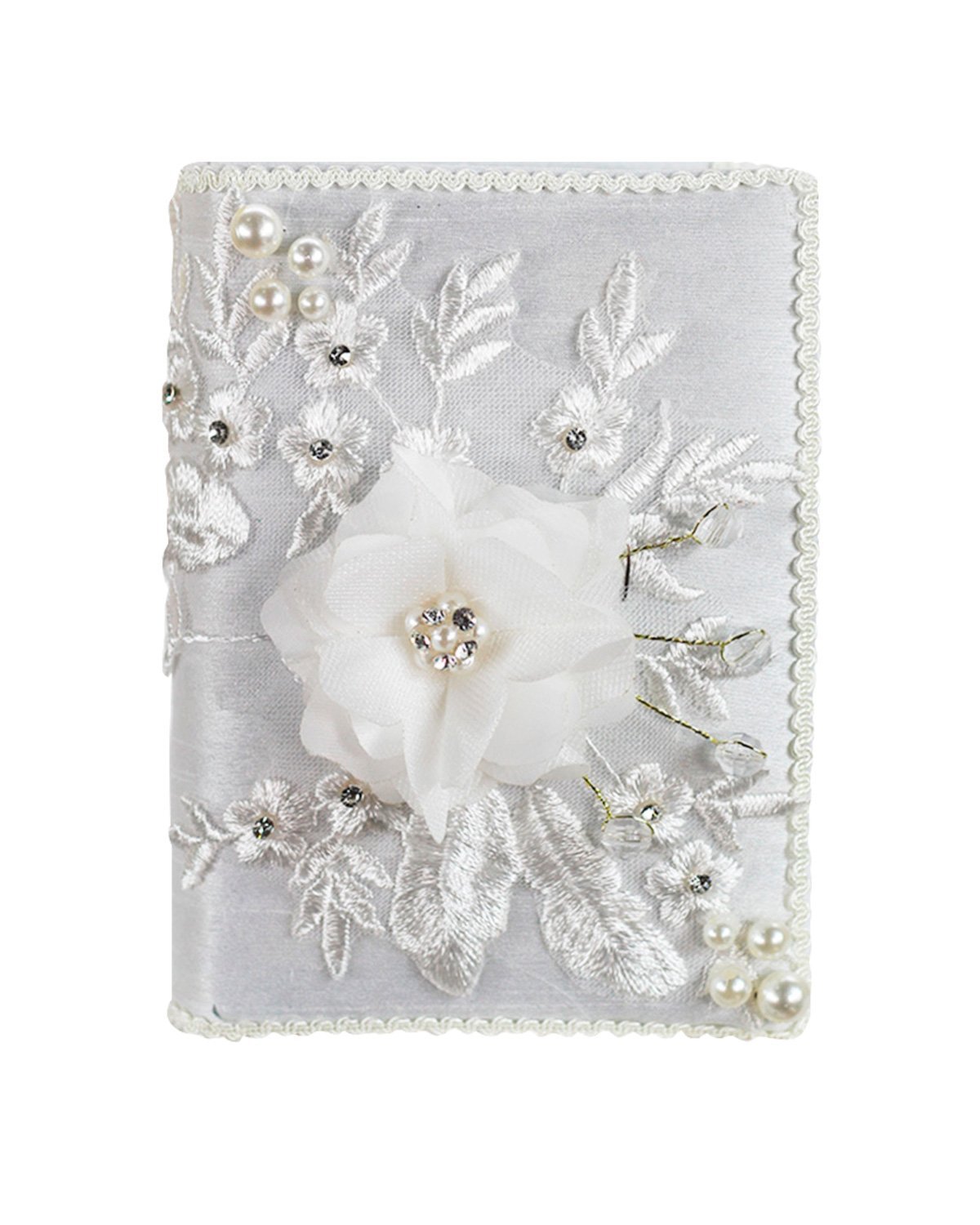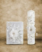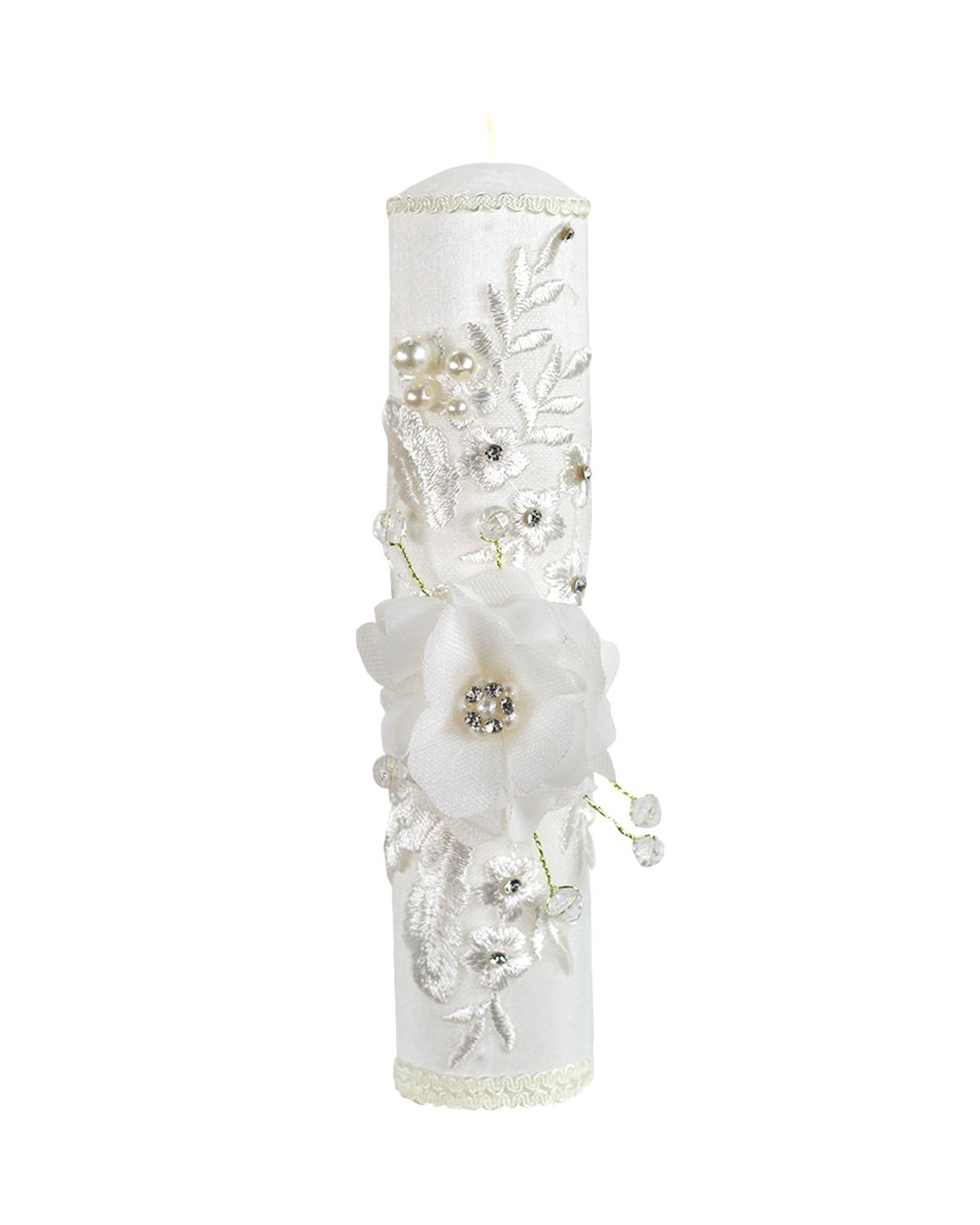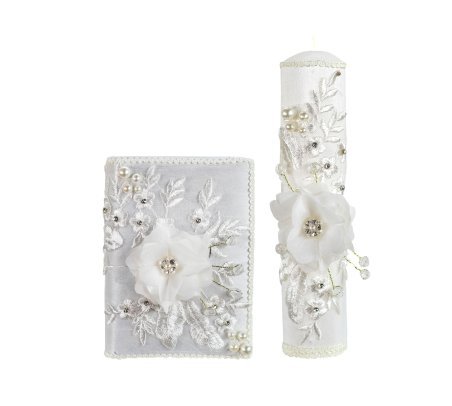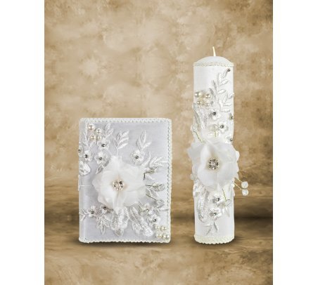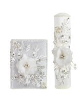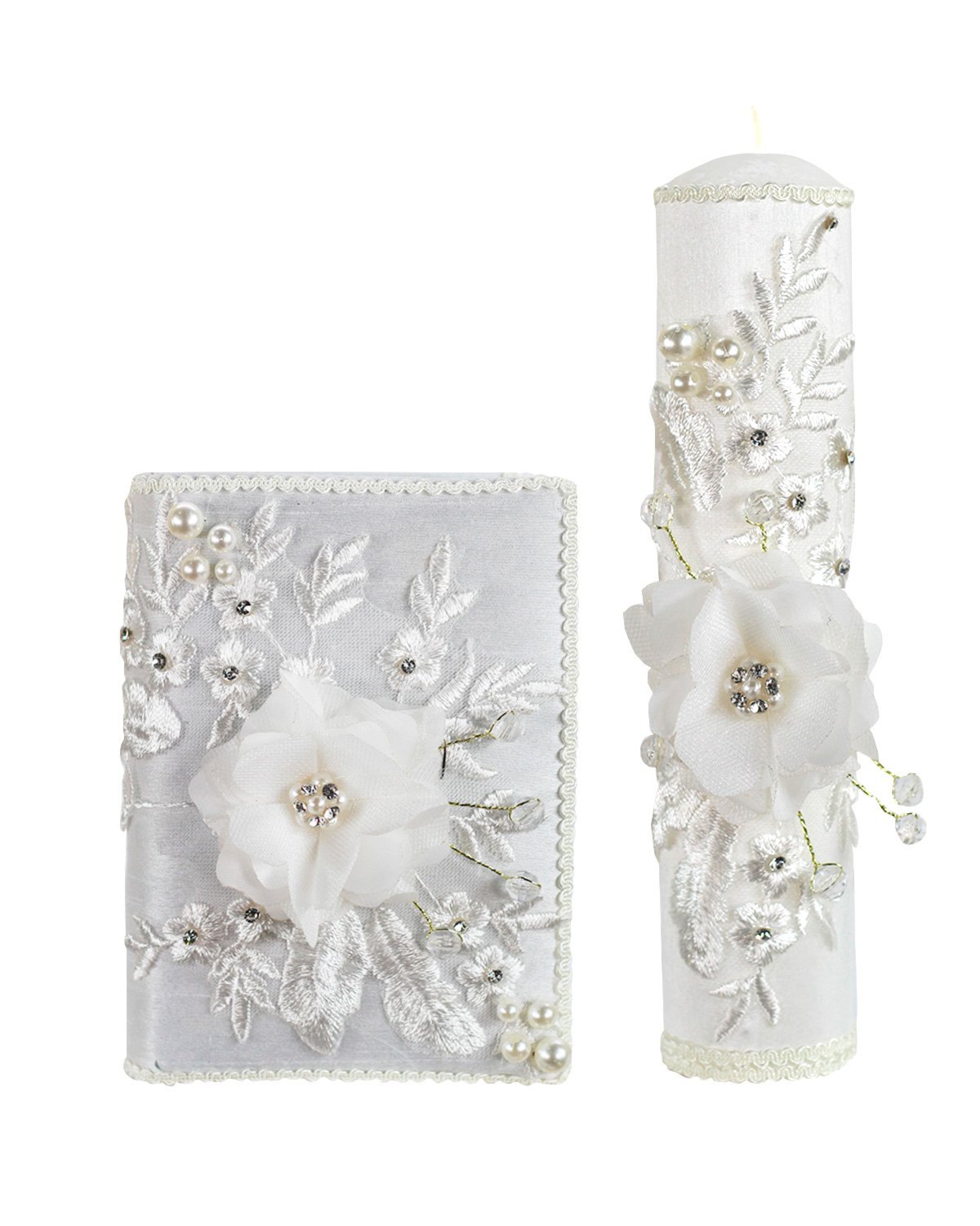The First Communion Kit, Style Emily, contains a bible, a candle, and a rosary adorned with embroidery, 3D flowers, embroidery in the center and along the edges, as well as pearls and gemstones.