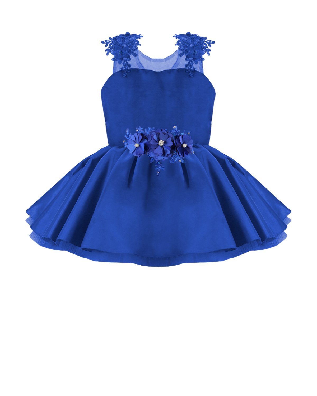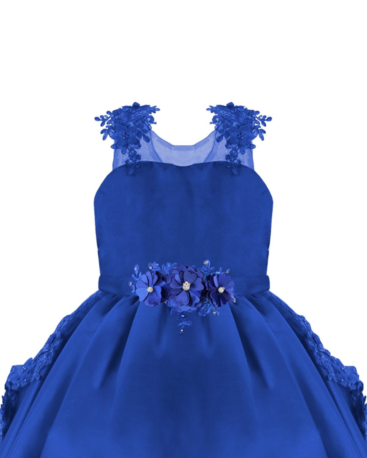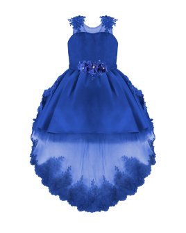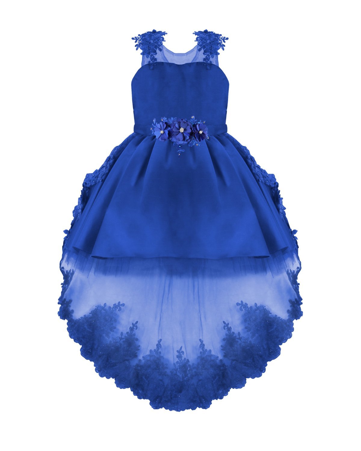 Girl's dress elegant short tulle and taffeta skirt with appliqués of embroidered flowers with a 3D finish, pearls and crystal stones with detachable tail and embroidery designs.