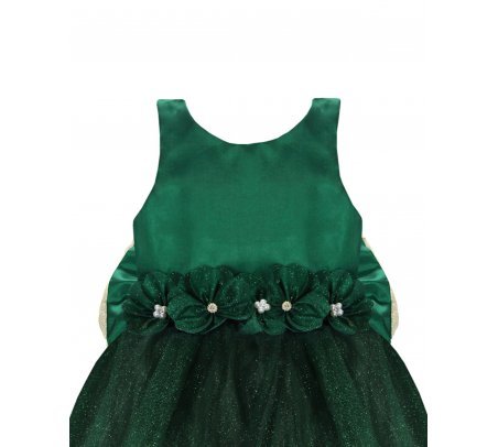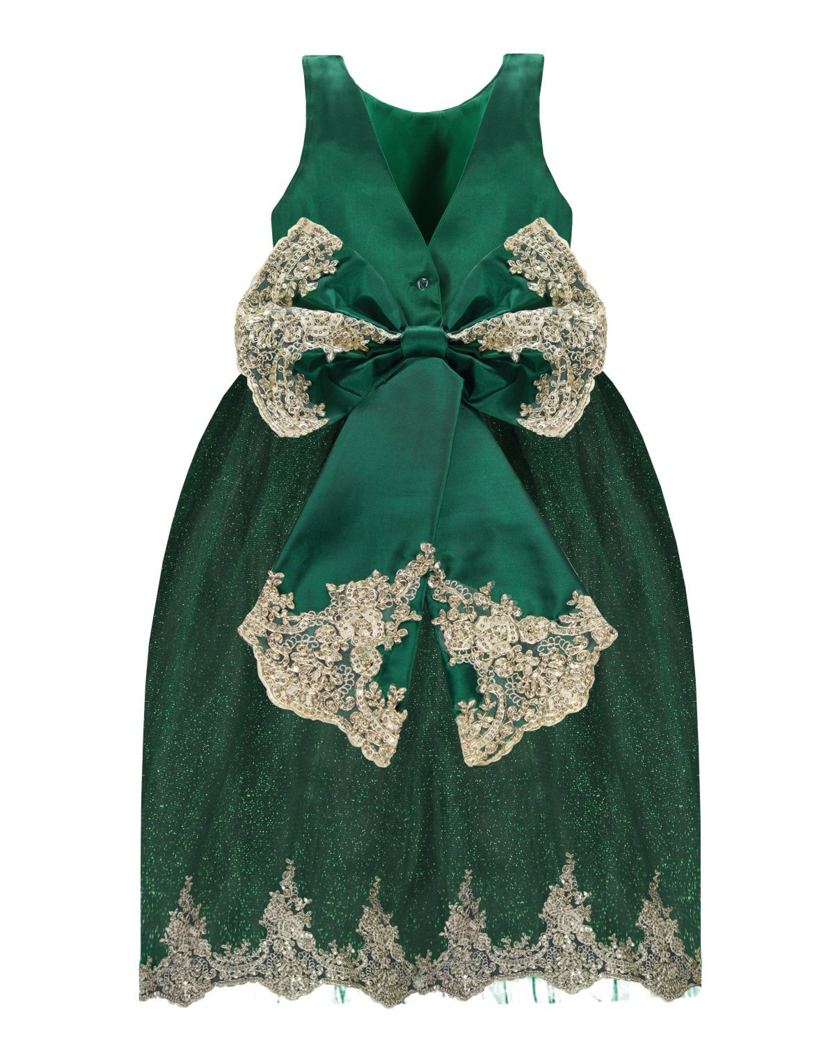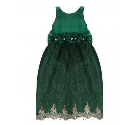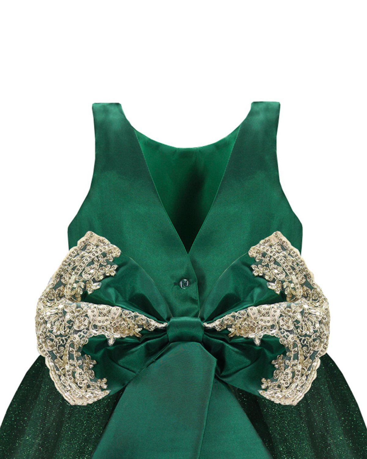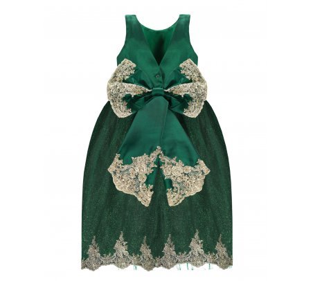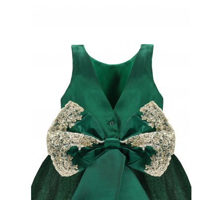 This wonderful girl's dress is the perfect choice to look charming at any occasion or special event. It is made with taffeta, shiny glitter, tulle and a border at the bottom. A bow with a gold lace finish adds a touch of elegance and a unique shine to your look. your little one will feel unique.