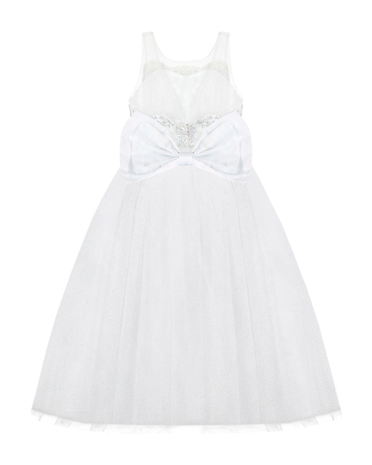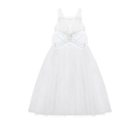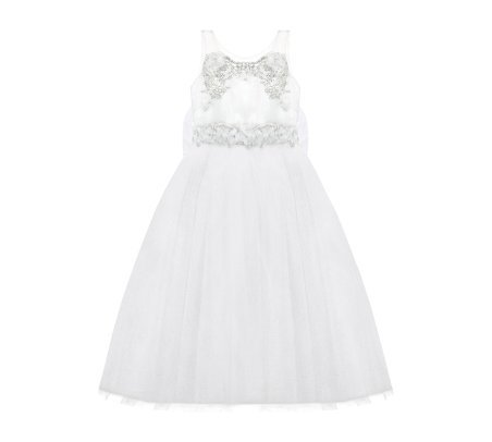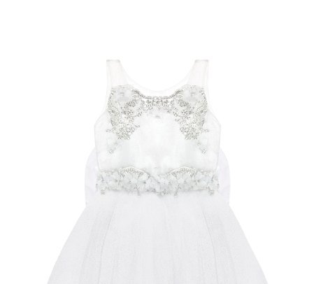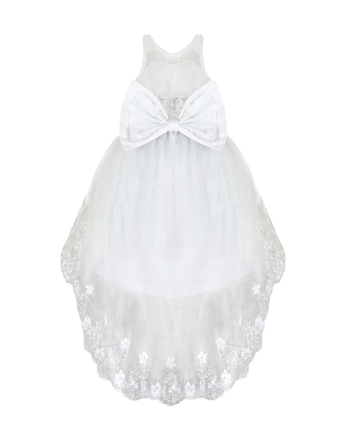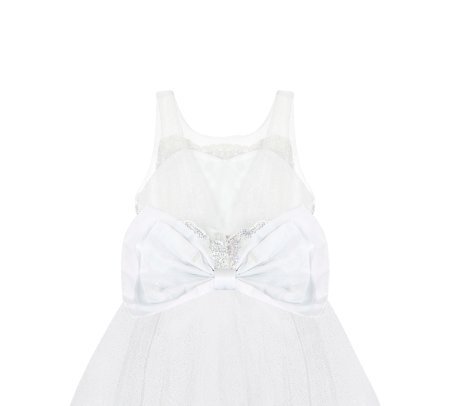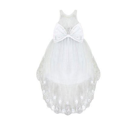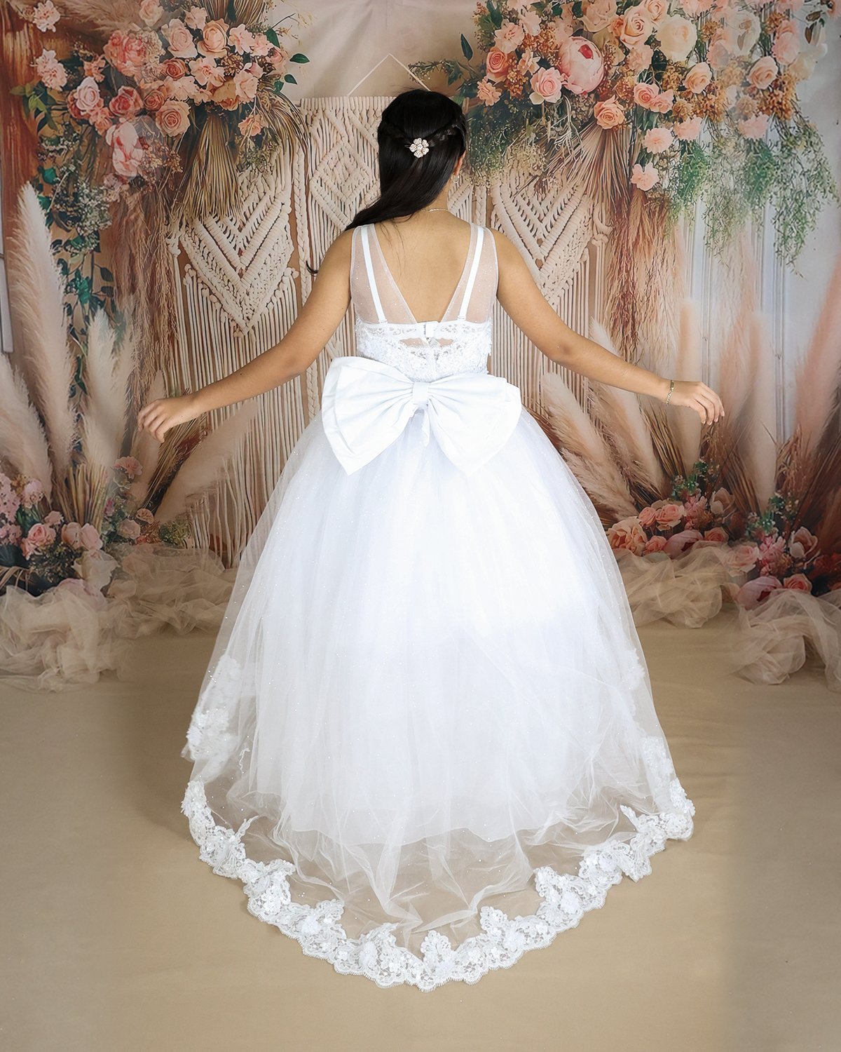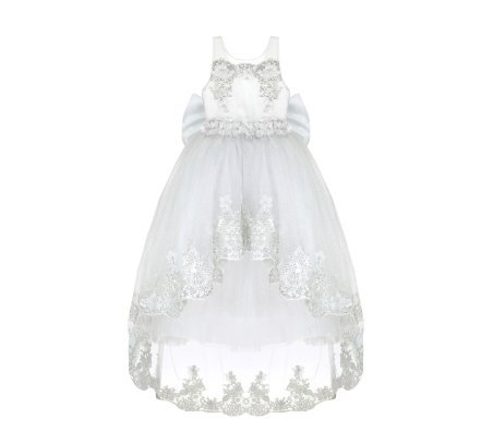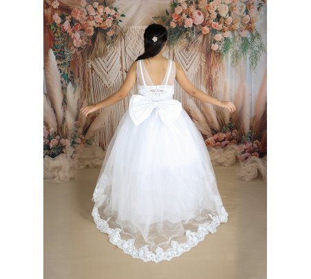 It is made of high quality lining, with a shimmering veil and glitter that add a touch of sparkle and glam to the dress. A silver valance at the back adds a touch of sophistication. The dress has a detachable tail that can be adjusted according to the needs of the girl.