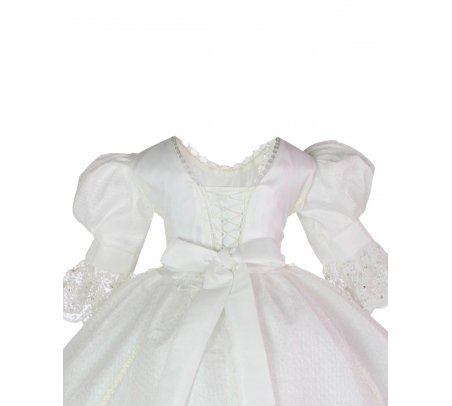 First communion dress for girl made of shantung with high-quality lace, princess-style sleeves, back with corset and flower decoration in light colors.