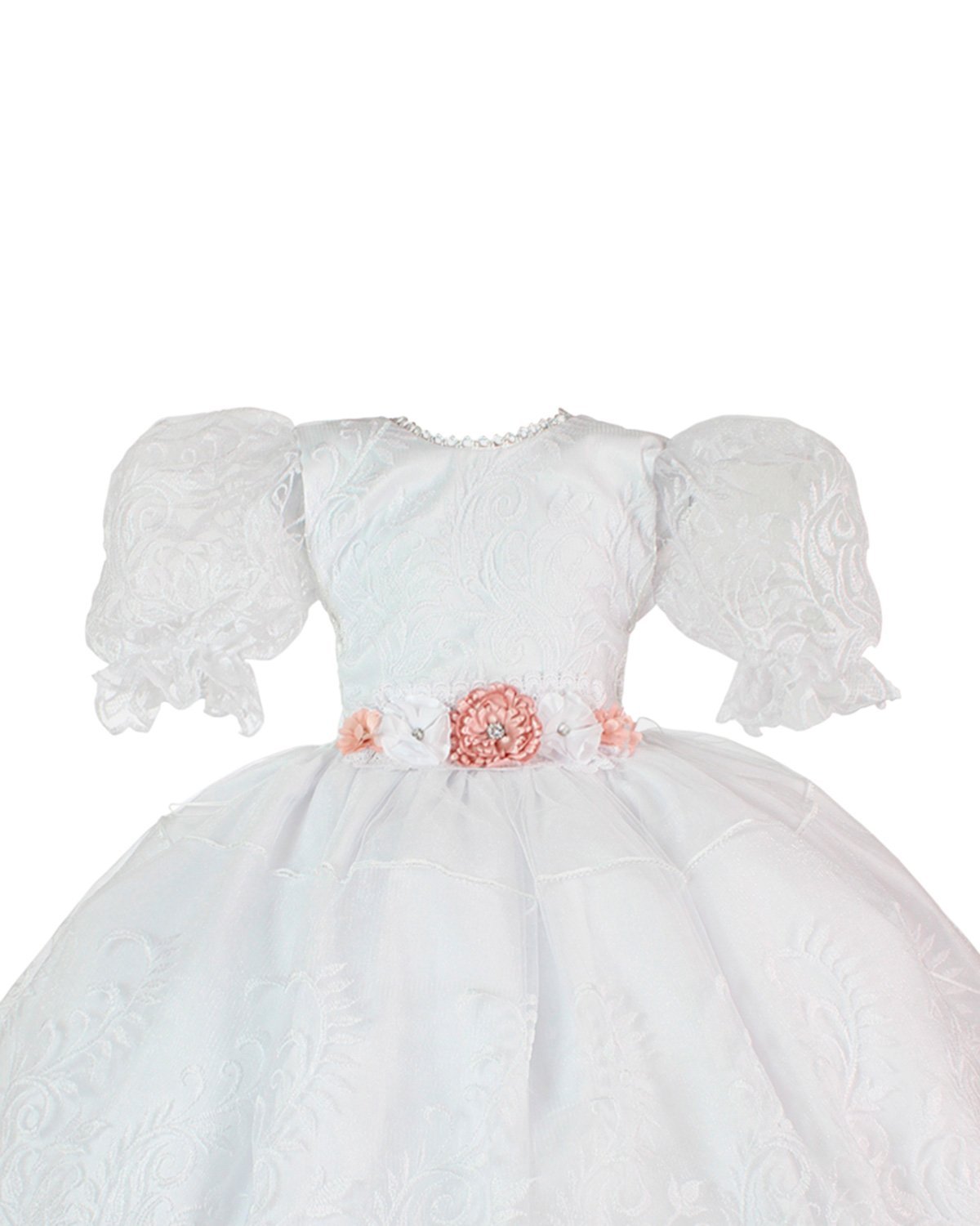 This girl's first communion dress is an elegant and standout option for the special communion occasion. It's made of high-quality shantung and features a detachable embroidered organza skirt, allowing the girl to move comfortably throughout the day. The princess-style sleeves have an embroidered organza border that gives the dress a sweet and delicate touch. The princess cut shantung and embroidered waist and corset back ensure a perfect and comfortable fit. The embellishment in tender colors with rhinestones adds a touch of sparkle and glamour.