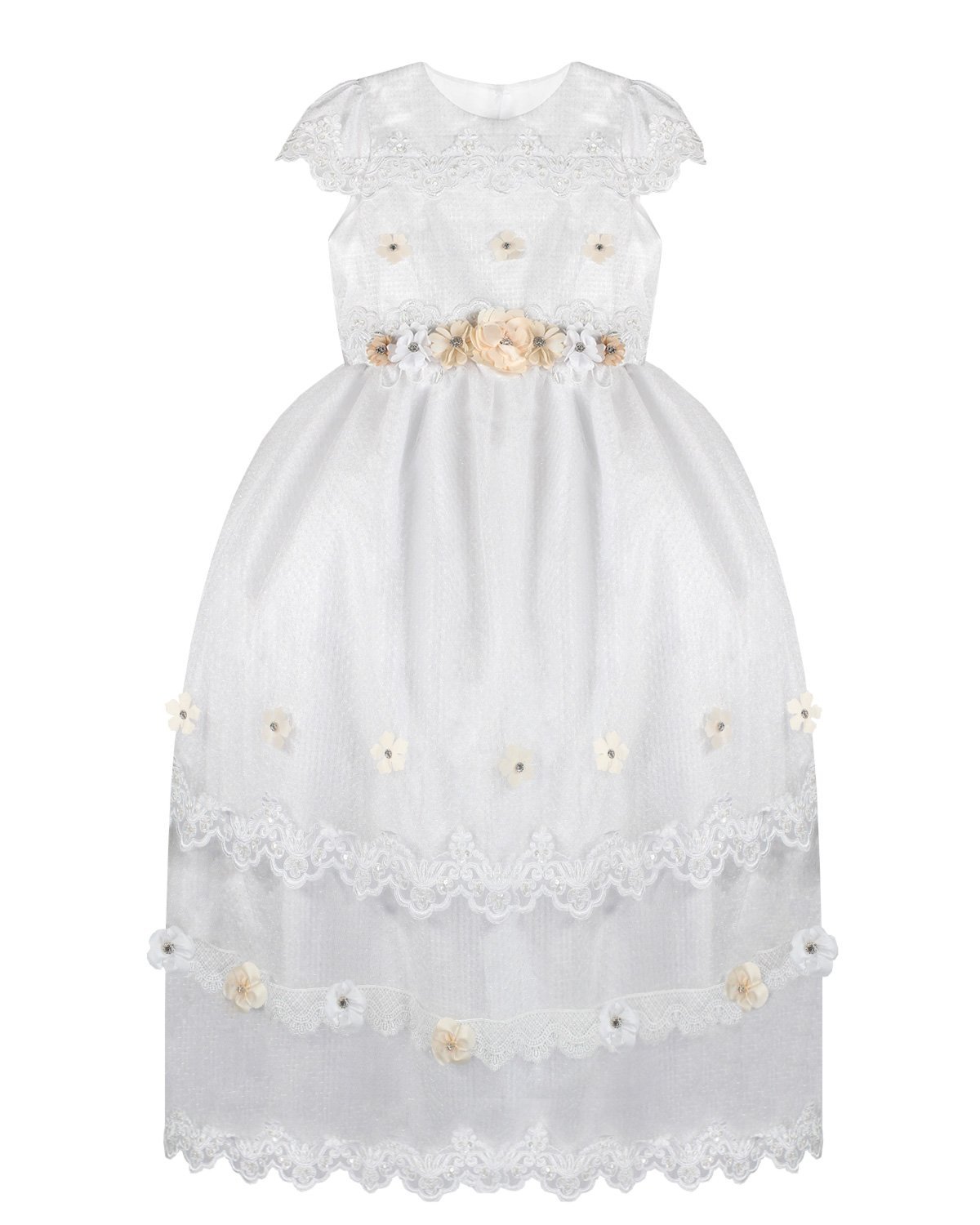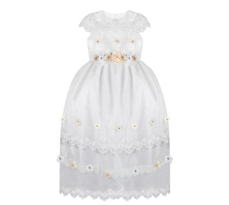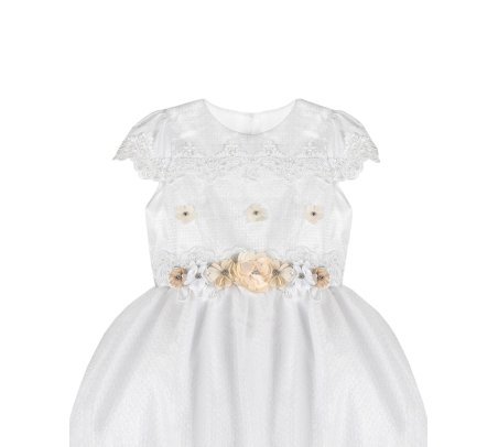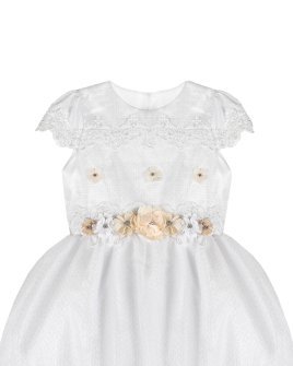 The Karol Communion Dress Model is a delightful choice for your daughter's special communion day. The blouse is meticulously crafted in shantung fabric, featuring exquisite embroidered tulle adorned with 3D flowers, pearls, and rhinestones, complemented by a matching tone lining for added comfort. The skirt, also made of shantung, showcases embroidered tulles and tiers of 3D flowers at different heights, adding an elegant touch and volume. The back closure with buttons and adjustable bow complete this beautiful dress, ensuring a perfect fit for the occasion.