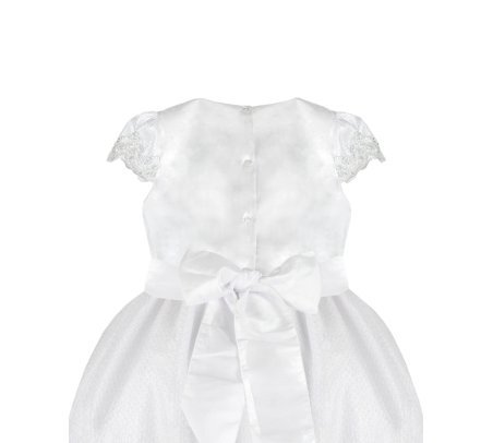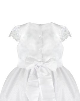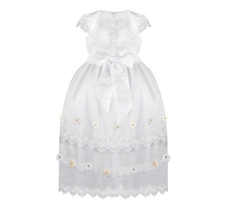 The Karol Communion Dress Model stands out for its delicate and charming details. The shantung blouse with embroidered tulles, 3D flowers, pearls, and rhinestones, along with the shantung skirt with embroidered tulles and tiers of 3D flowers, creates an elegant and sophisticated ensemble. The back closure with buttons and adjustable bow ensure a perfect fit for the communion day.