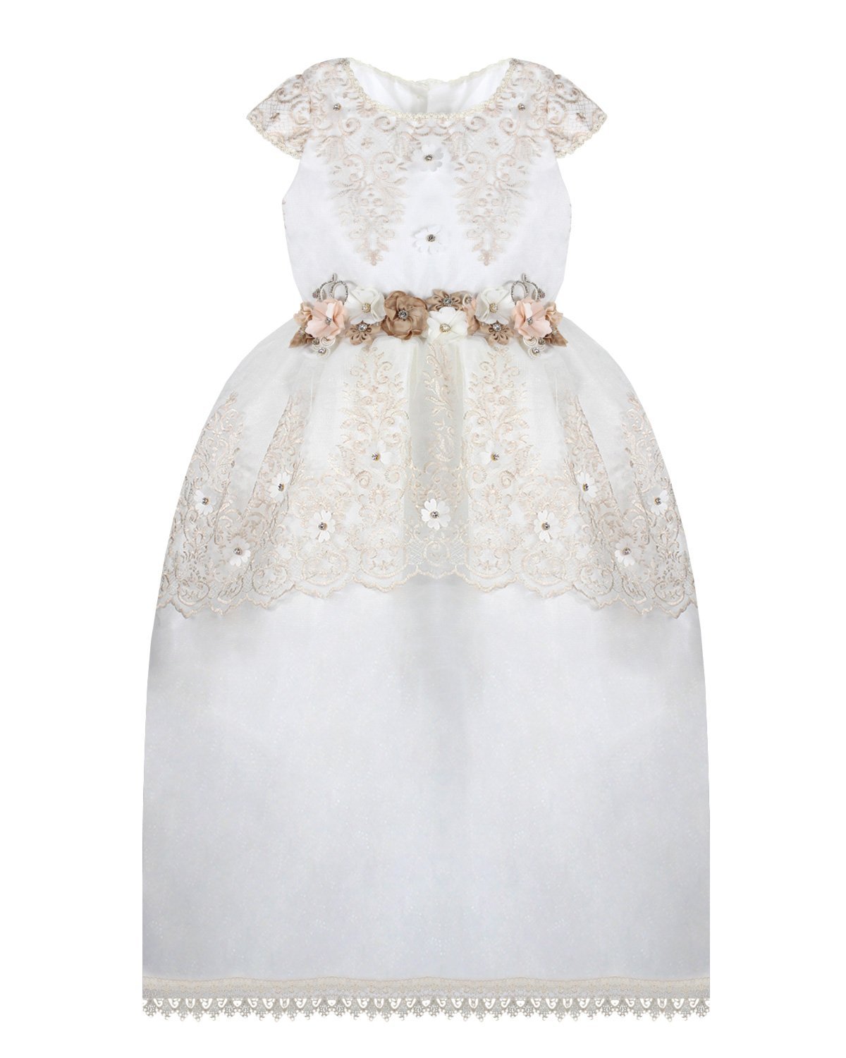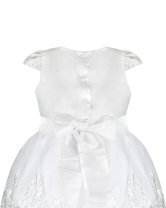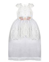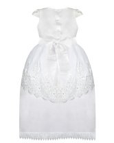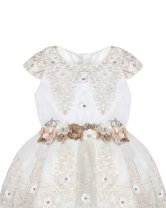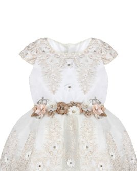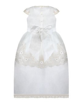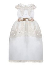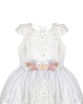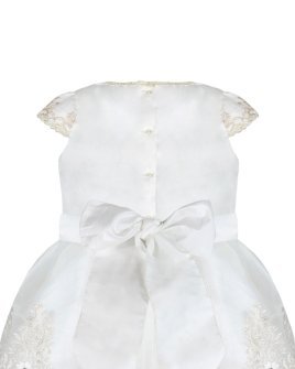 The Dailyn Communion Dress Model shines with its dazzling and elegant details. The shantung blouse with embroidered tulles, 3D flowers, pearls, and rhinestones, paired with the shantung skirt with embroidery and an overlay of embroidered fabric, creates a magnificent and sophisticated ensemble. The back closure with buttons and adjustable bow ensure a perfect fit for the communion day.