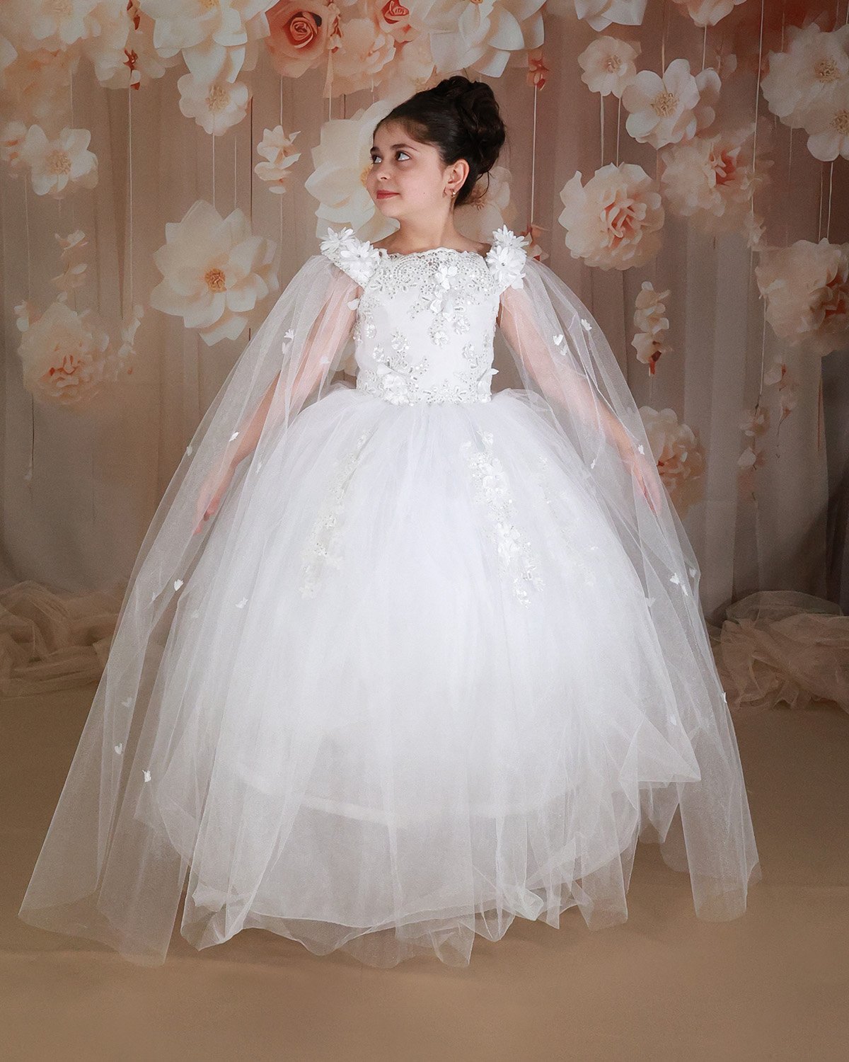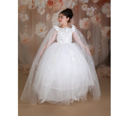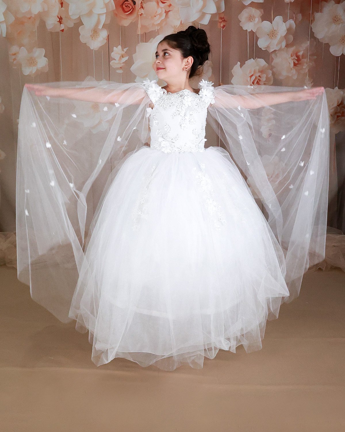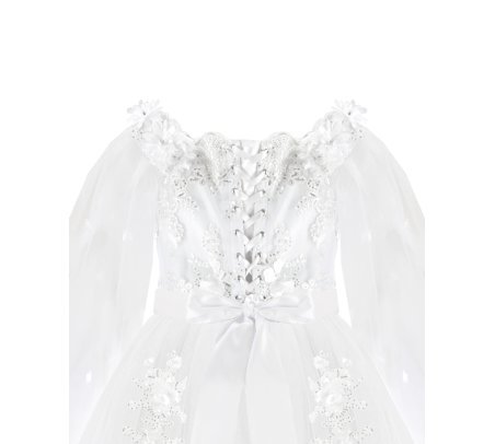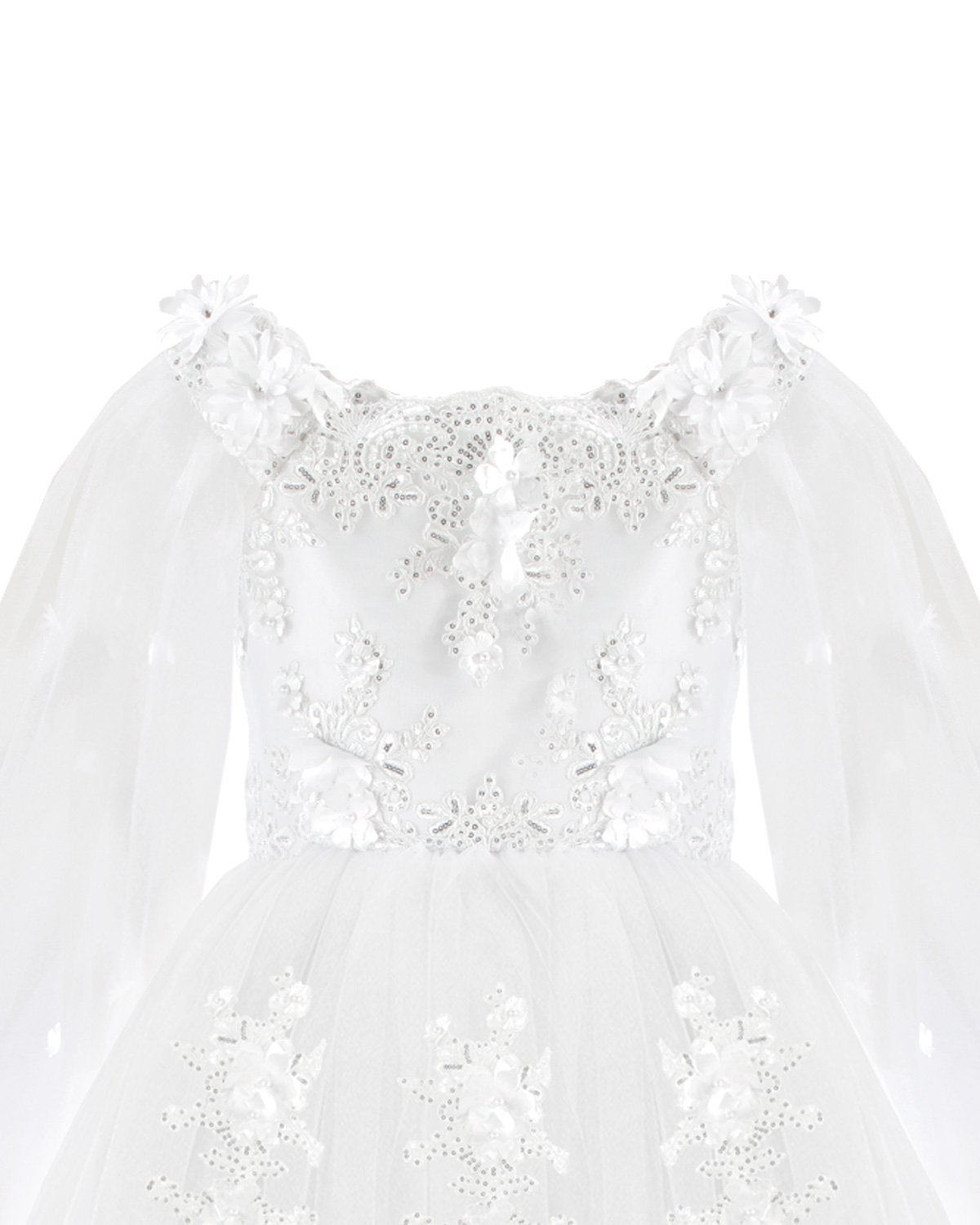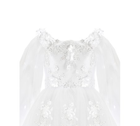First Communion dress Model Paty with 3D flower, matching lining and veil, and sleeves adorned with small 3D flowers. Elegance and charm for unforgettable moments.