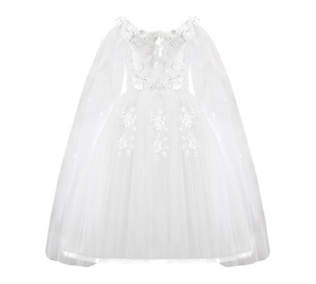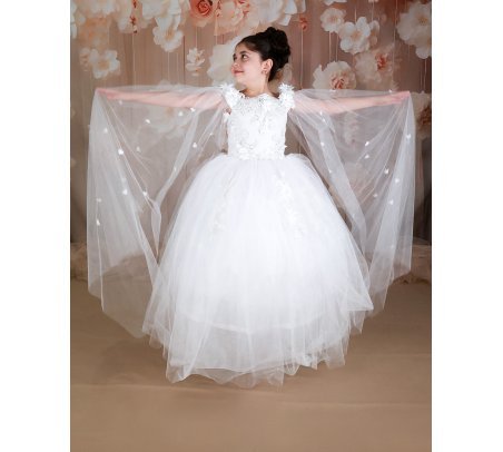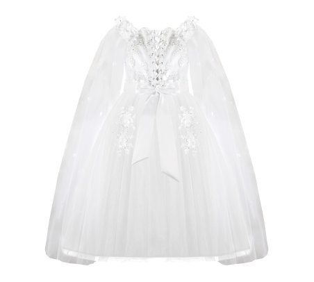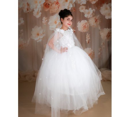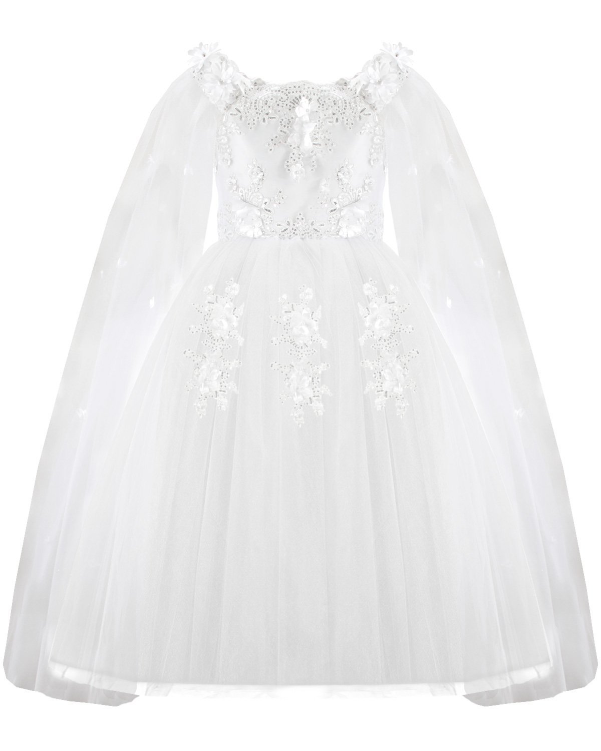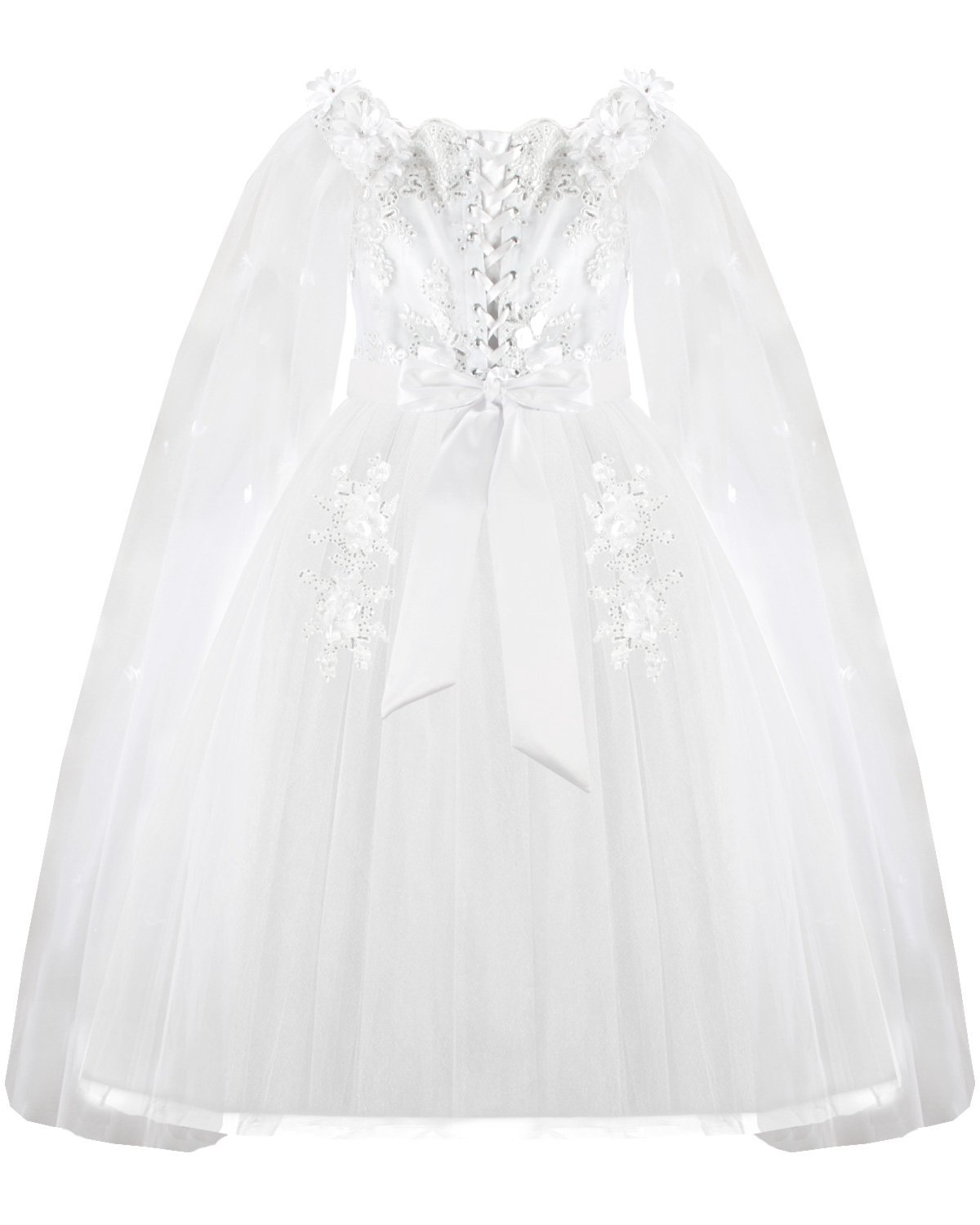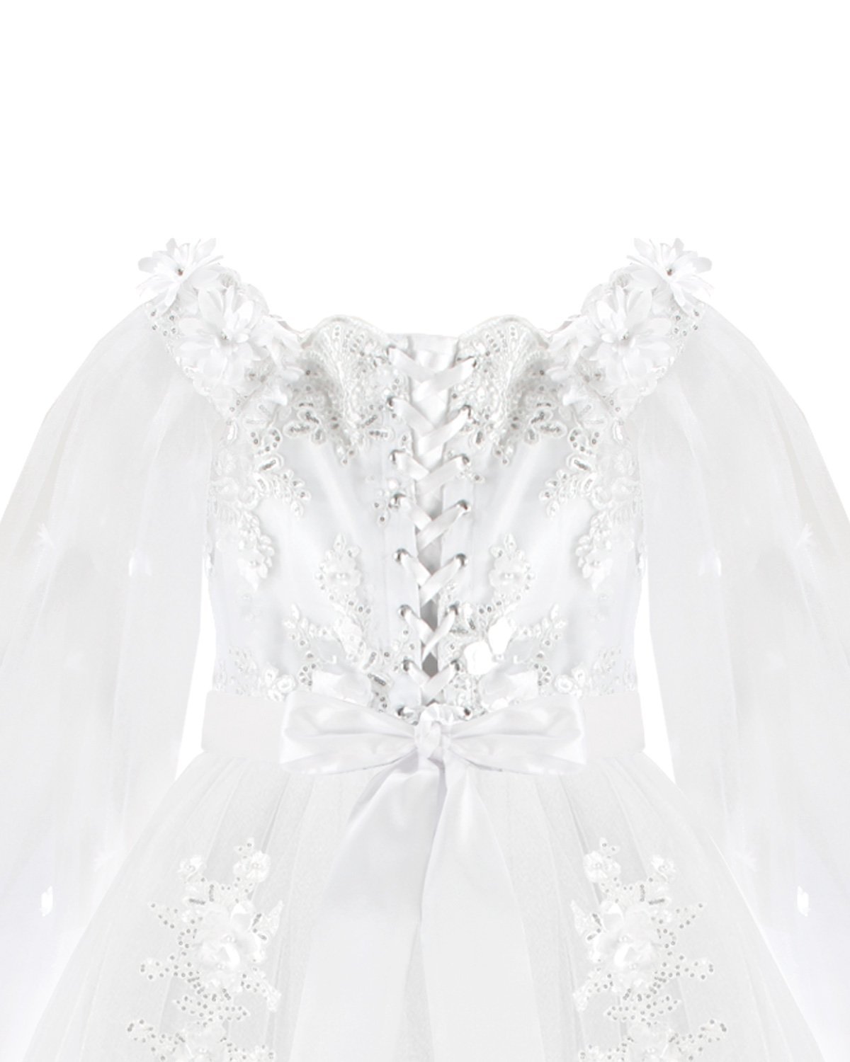 First Communion dress Model Paty with 3D flower, matching lining and veil, and sleeves adorned with small 3D flowers. Elegance and charm for unforgettable moments.