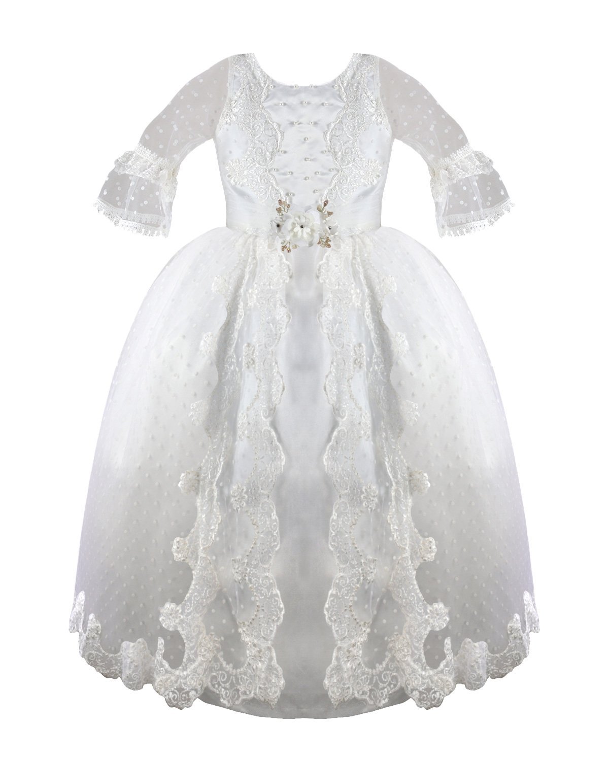 The Catalina First Communion Dress is crafted from plumeti and shantung fabric, featuring a delicate layer of embroidered tulle that enhances its refined look. The design showcases elegant lace details on the front and sleeves, beautifully accented with pearls and fine embroidery. The three-quarter lace ruffle sleeves add a romantic touch, while the floral embellishment at the waist completes the timeless elegance of this piece.