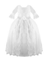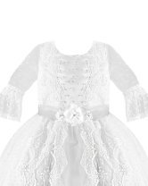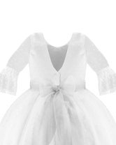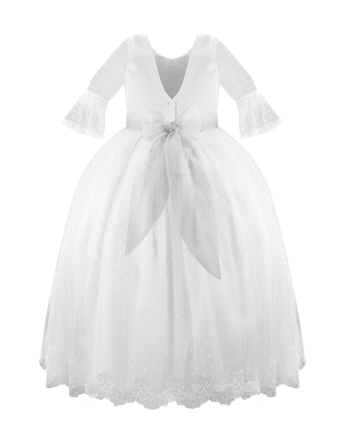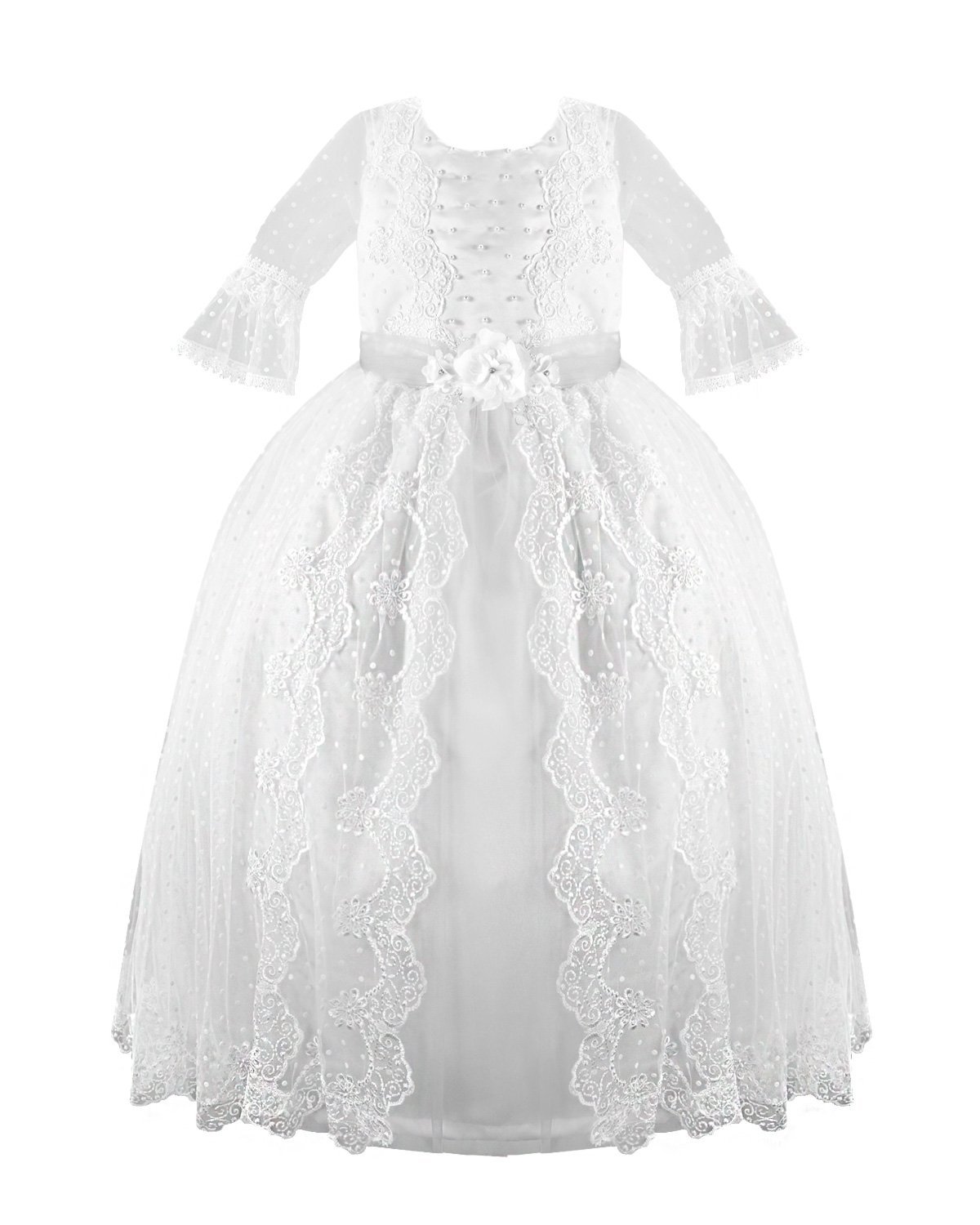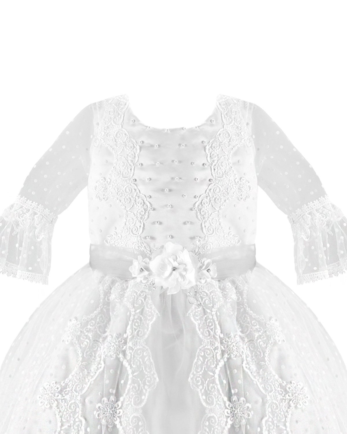 First Communion dress in plumeti and shantung with embroidered tulle, lace, pearls, and floral details. Catalina model.