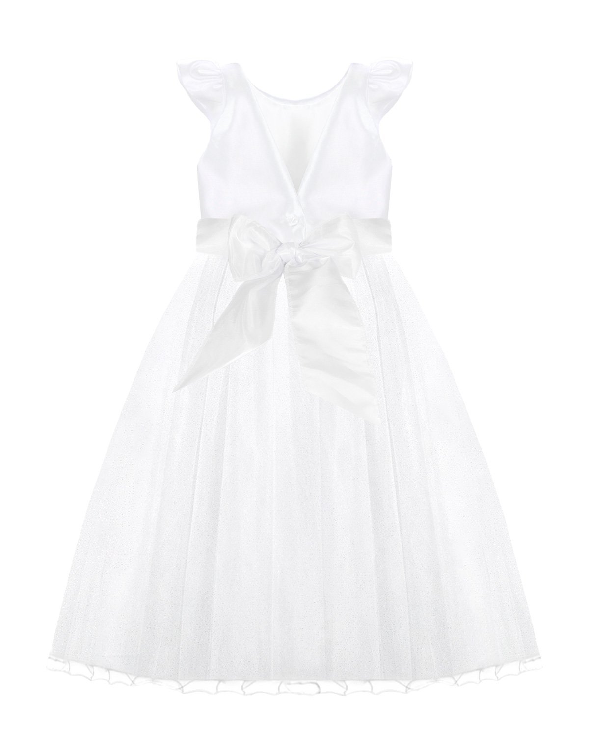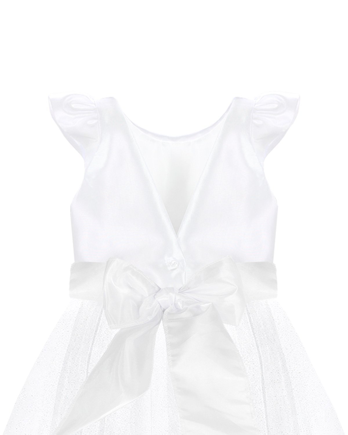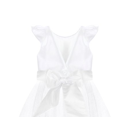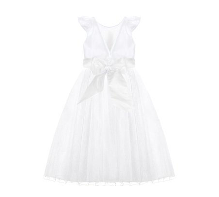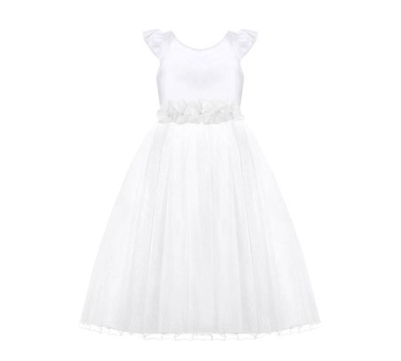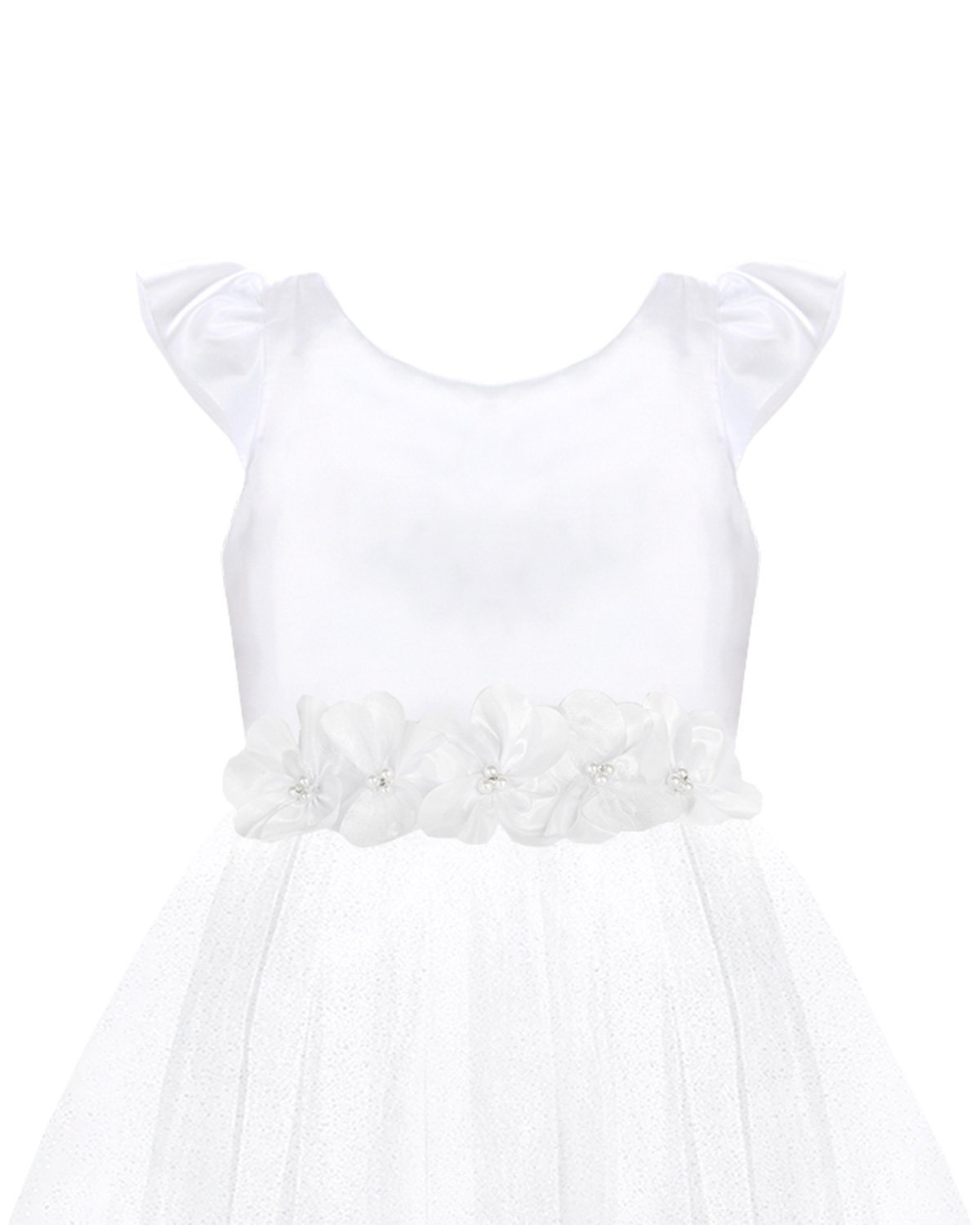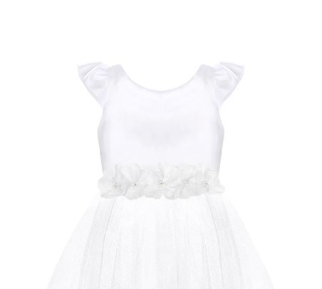 This first communion dress for girls is crafted from a shimmering glitter lining and veil with a quality taffeta bodice. It has a flower ornament that makes it look even more beautiful. This dress is part of our Maylin brand, known for its style and quality.