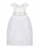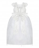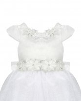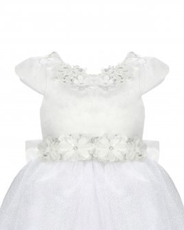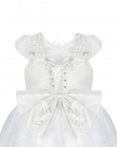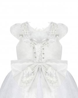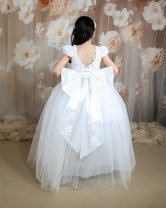 First communion dress for girl made of lining and soft veil, with shiny glitter, corset-style back, flower and beaded decoration, and bow at the back.