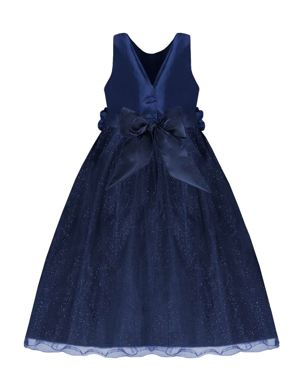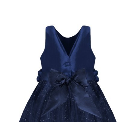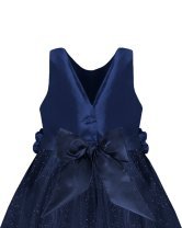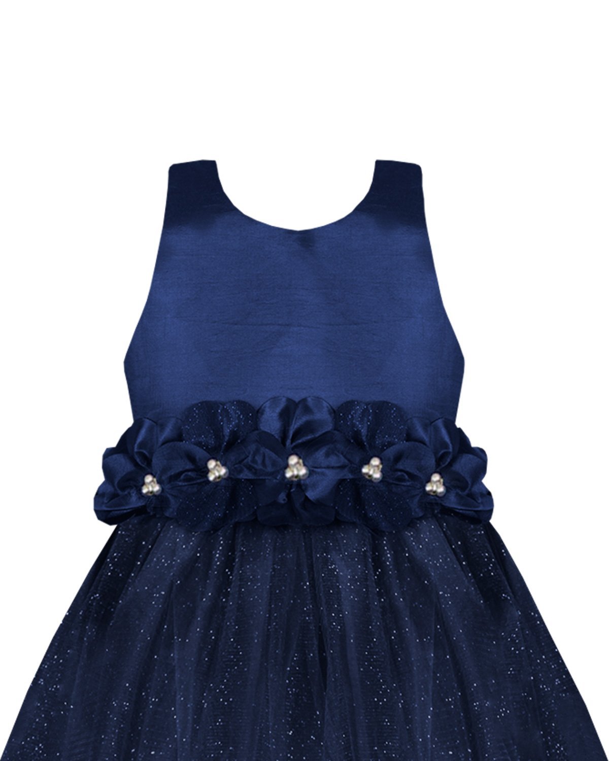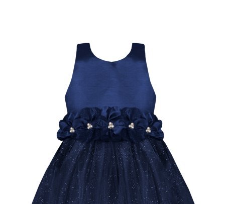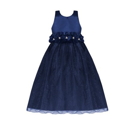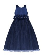 100% polyester dress, sleeveless, back neckline and bundle of flowers with pearls.