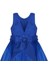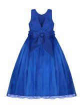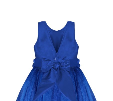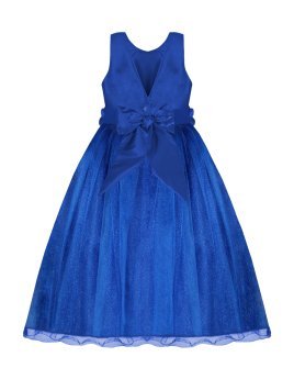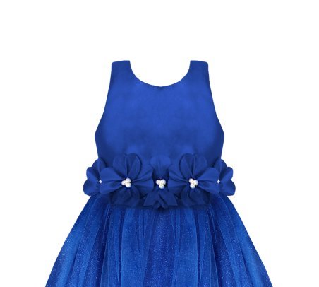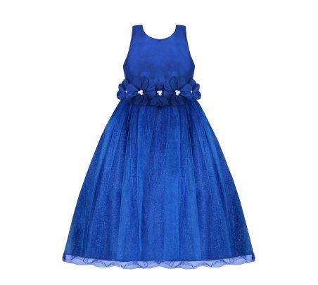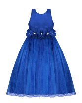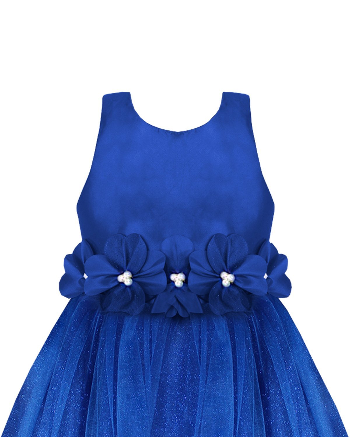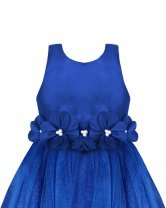 100% polyester dress, sleeveless, back neckline and bundle of flowers with pearls.