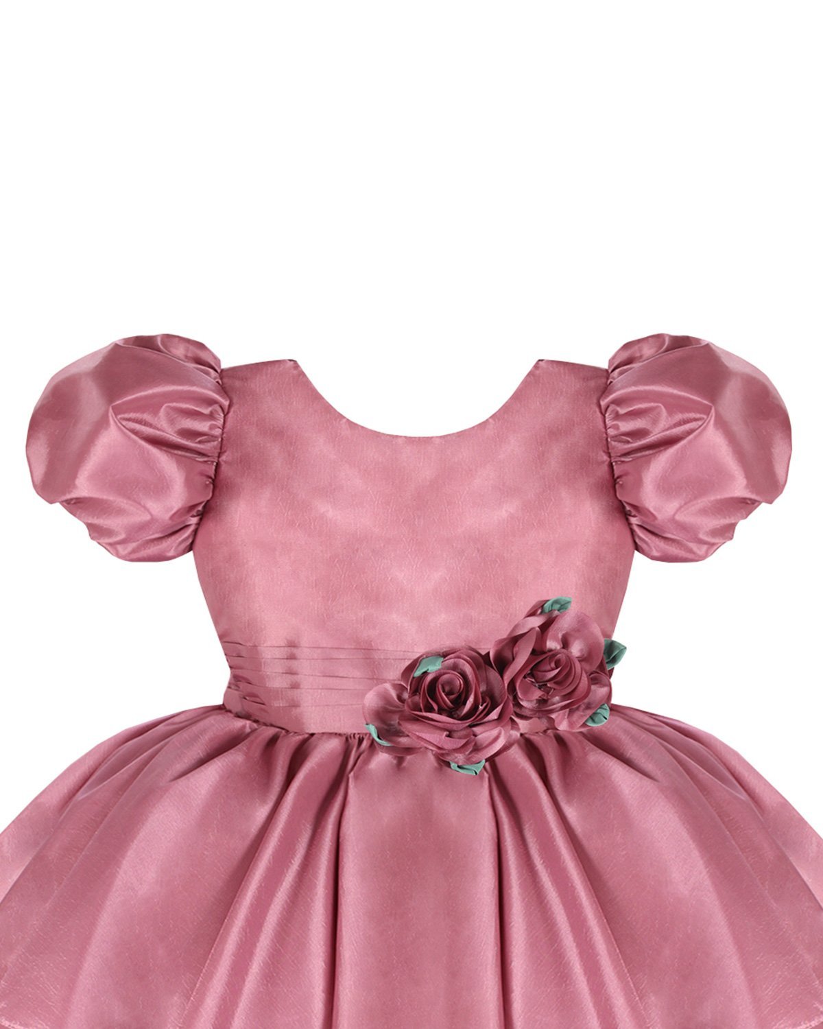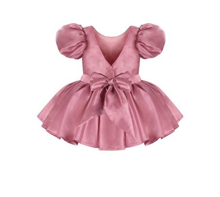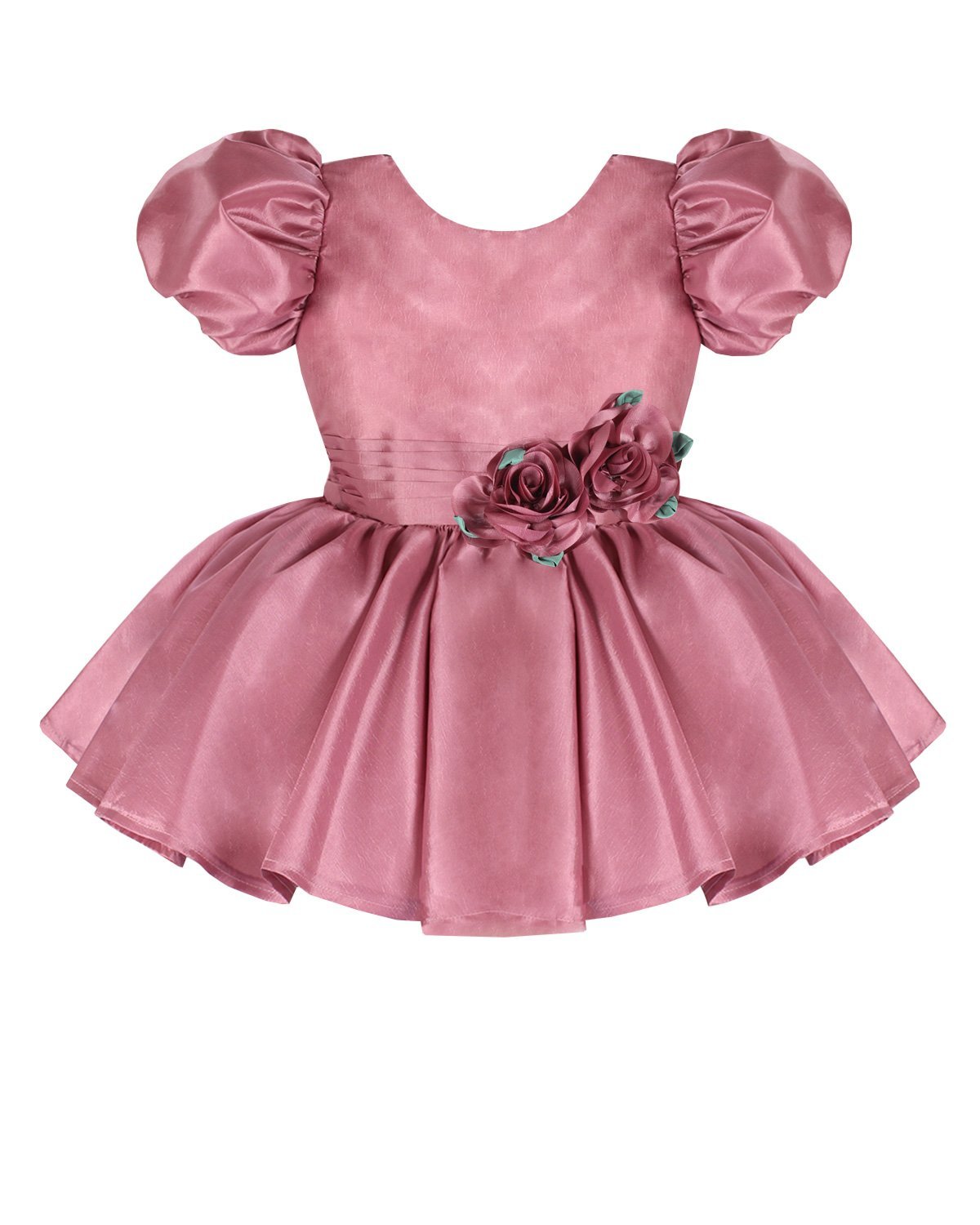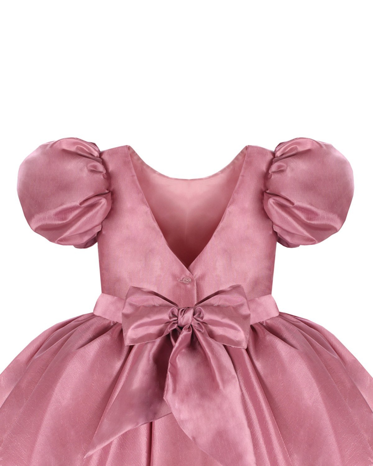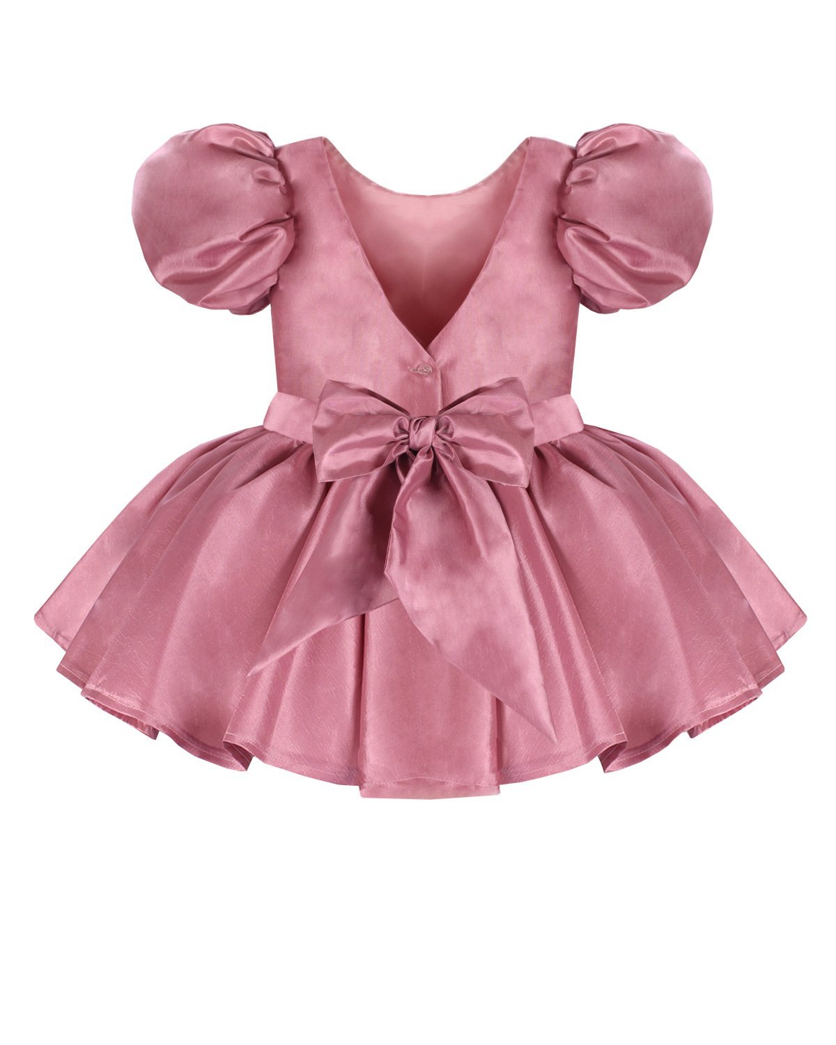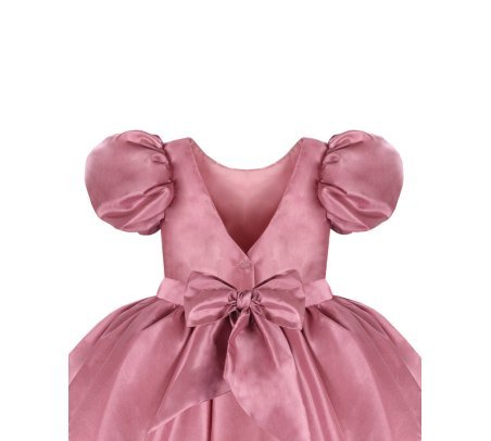 Short taffeta dress for girls with puffed sleeves, flower details, and a bow on the back.