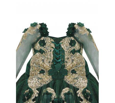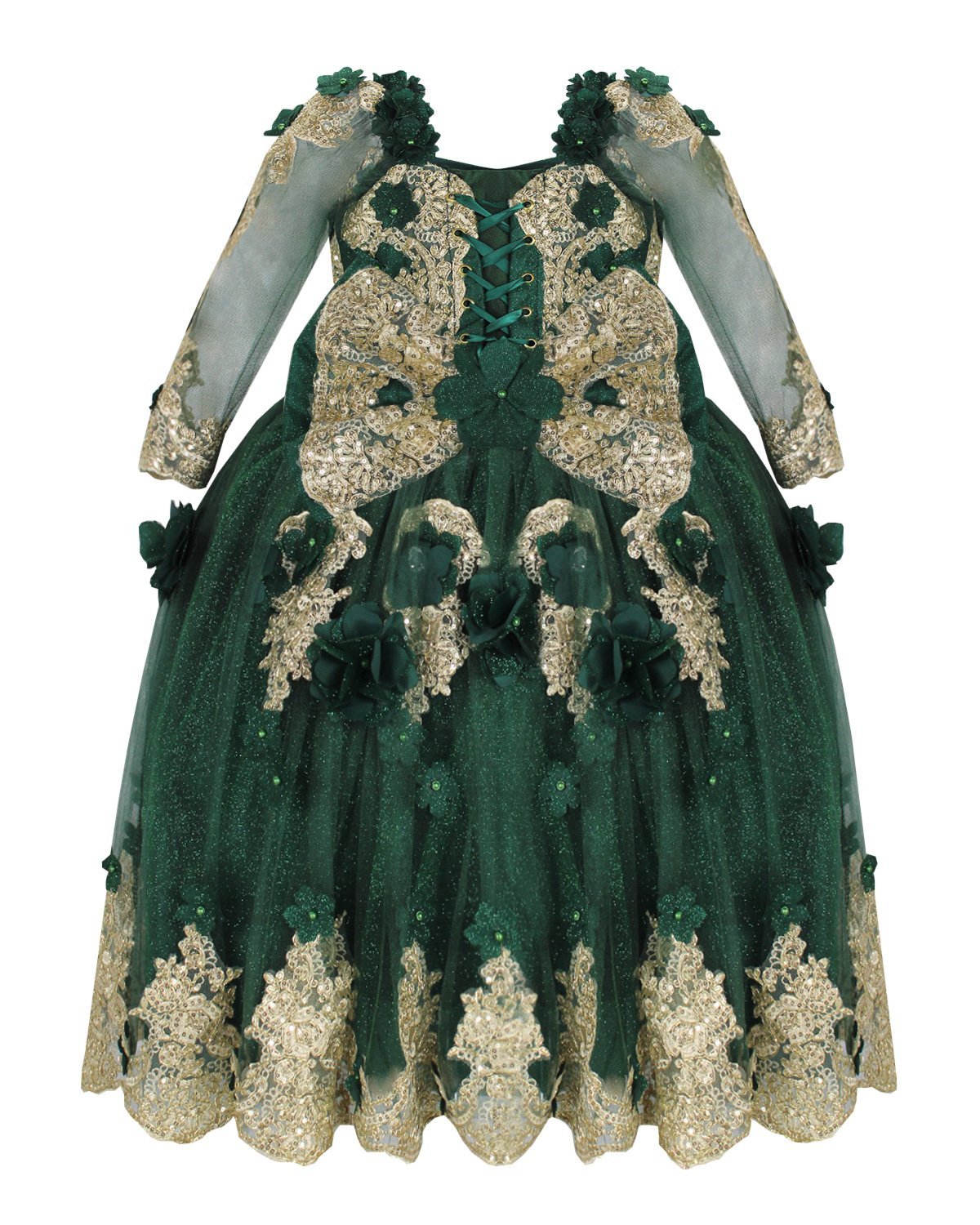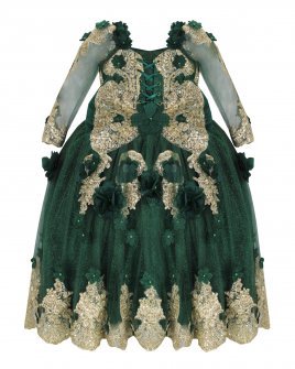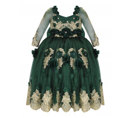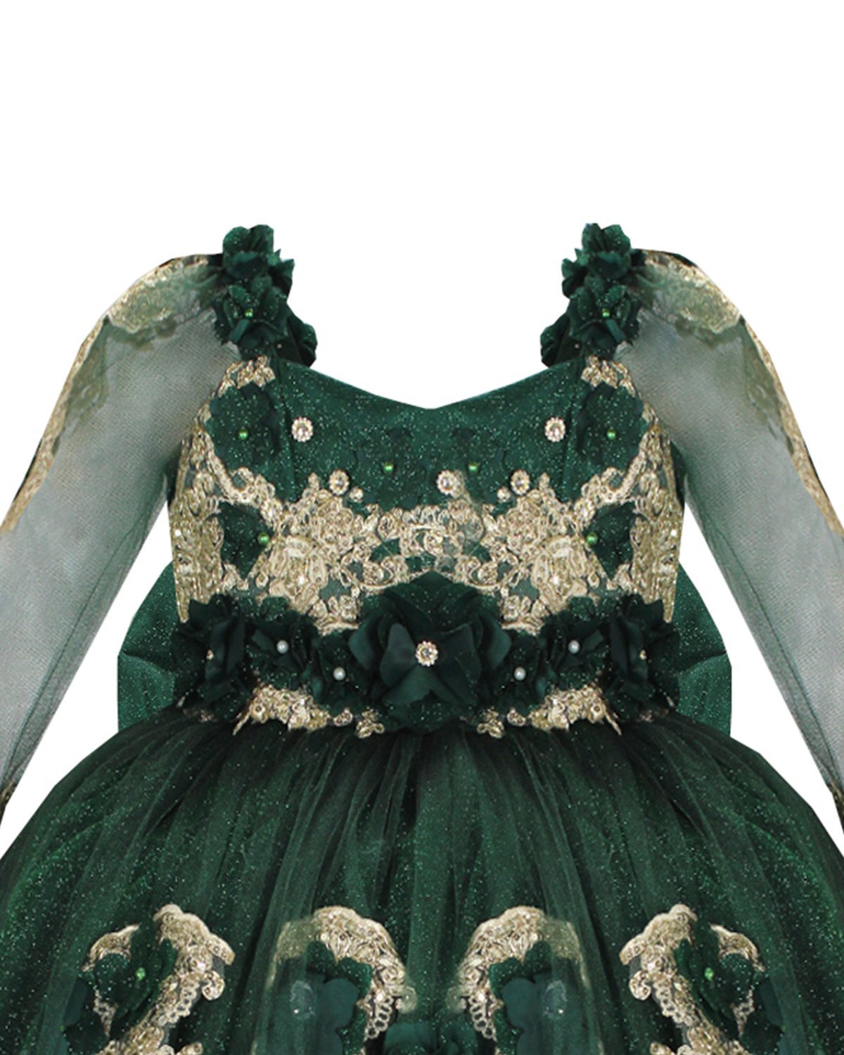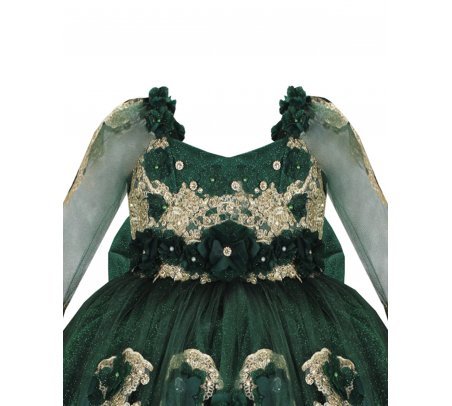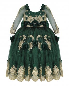 Elevate your child's style with this stunning party dress. Made from top-notch materials for comfort, it features golden appliqués for a luxurious touch and 3D embroidery on the sleeves. The 3D floral finish adds a princess-like charm, making it the perfect dress for any special occasion.