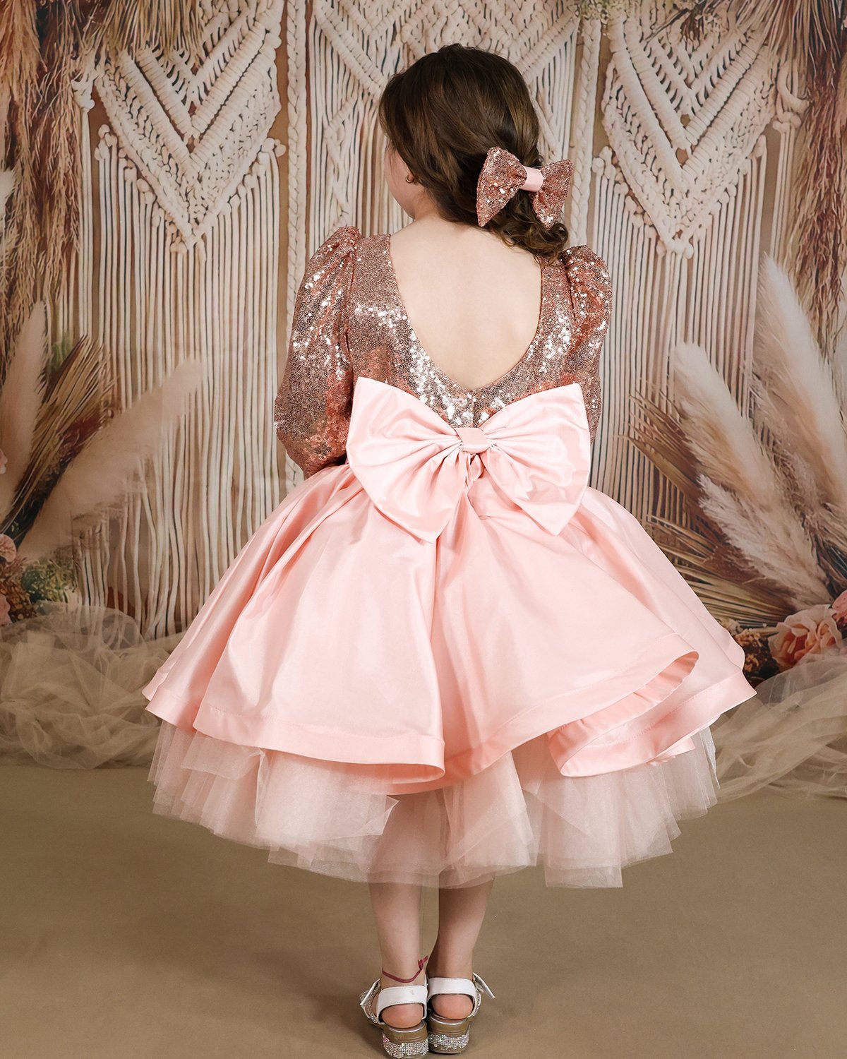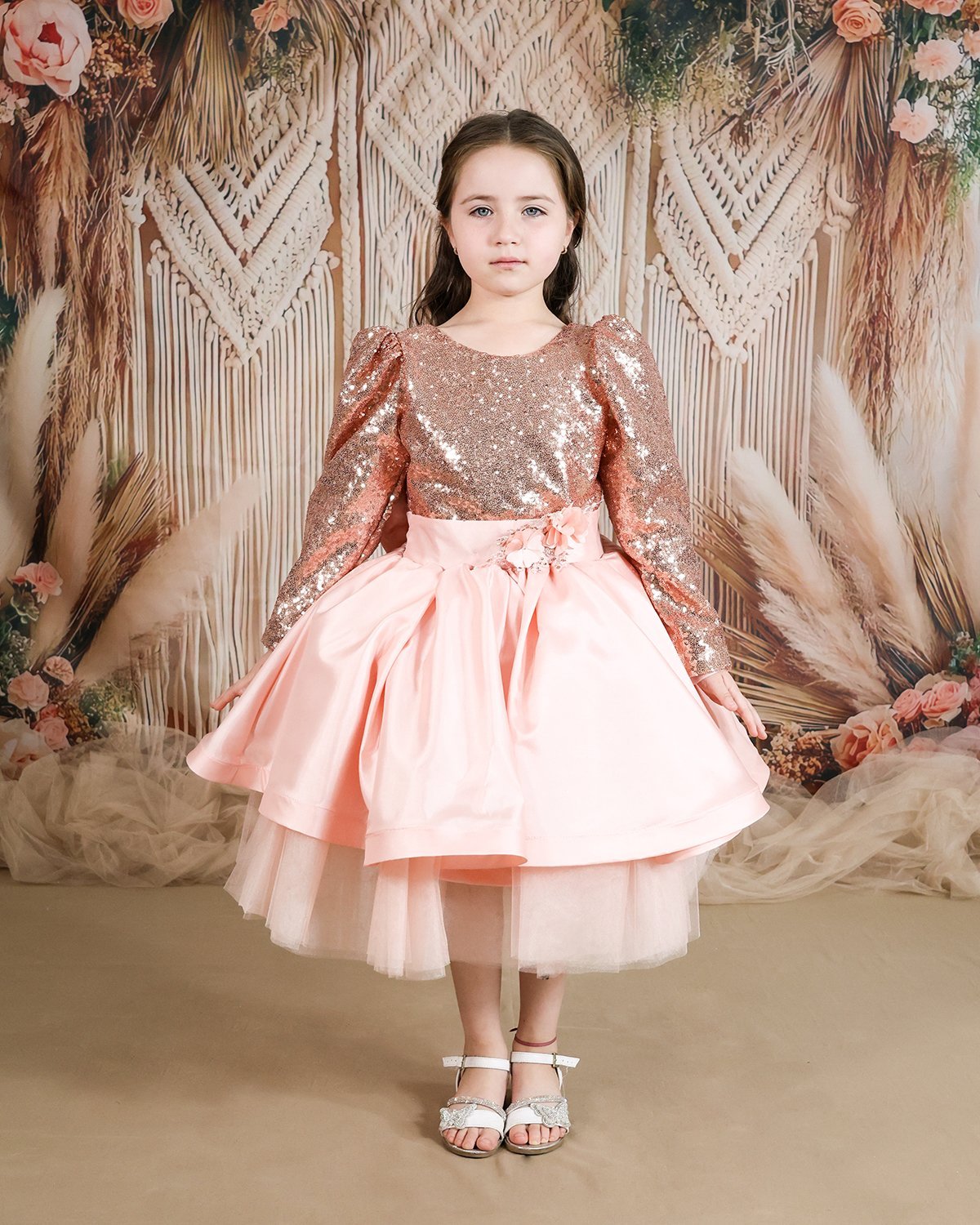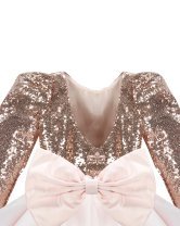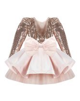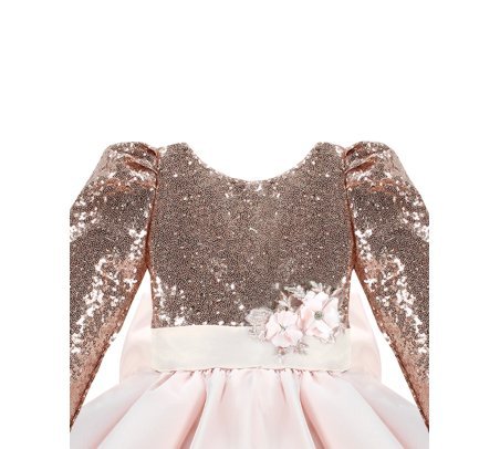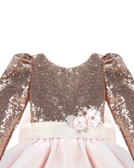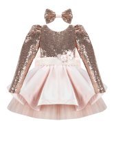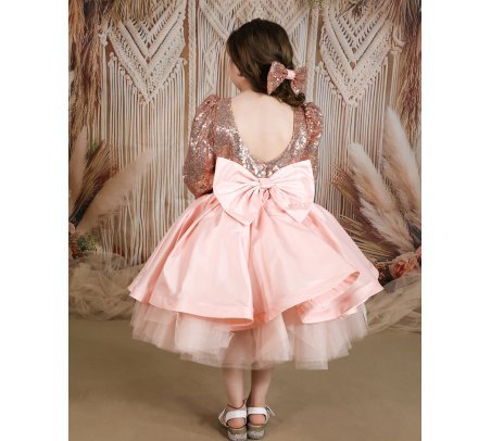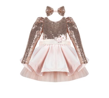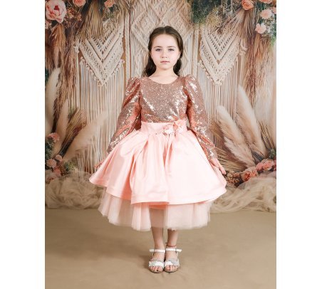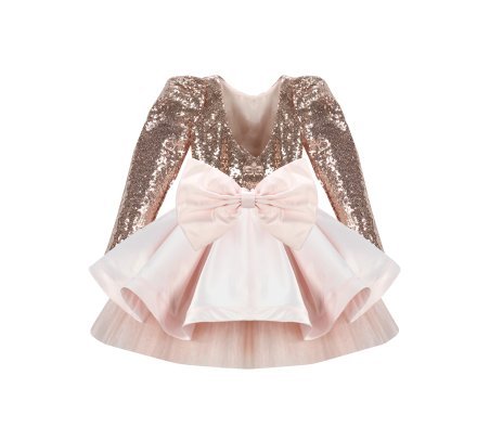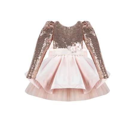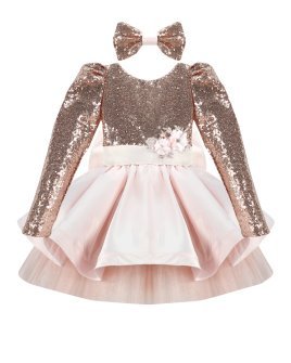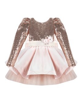 Short dress for girls with sequin blouse and fine tulle skirt with taffeta overlay.