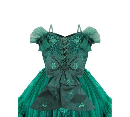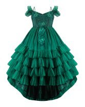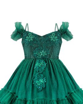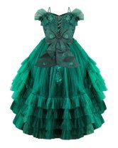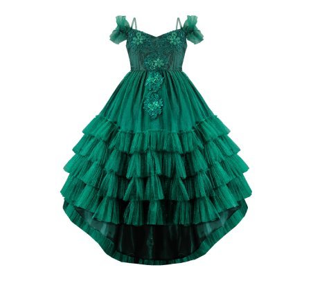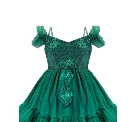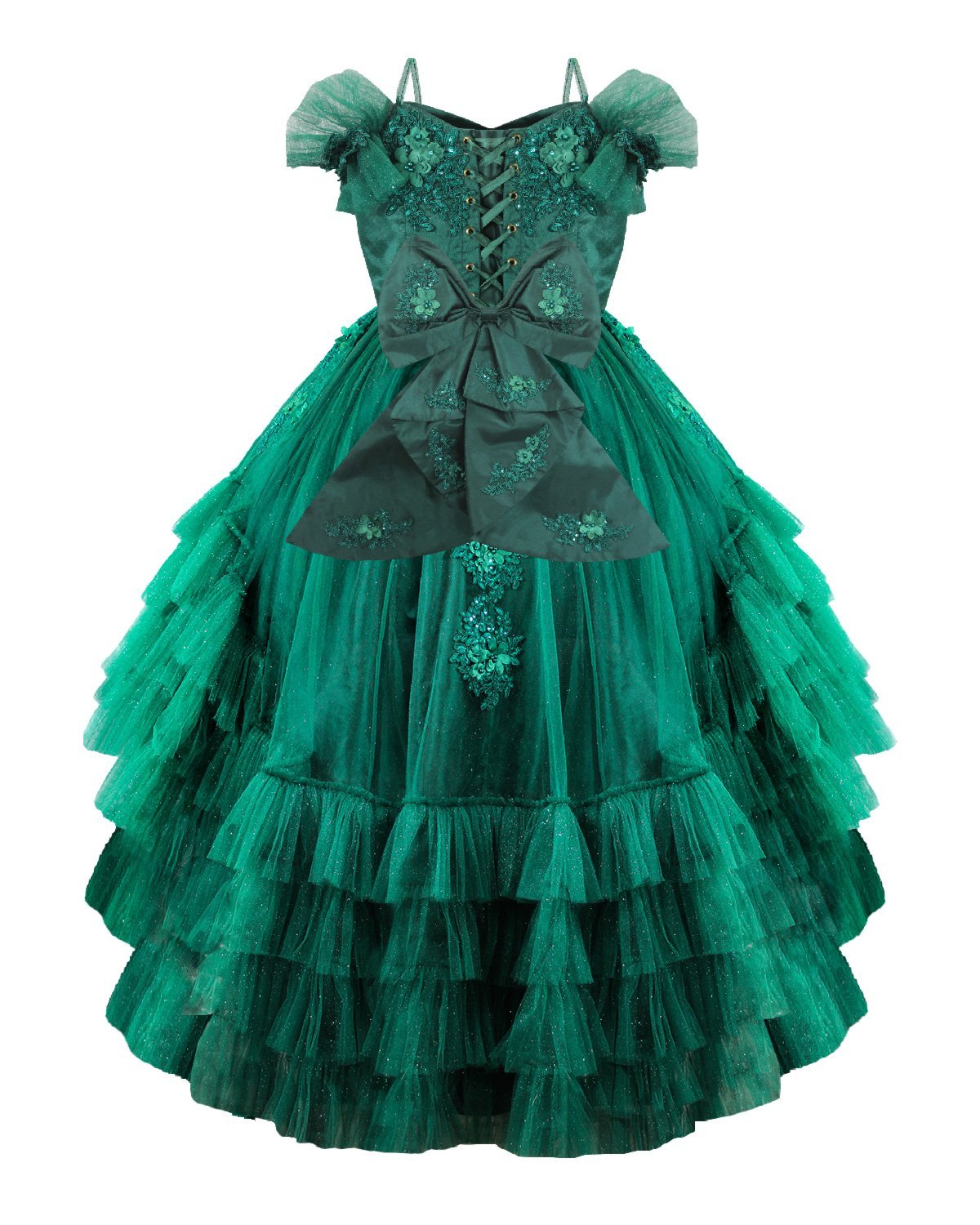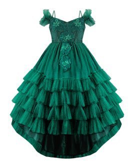 Nicolle Party Dress for Girls, made of glitter tulle with thin strap corset, ruffles, embroidery, 3D flowers, pearls, and medallions. Skirt with train and cascading ruffles.