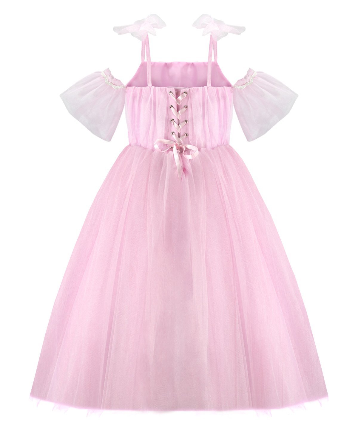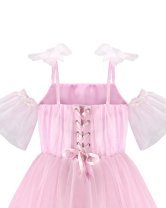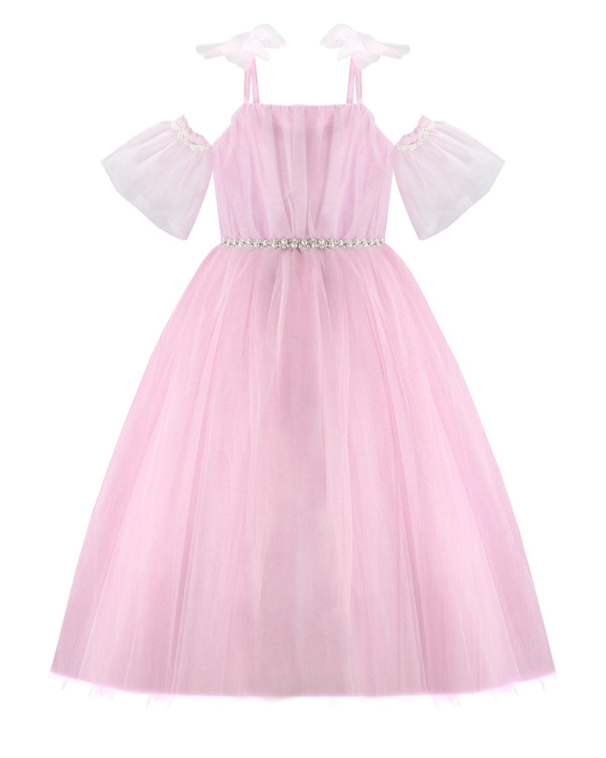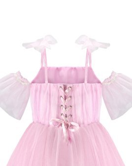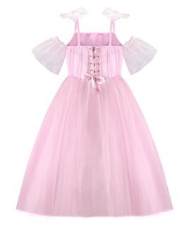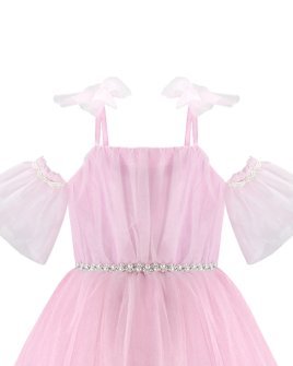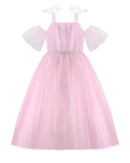 Girl’s dress made of tulle and lining, with a draped bodice, straight neckline, corset back, thin straps, and a tulle bow.