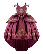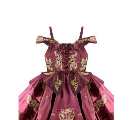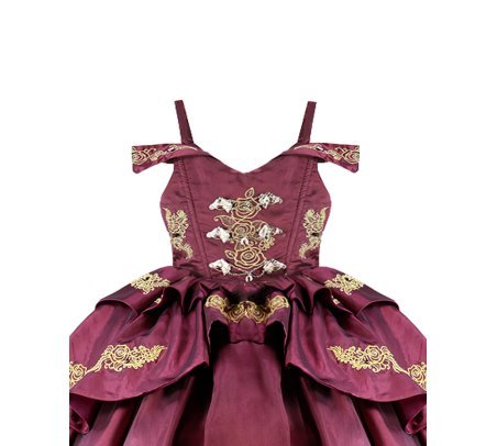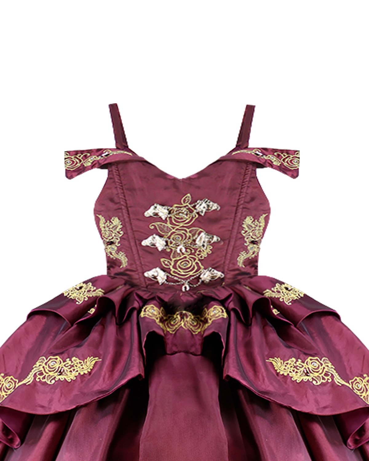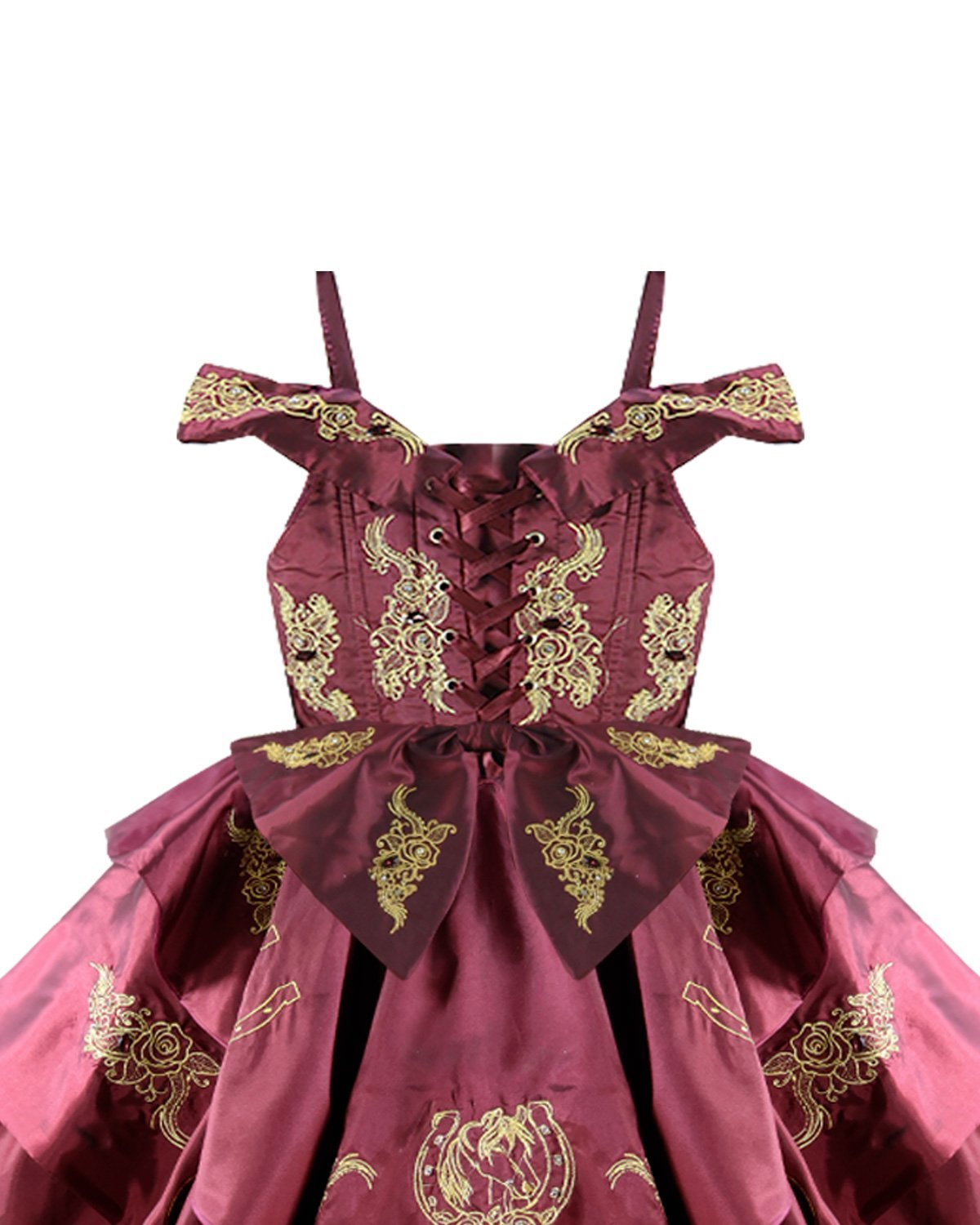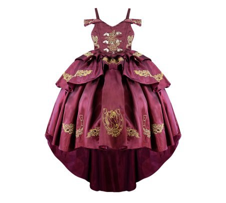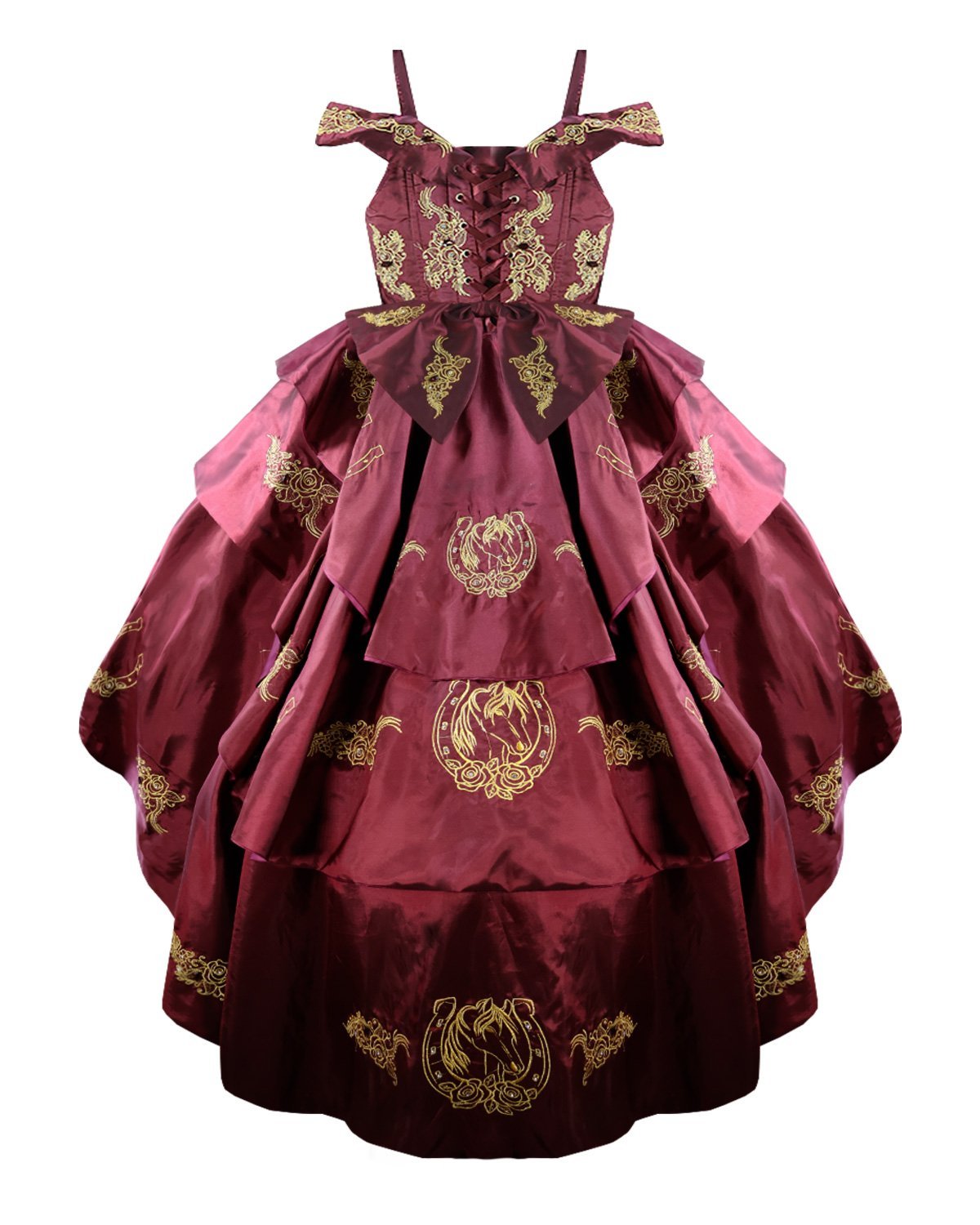 Taffeta girl’s dress with a train and golden embroidery of horseshoes, horses, and flowers. Charro model.