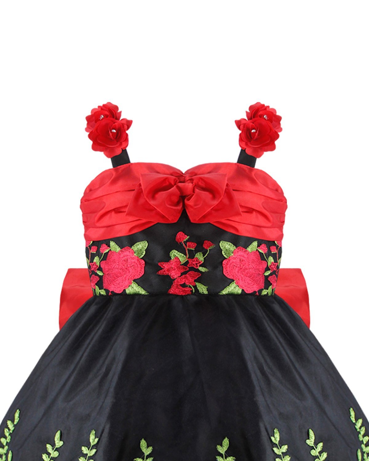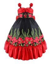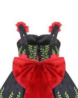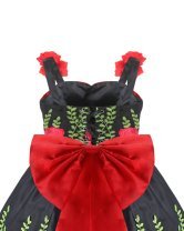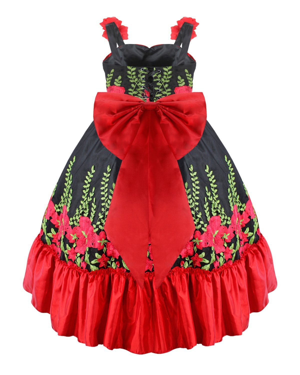Rosalinda Mexican style dress in taffeta and embroidered tulle, with red flowers, green details, and an elegant back bow.