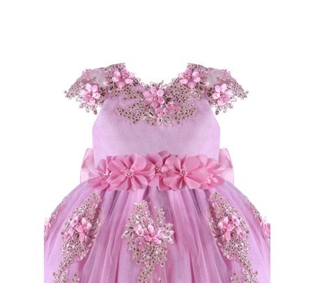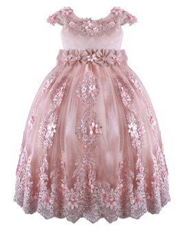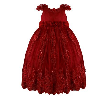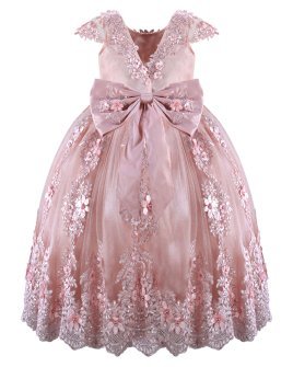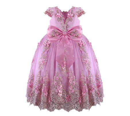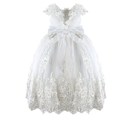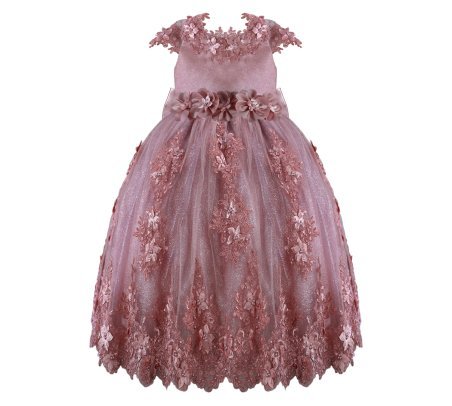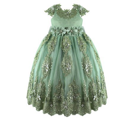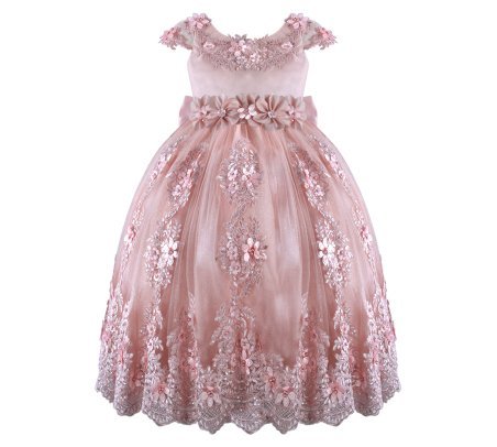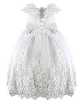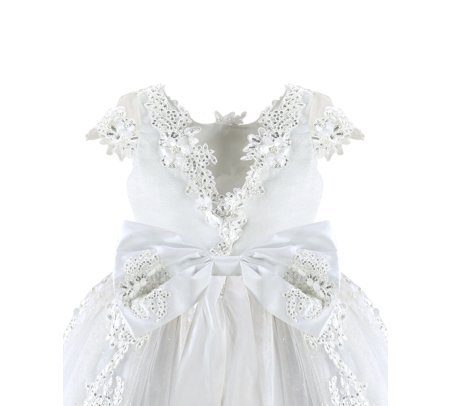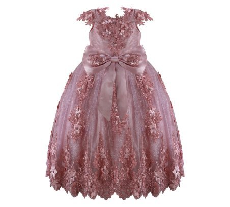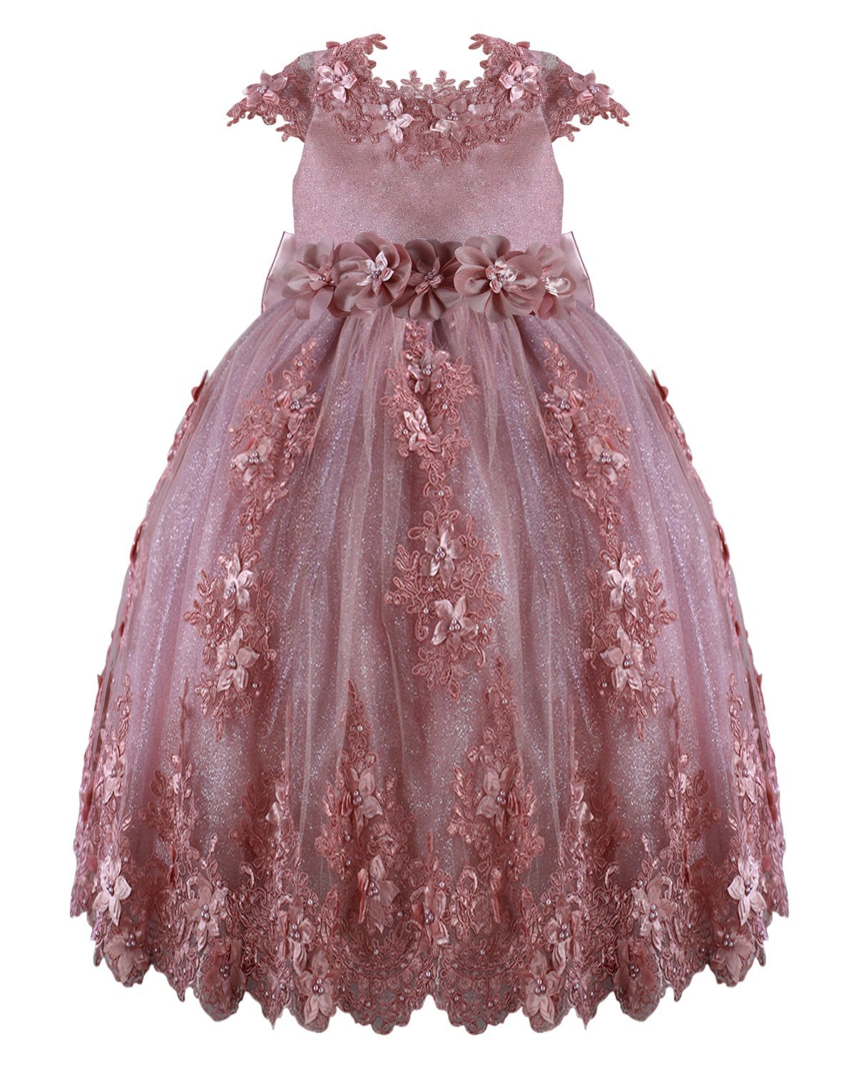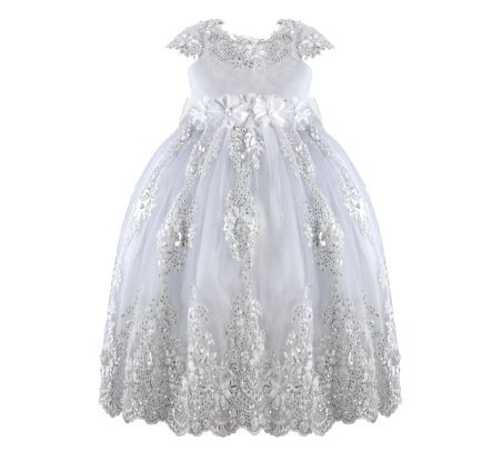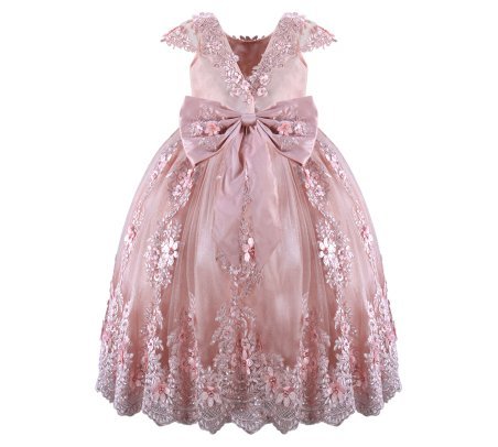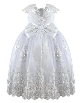Romina Girl’s Dress, princess cut, with embroidered taffeta bodice, handmade flowers, short sleeves, large bow, and glitter tulle skirt with embroidered medallions.