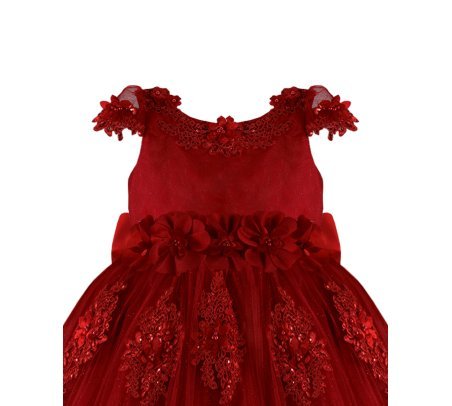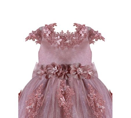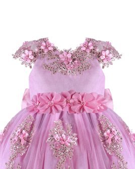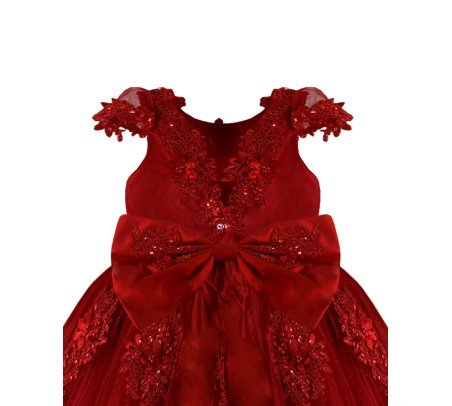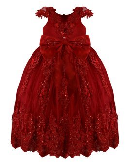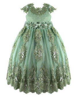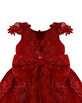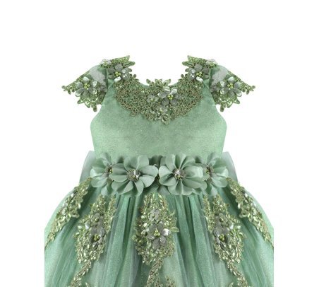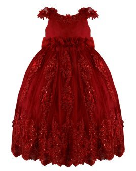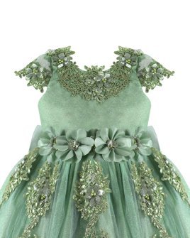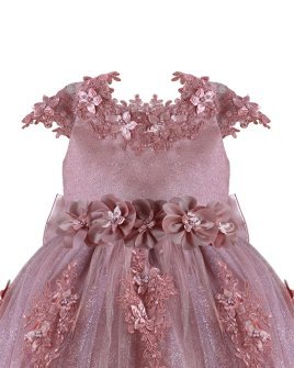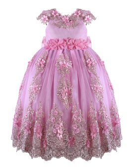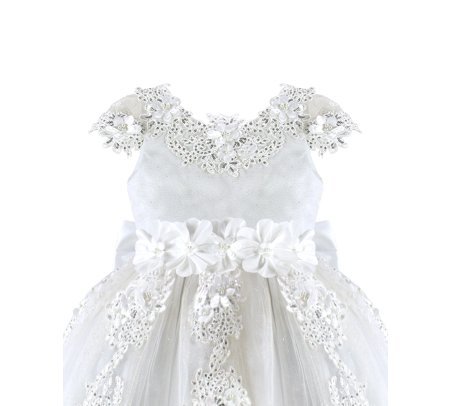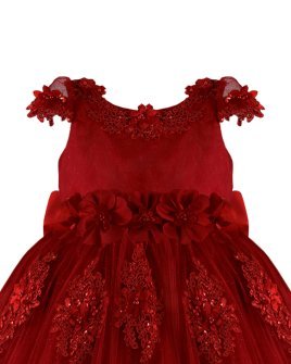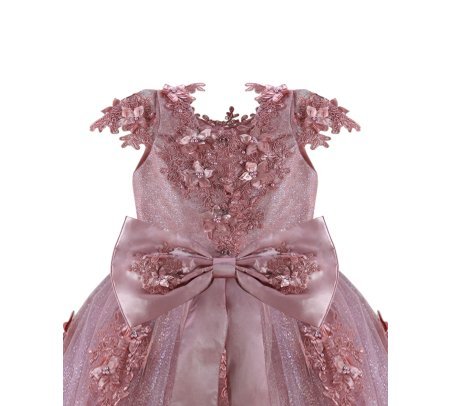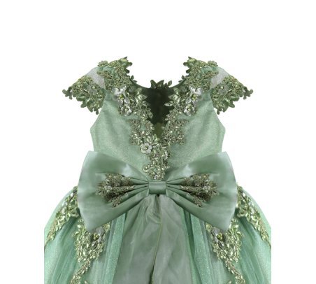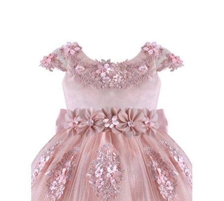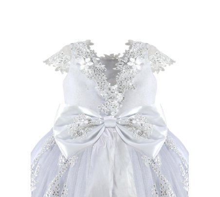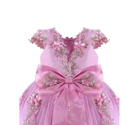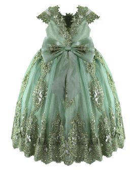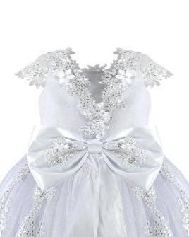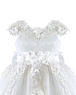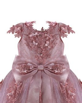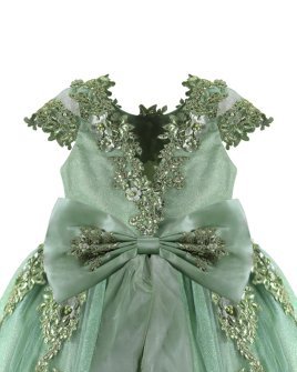 The Romina Girl’s Dress is a dreamy piece with a refined princess cut, perfect for occasions where elegance and style take center stage. The taffeta bodice features embroidered details and handmade floral appliqués, delicately decorated with pearls and zircon stones that accentuate the waistline. Its V-cut back and large embroidered taffeta bow add a sophisticated and romantic touch. The skirt, made of tulle and glitter tulle, showcases embroidered medallions that elevate the design’s elegance. Short sleeves provide a classic and graceful finish, making it suitable for any season. Perfect for presentations, parties, or formal celebrations.