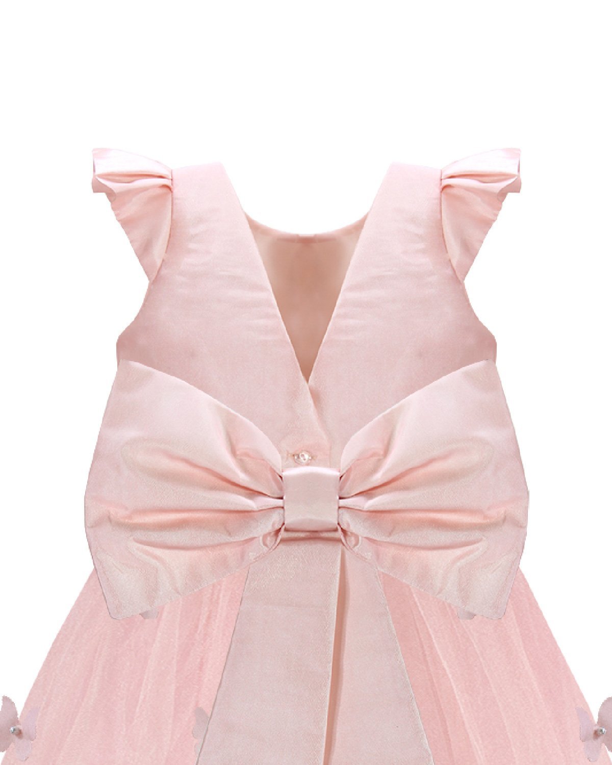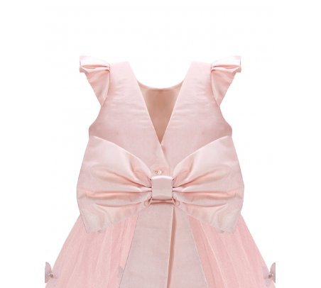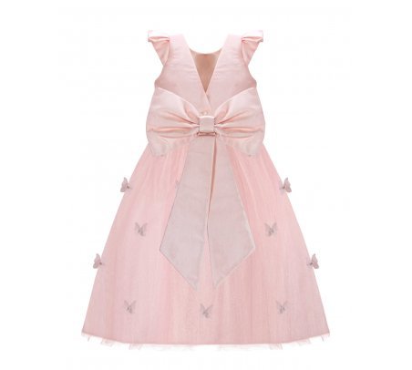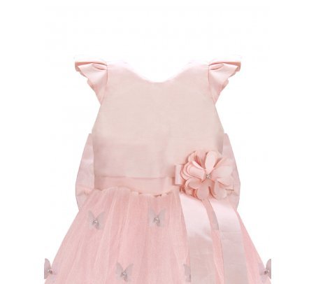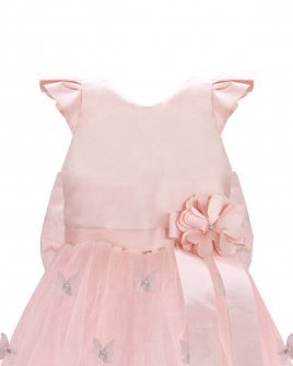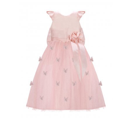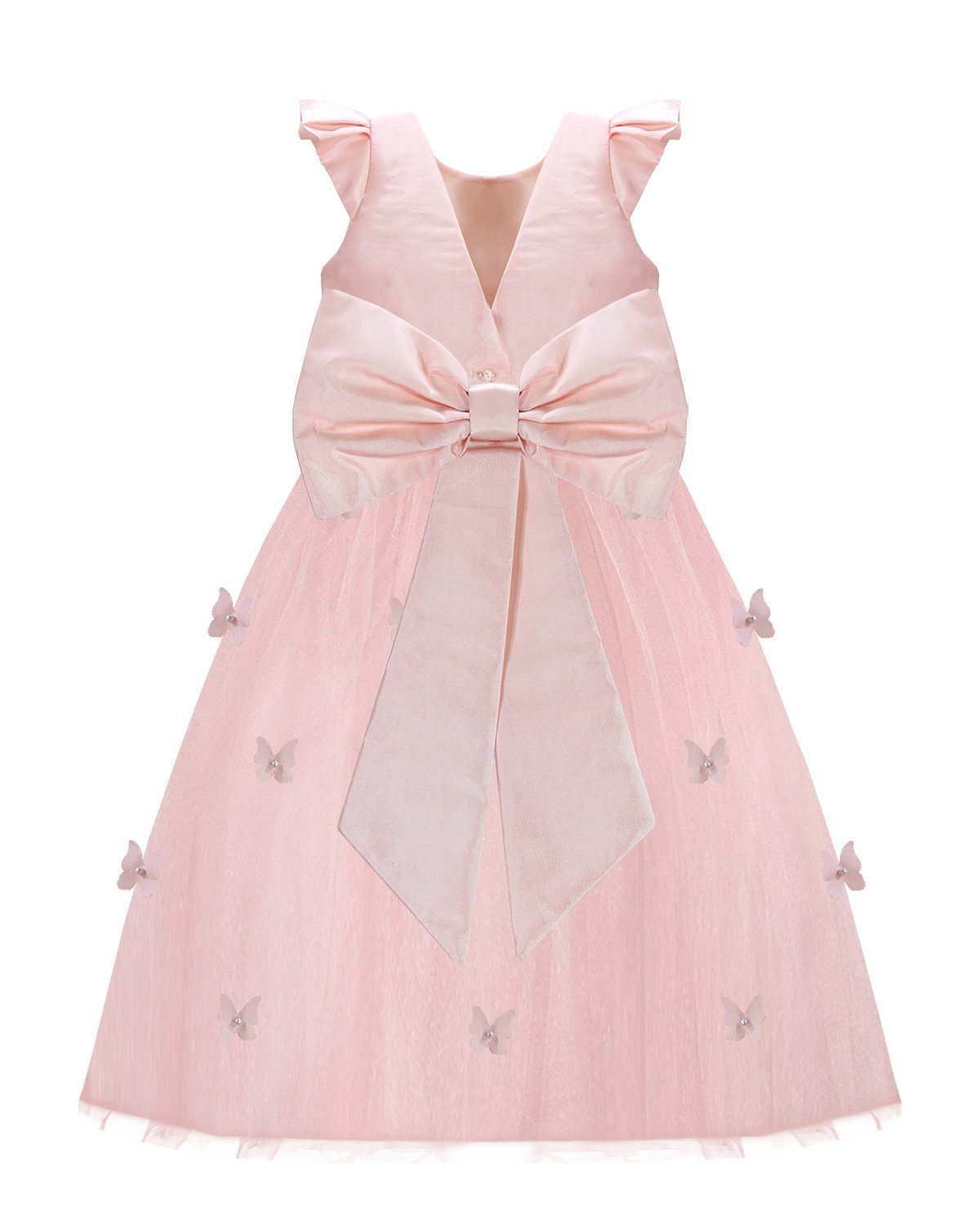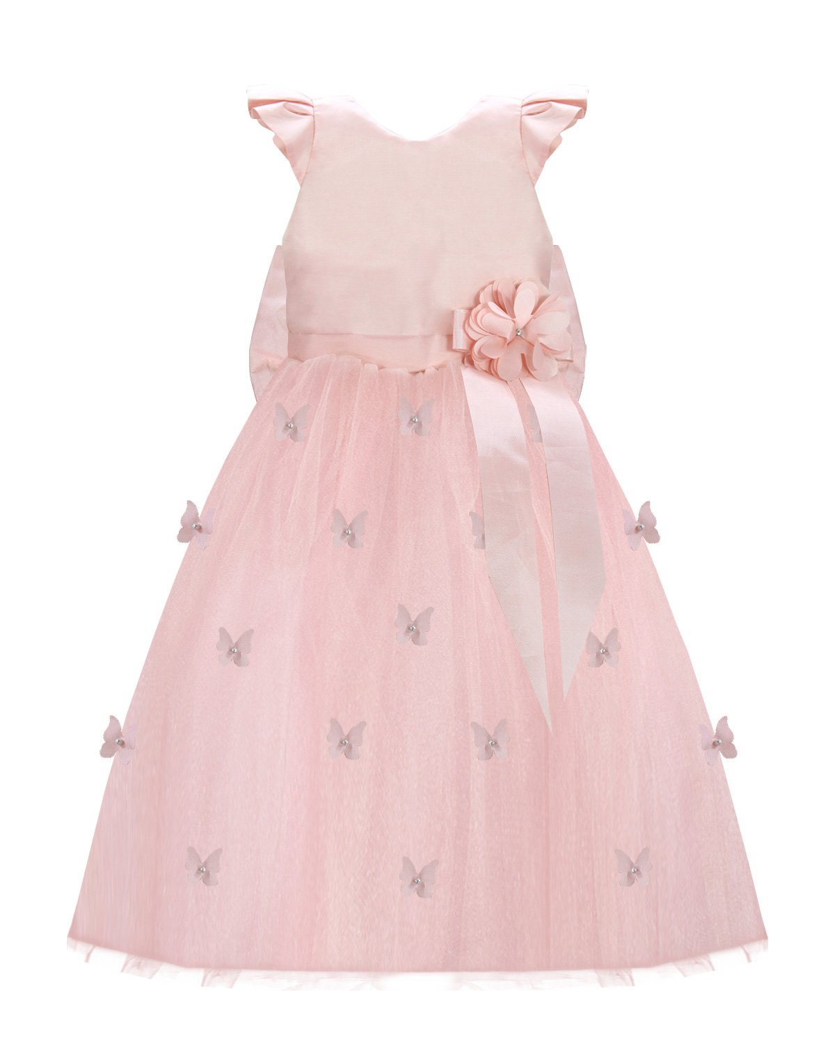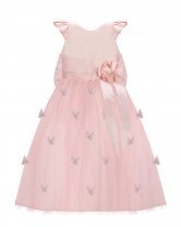Daniela Mariposa Girl’s Dress with short-sleeve bodice, tulle skirt with butterfly appliqués, and decorative waist bow.