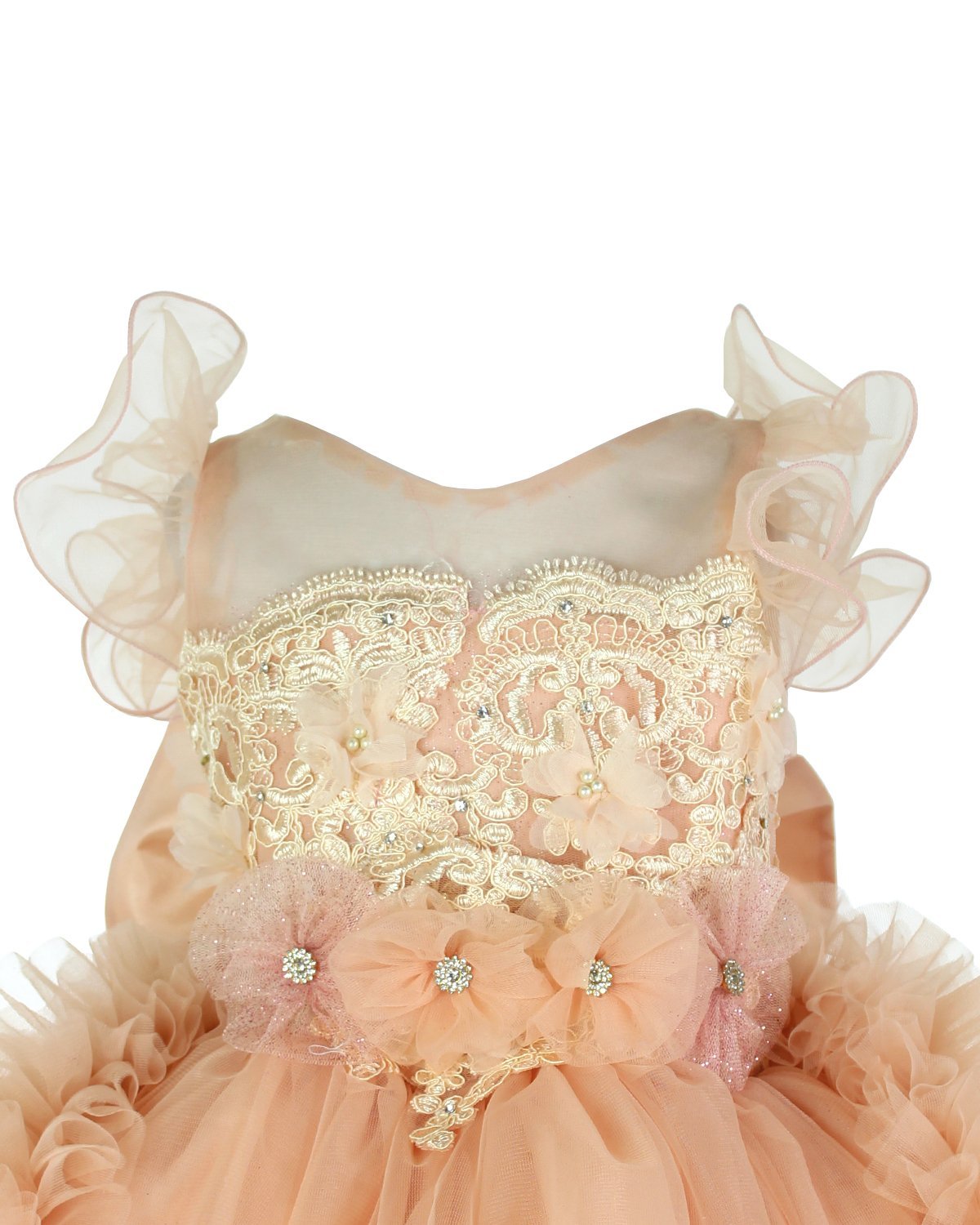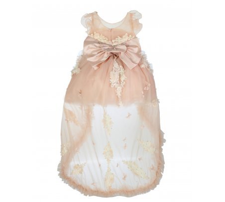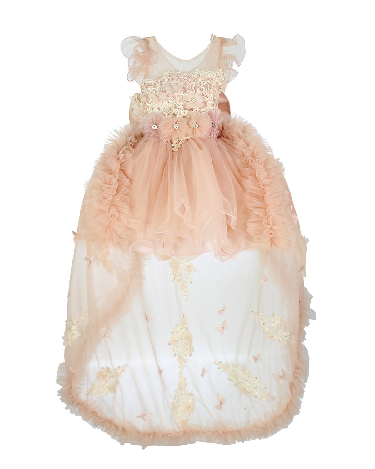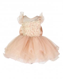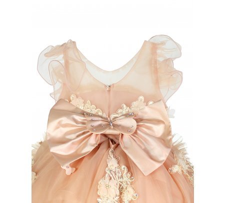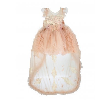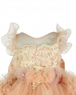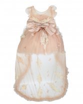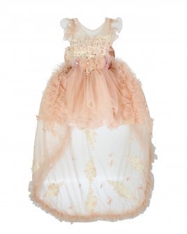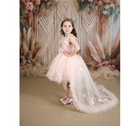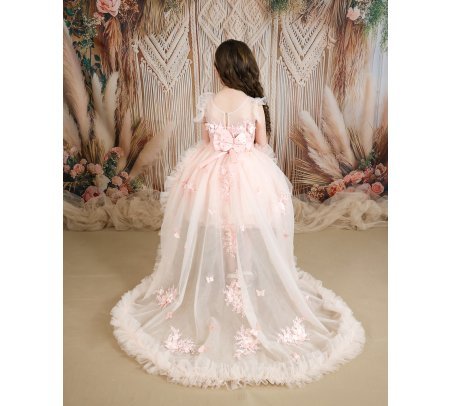 Elevate your little one's style with our stunning short dress. Featuring a tricot skirt with ruffled finishes, a long train adorned with 3D butterflies and flowers, and a tricot blouse with 3D flowers and butterflies, this dress is perfect for special occasions.