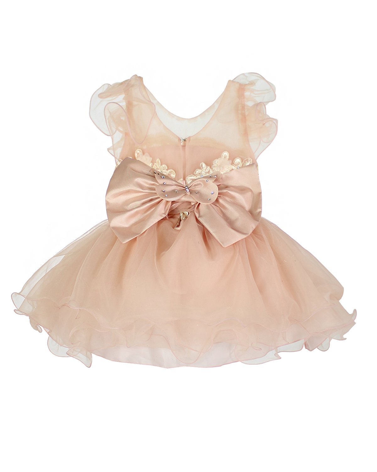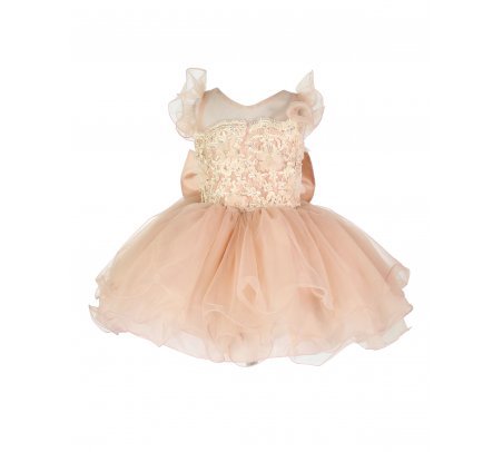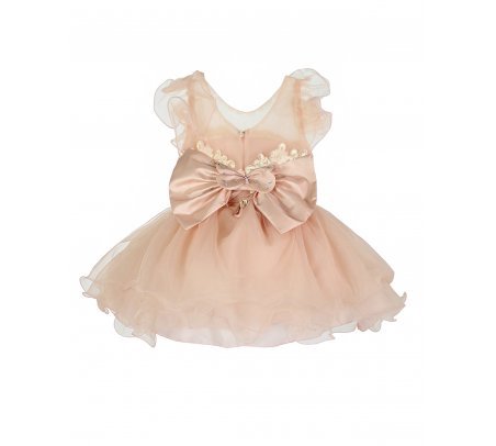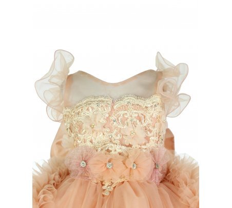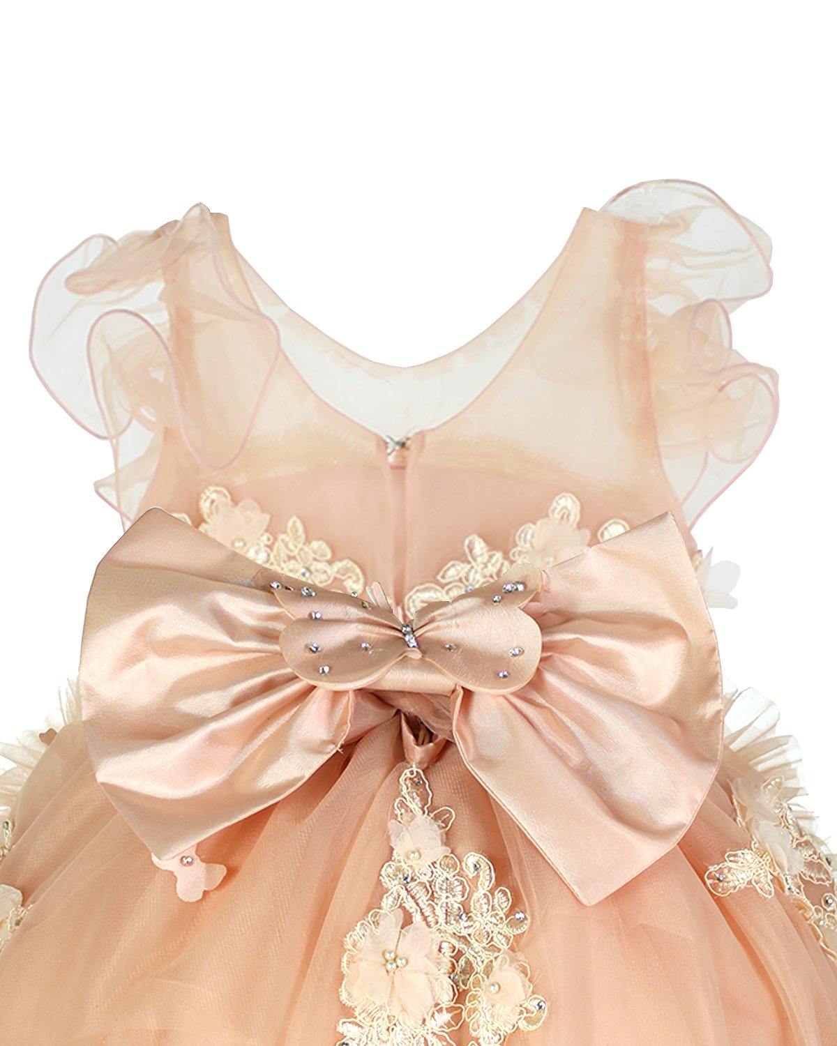 Elevate your little one's style with our stunning short dress. Featuring a tricot skirt with ruffled finishes, a long train adorned with 3D butterflies and flowers, and a tricot blouse with 3D flowers and butterflies, this dress is perfect for special occasions.