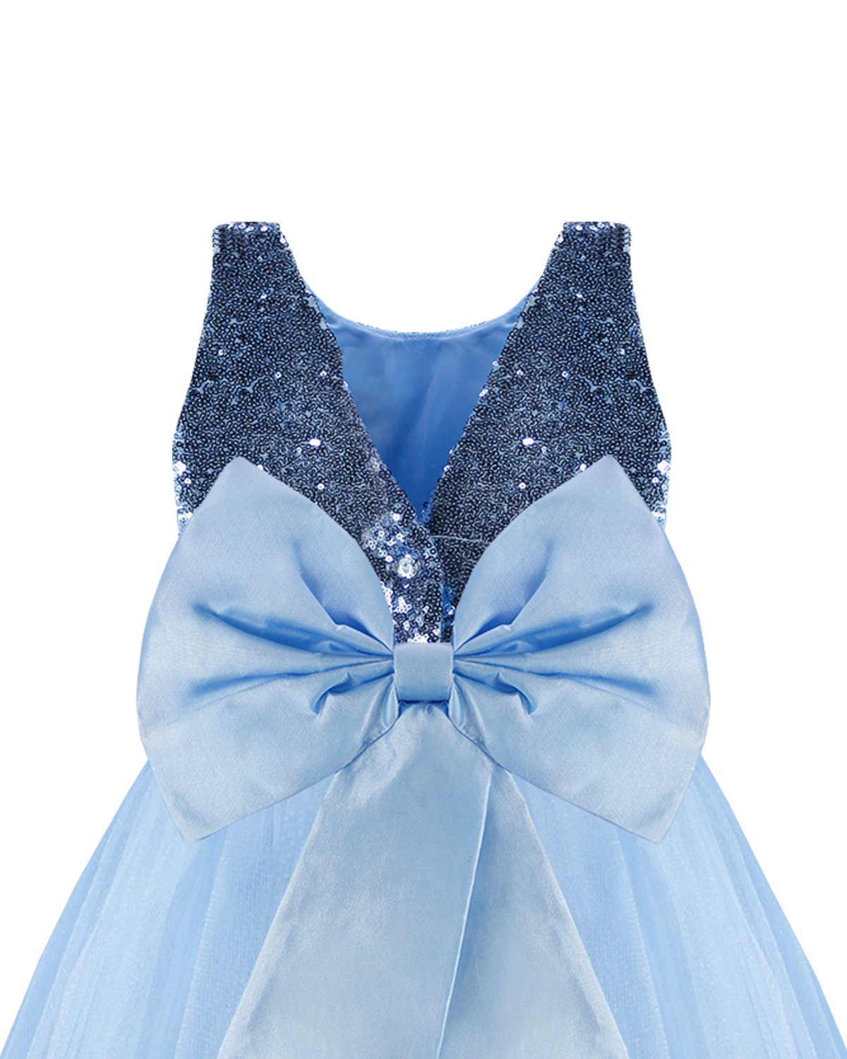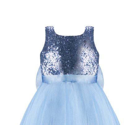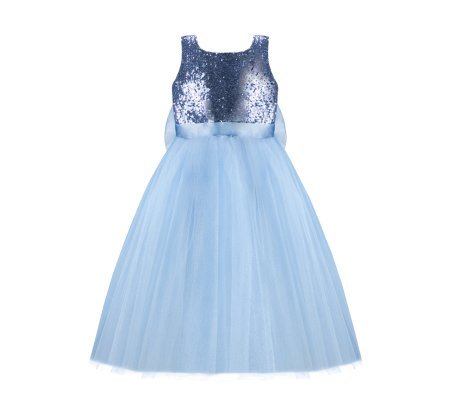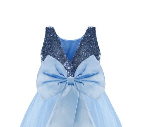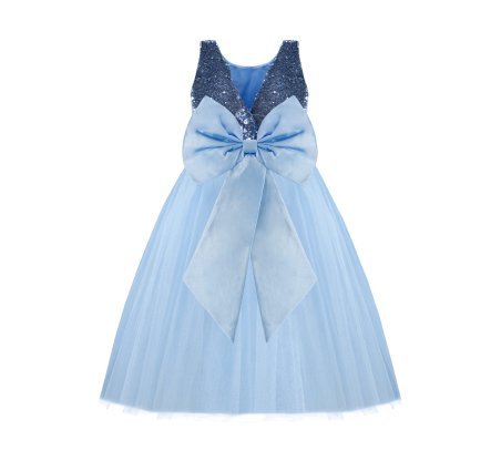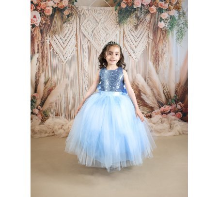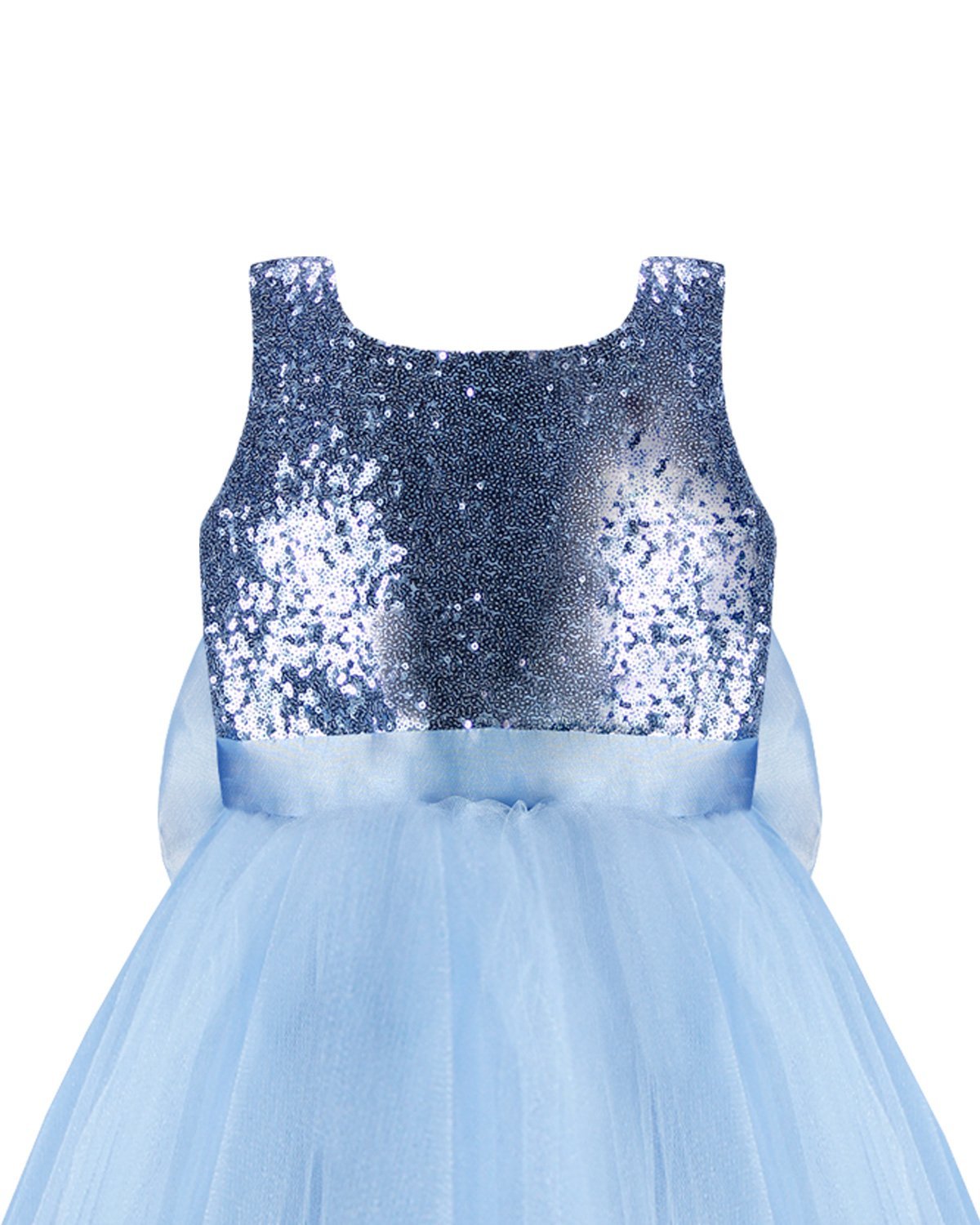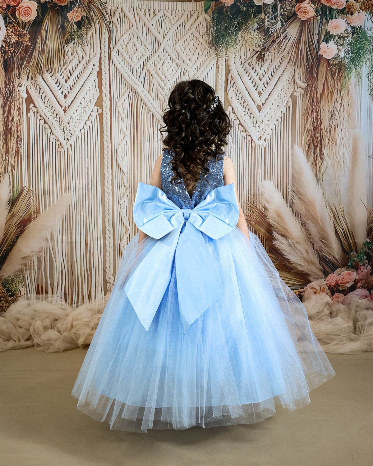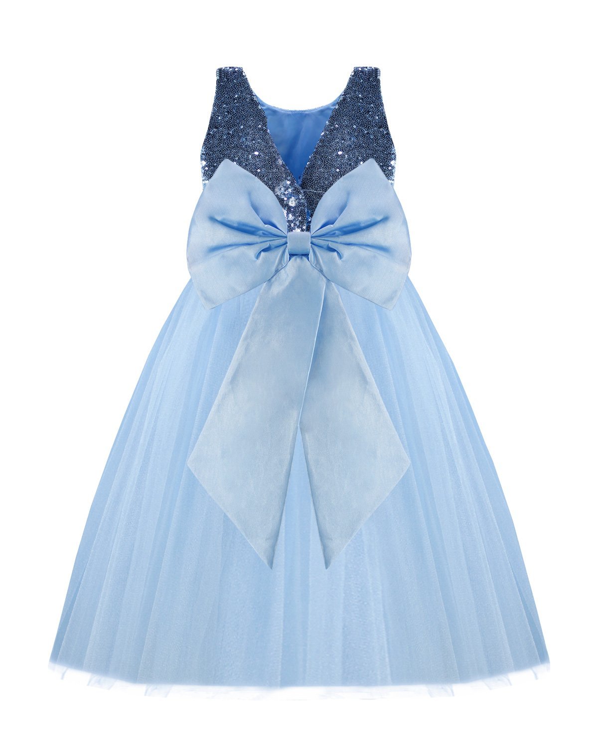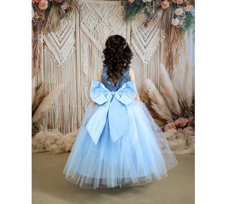 Beautiful and elegant girl's dress, made of tulle with sequin detail on the bodice and an elegant bow on the back.