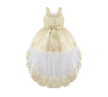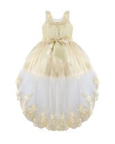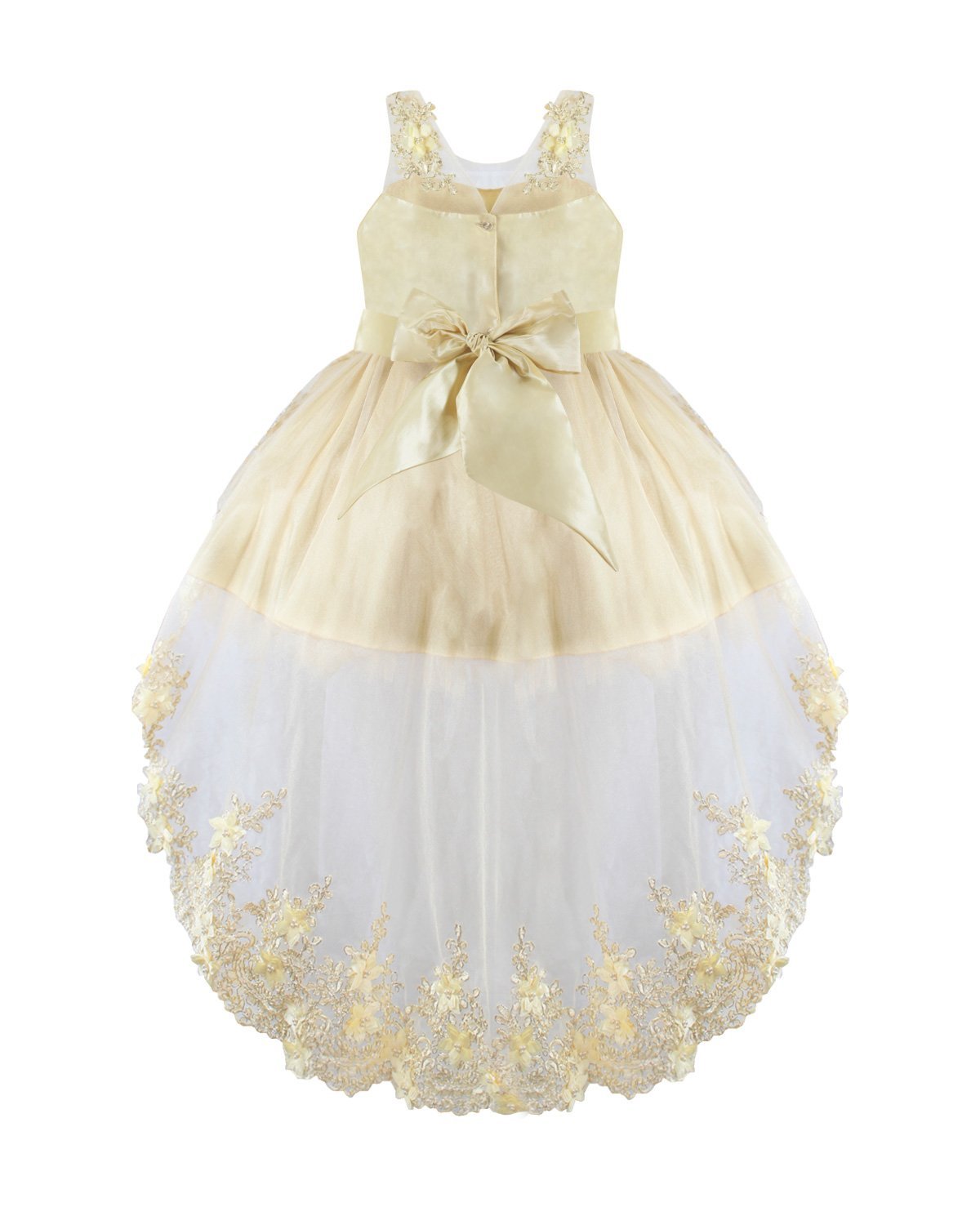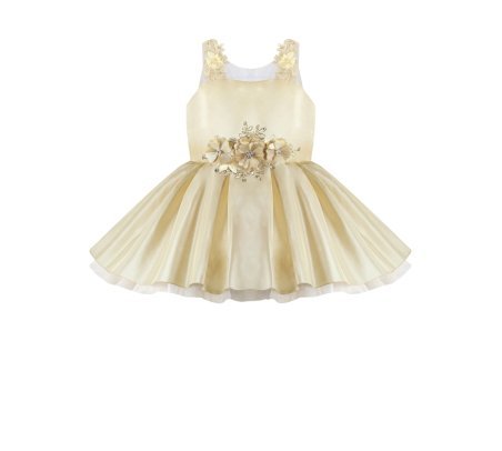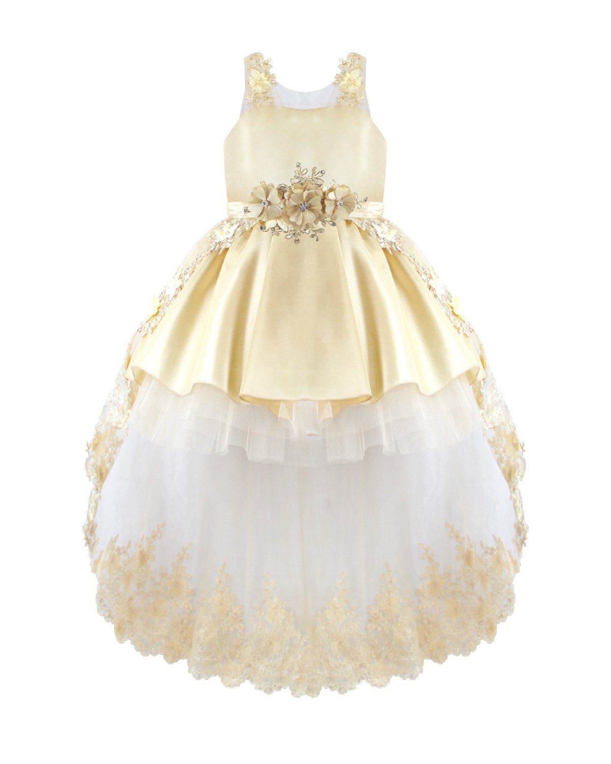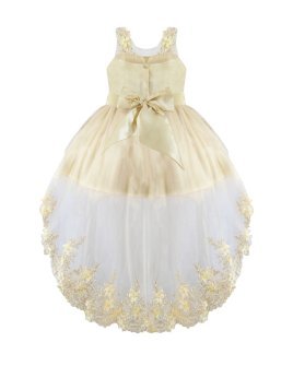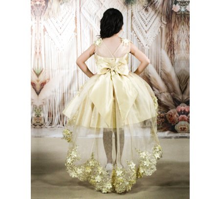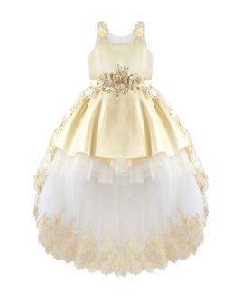 Girl's dress elegant short tulle and taffeta skirt with appliqués of embroidered flowers with a 3D finish, pearls and rhinestones stones with detachable tail and embroidery designs.