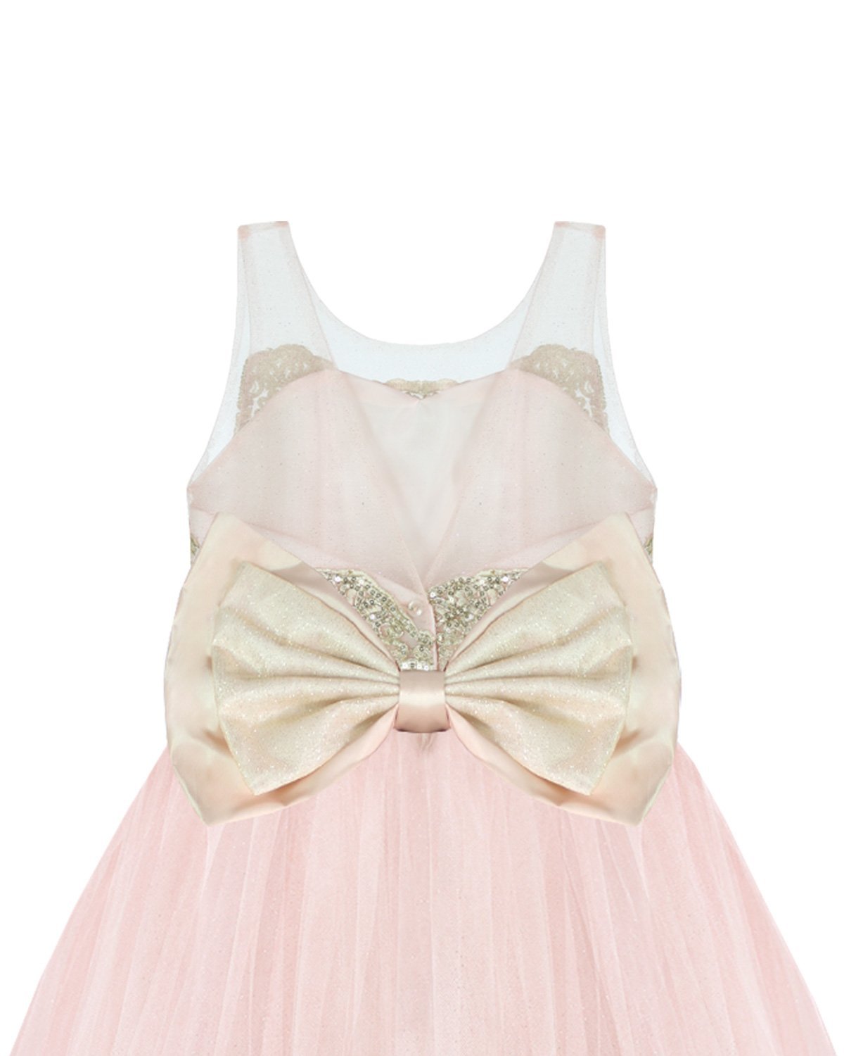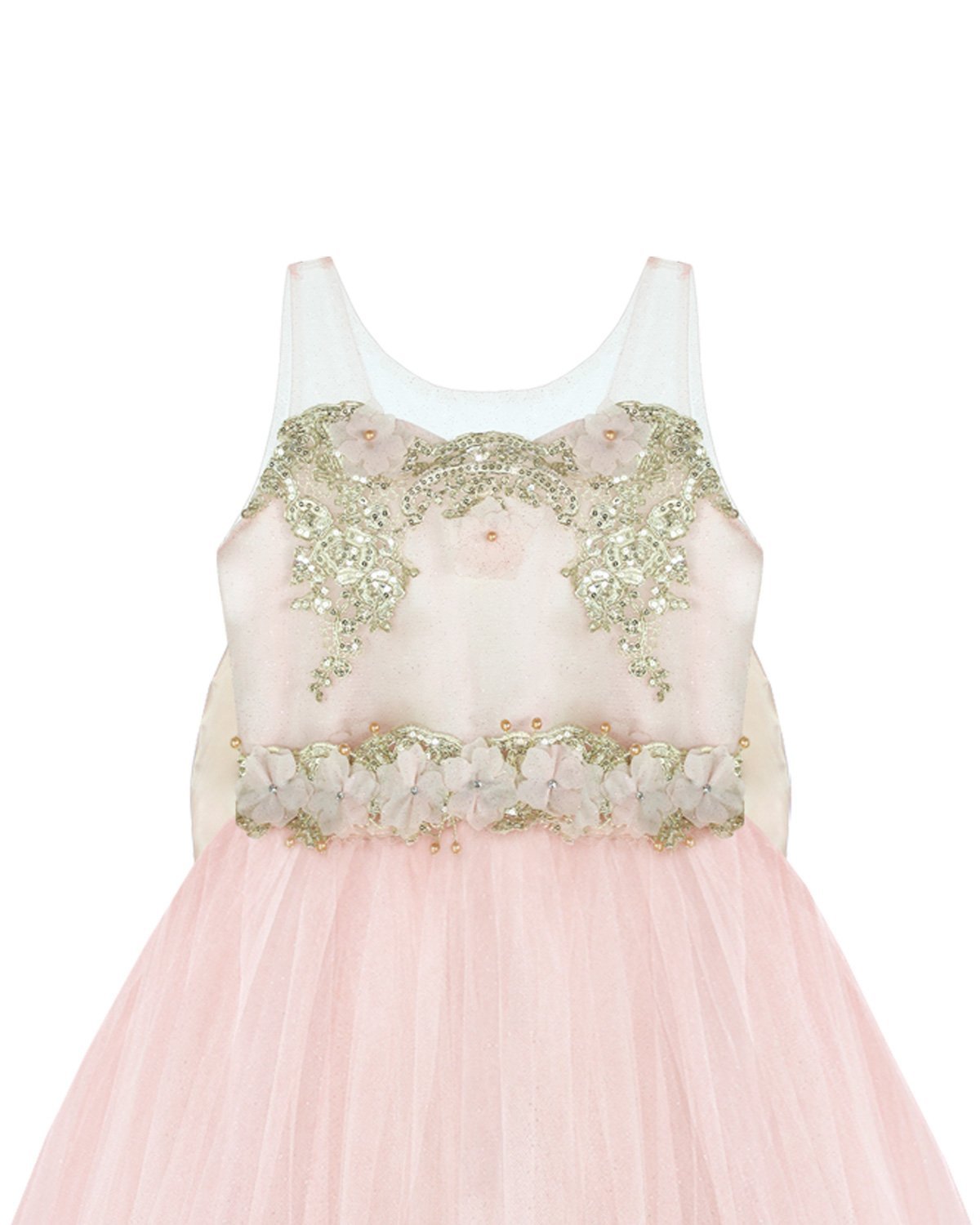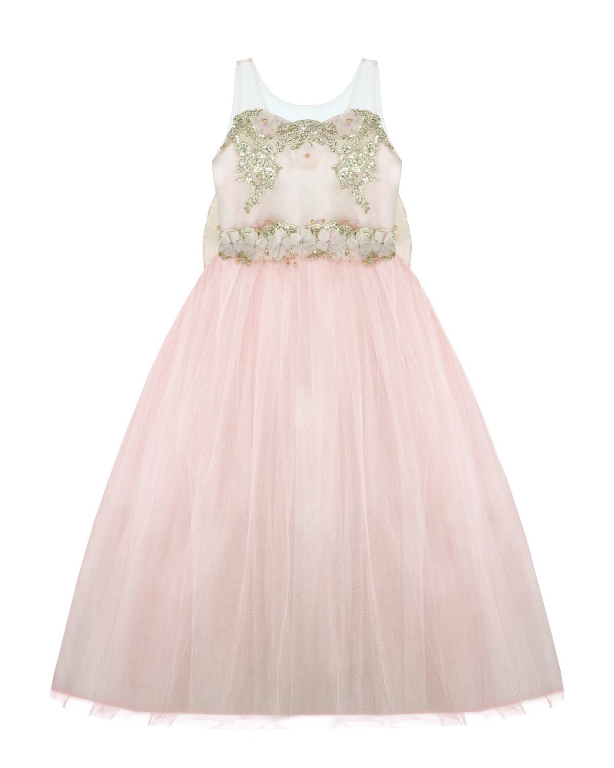Elegant girl's dress with sequin embroidery, 3D flower details with crystal beading, detachable Glitter skirt and Glitter tulle skirt with double bow decoration at the waist.