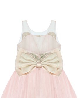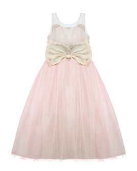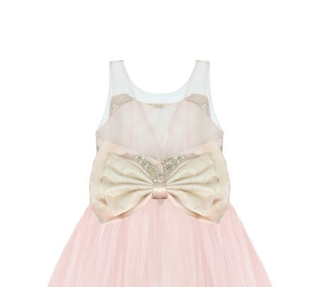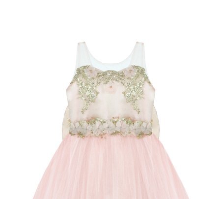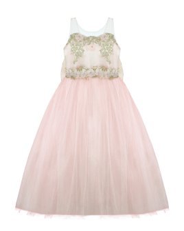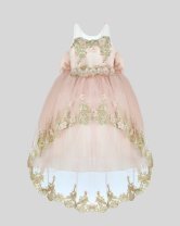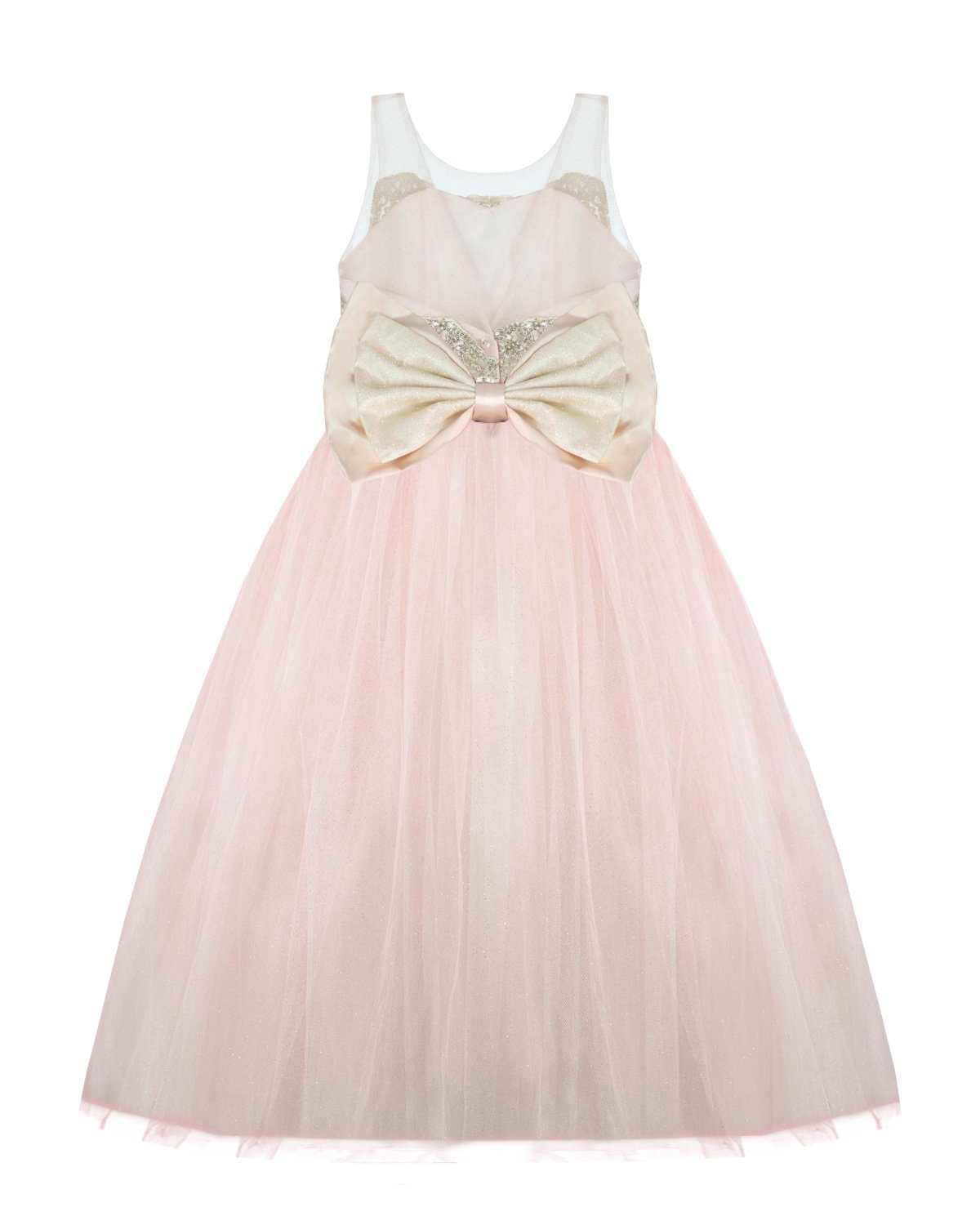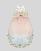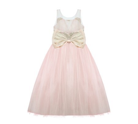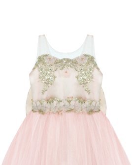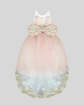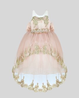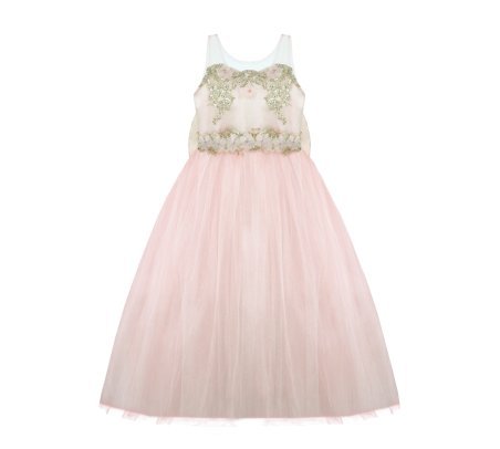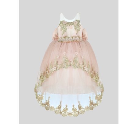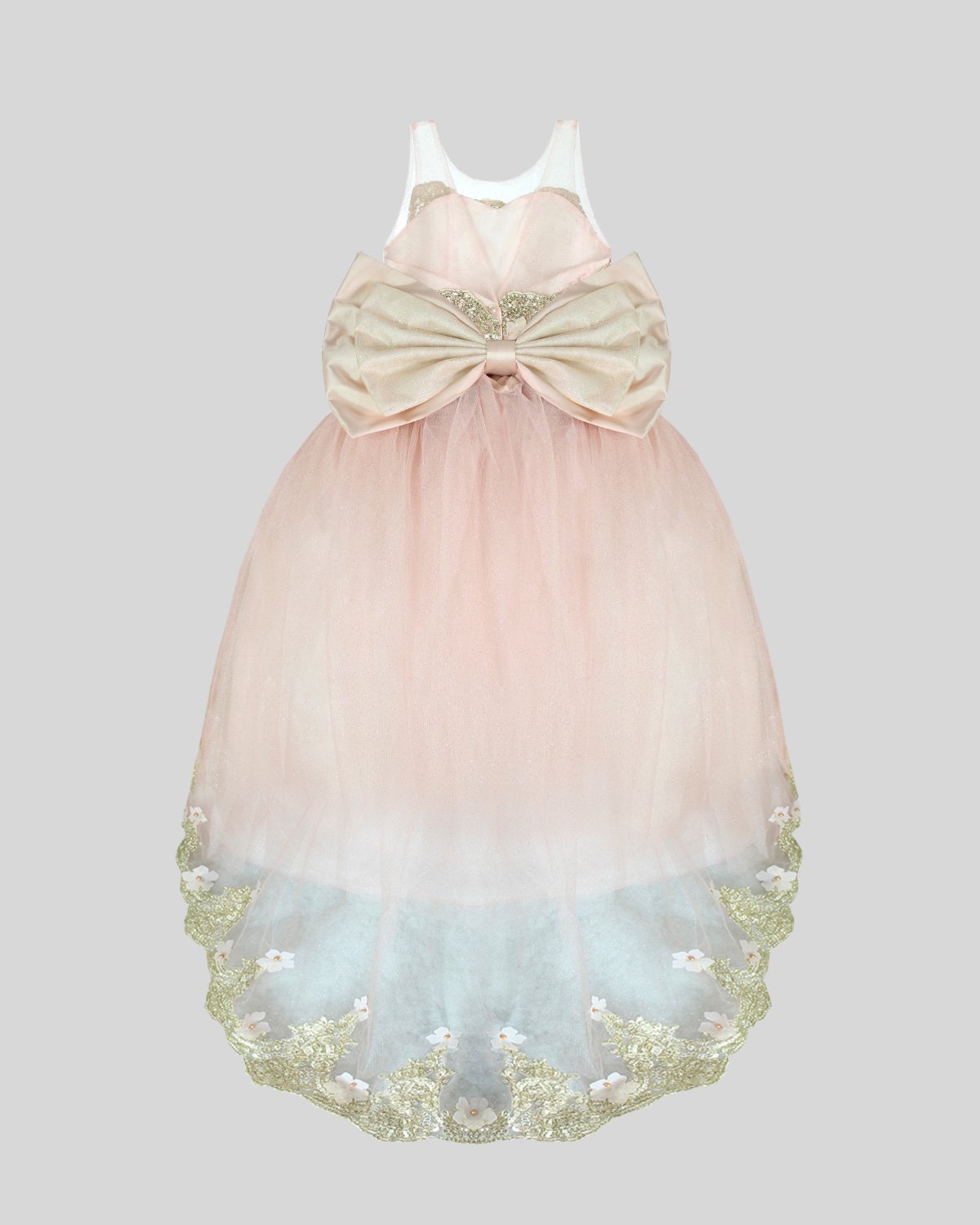 Elegant girl's dress with sequin embroidery, 3D flower details with crystal beading, detachable Glitter skirt and Glitter tulle skirt with double bow decoration at the waist.