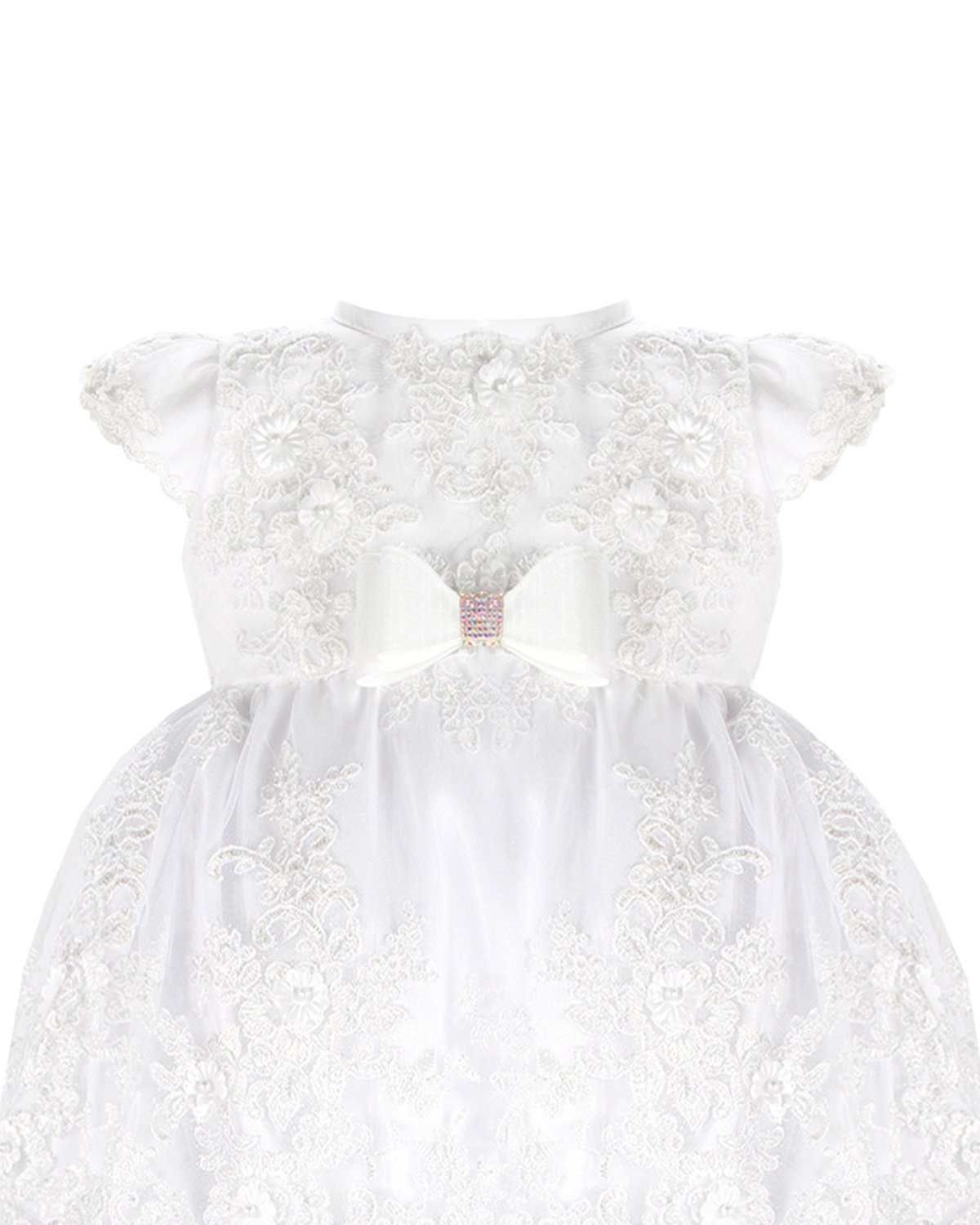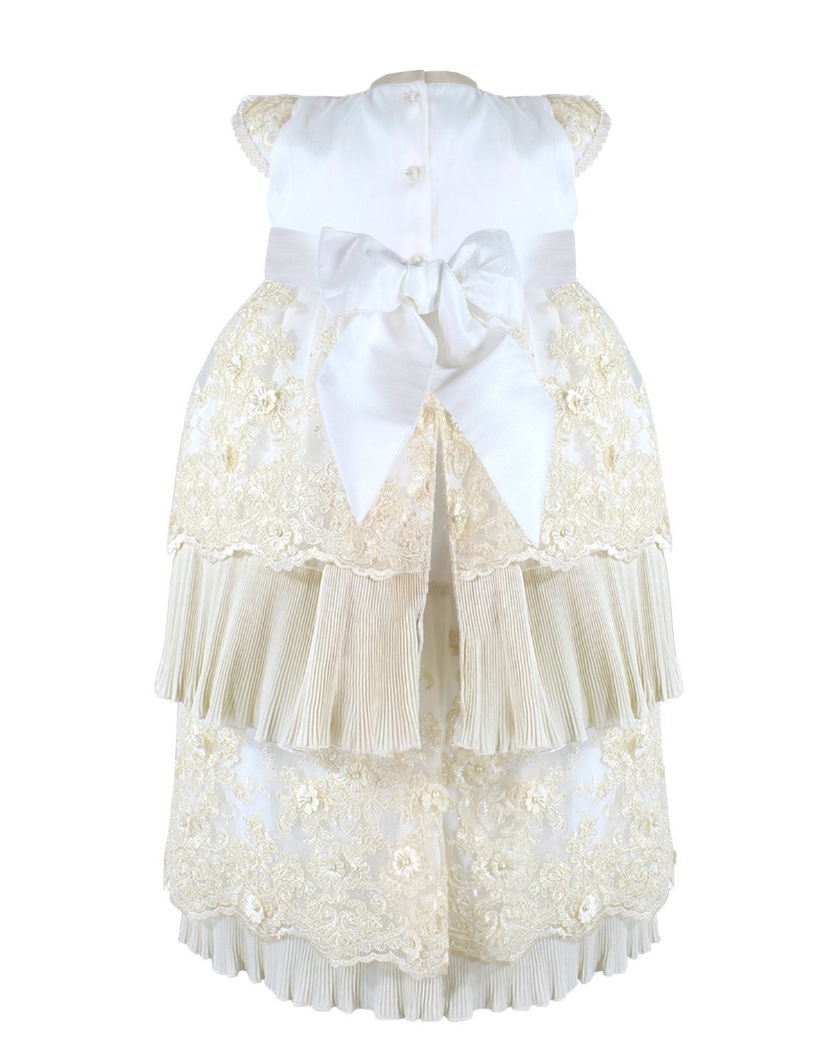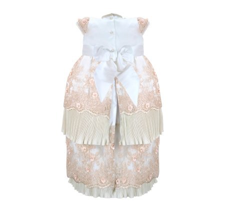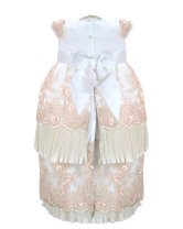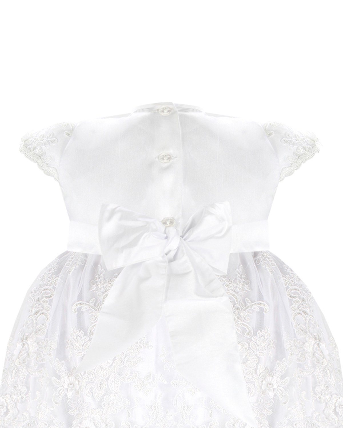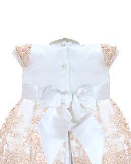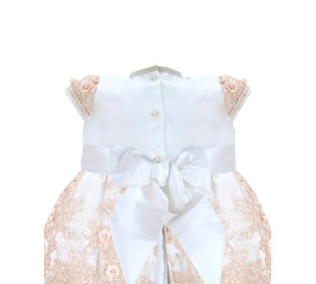 The christening gown for girls, model Melany, from the exclusive Maylin brand, is an exceptional choice for a special day. Crafted with luxurious shantung and delicate lining, it guarantees comfort and sophistication. The adorned guipure and detailed floral ornamentation make this gown unique and charming, ensuring your little girl looks dazzling on her christening day.