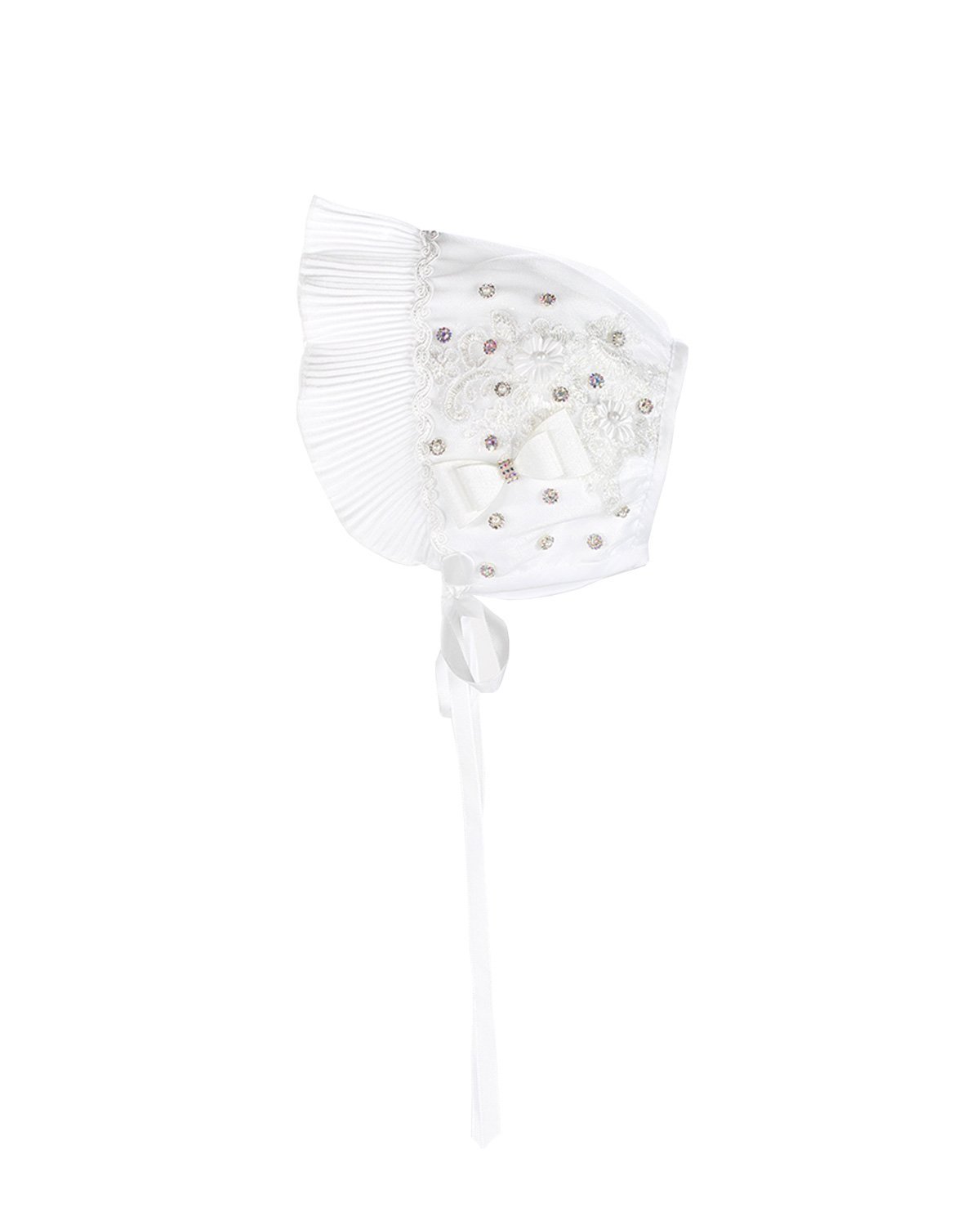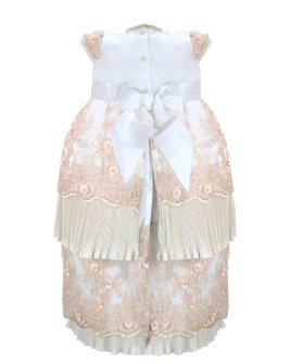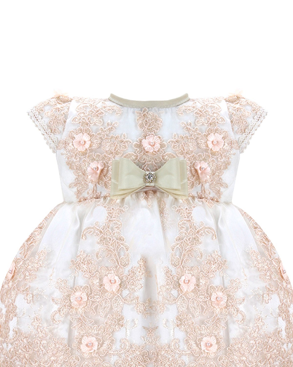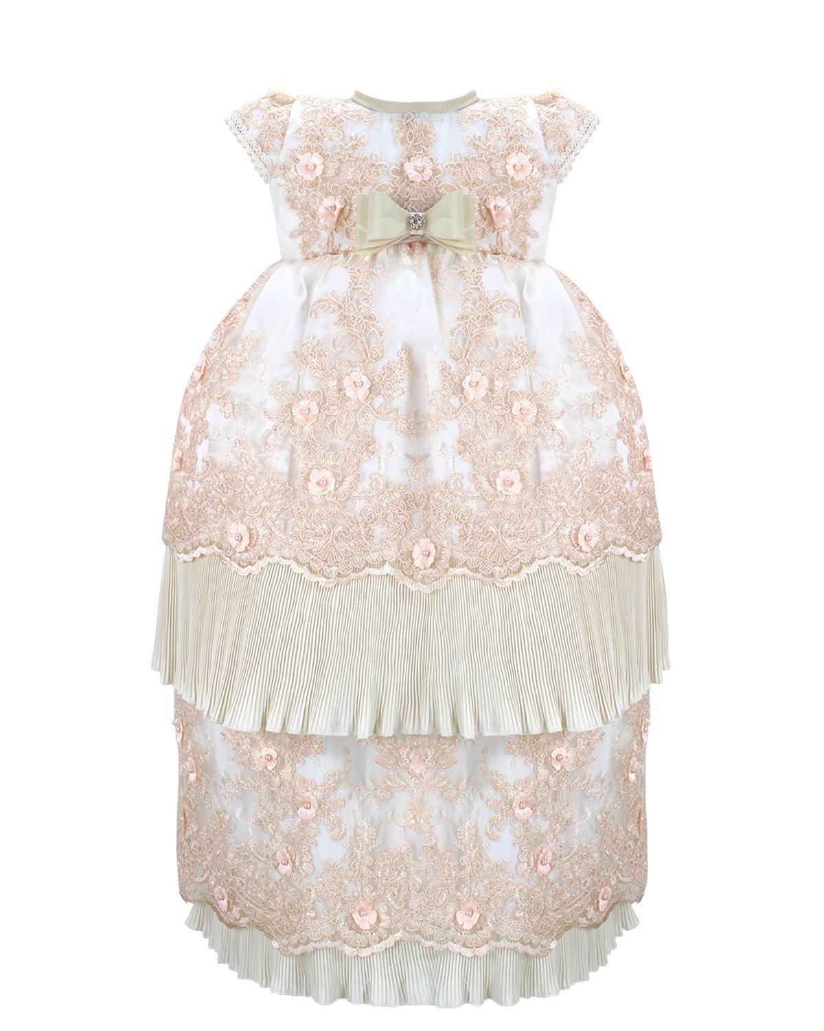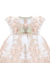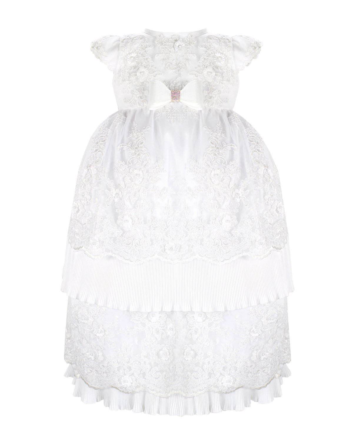 The christening gown for girls, model Melany, from the exclusive Maylin brand, is an exceptional choice for a special day. Crafted with luxurious shantung and delicate lining, it guarantees comfort and sophistication. The adorned guipure and detailed floral ornamentation make this gown unique and charming, ensuring your little girl looks dazzling on her christening day.
