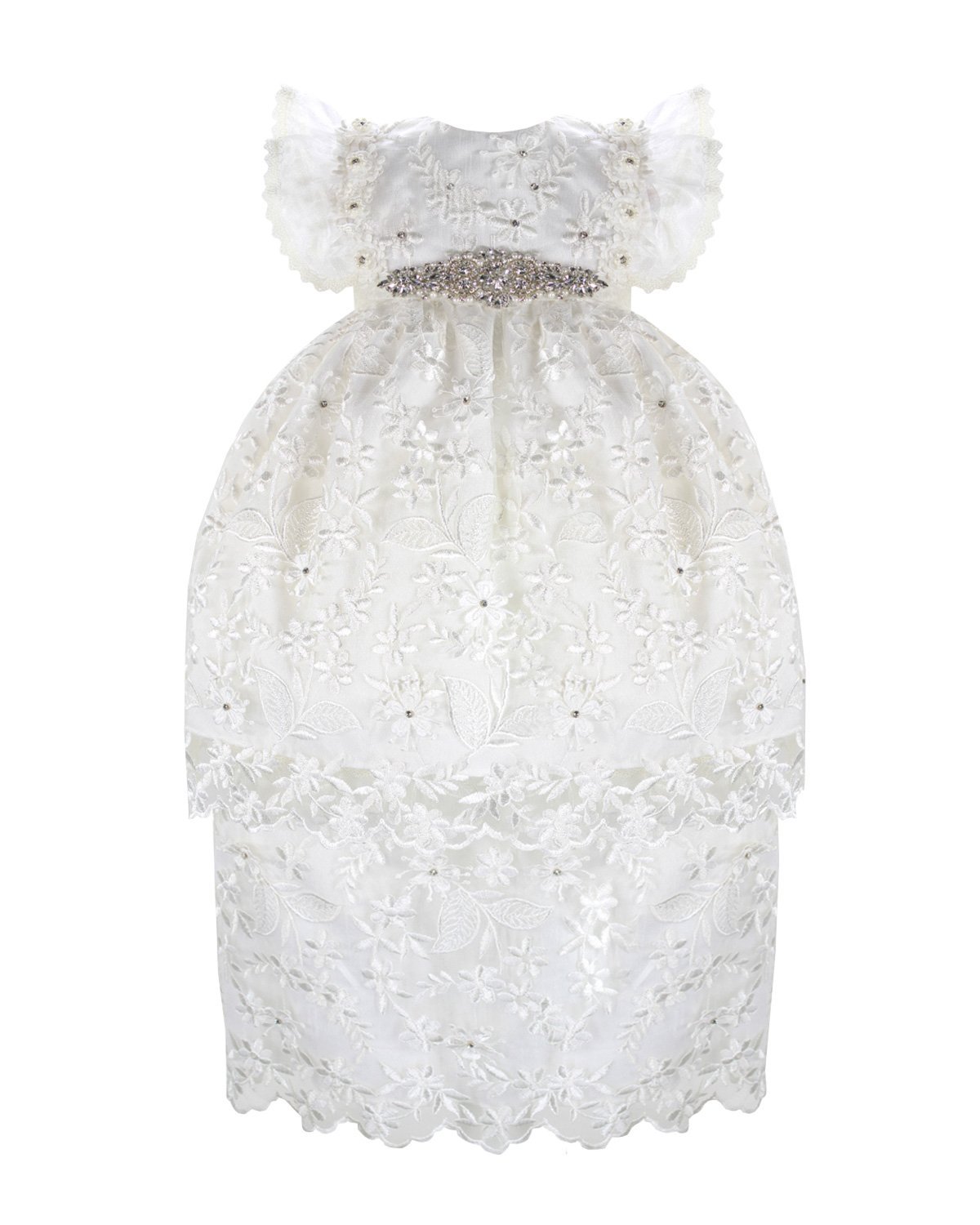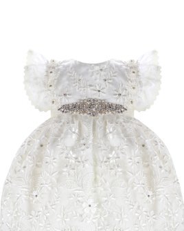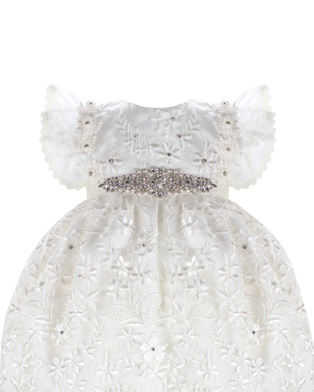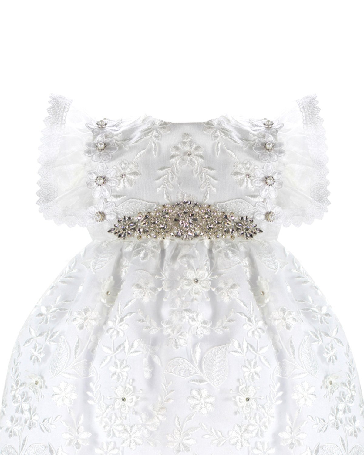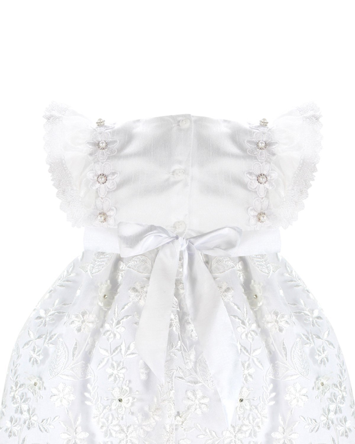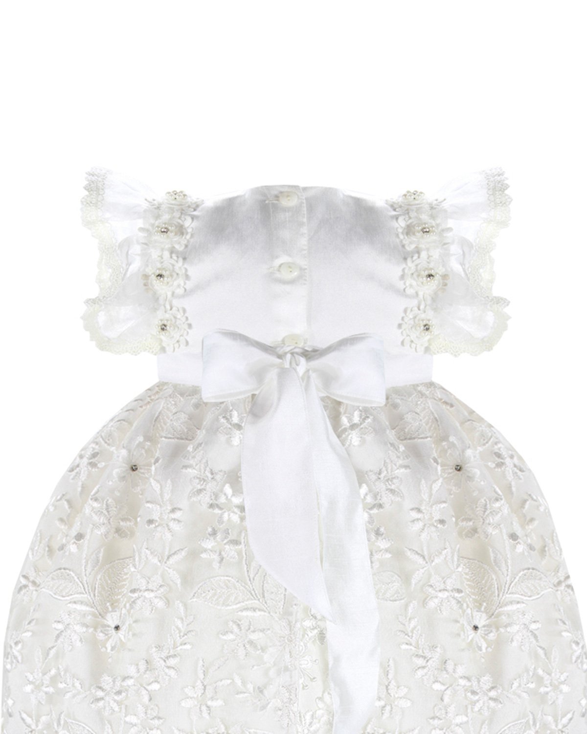 "Maylin's Mariel Girl's Gown is a dreamy piece that will capture all attention. Crafted in shantung, this gown features a blouse with 3D flower and scroll embroideries, enhanced with pearls and rhinestones at the center, sleeves with ruffles and edge embroidery, and a cluster of 3D flowers entirely crafted in zirconia. The skirt showcases exquisite 3D flower embroideries with zirconia centers for an additional touch of glamour. Complete with back buttons and a slightly slim adjustable bow, this gown is the perfect choice to stand out at any occasion."